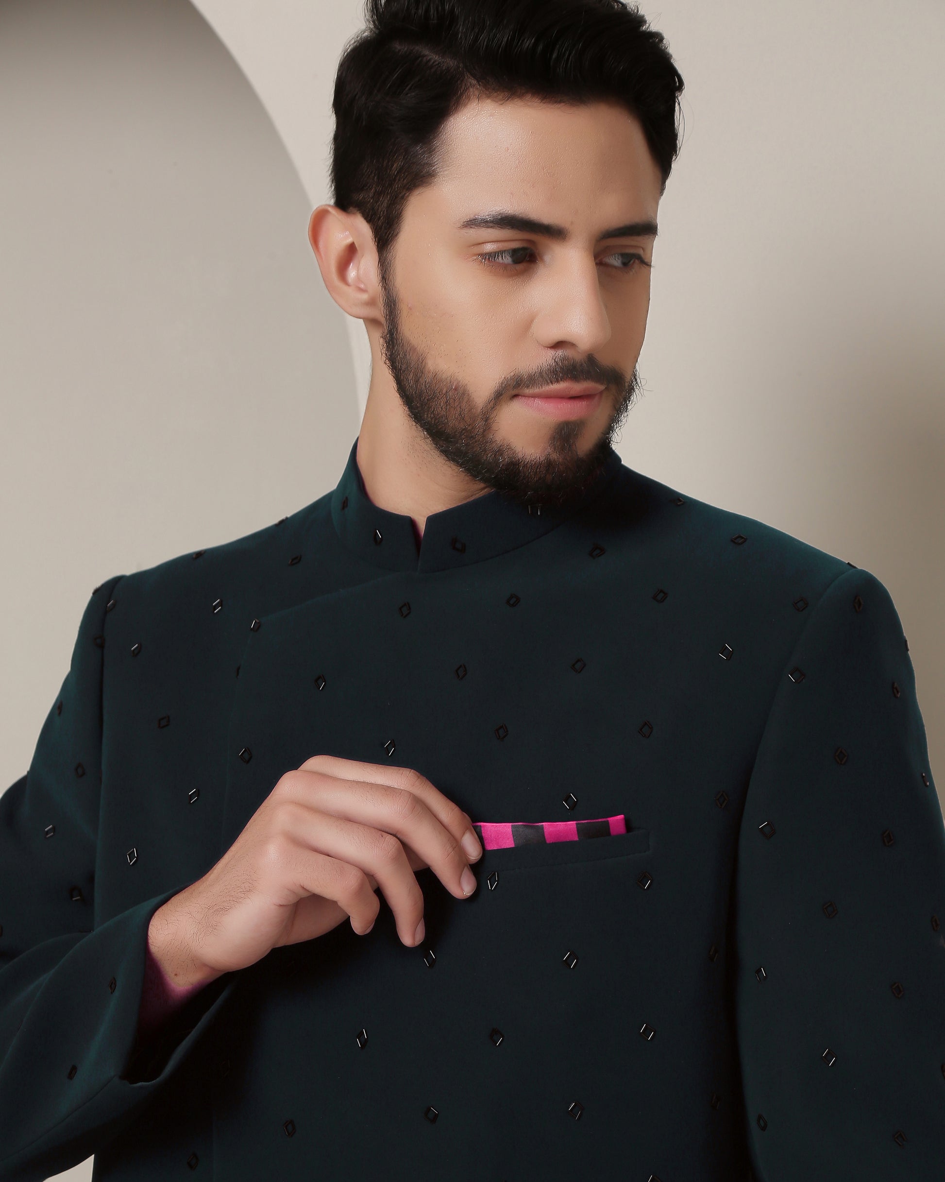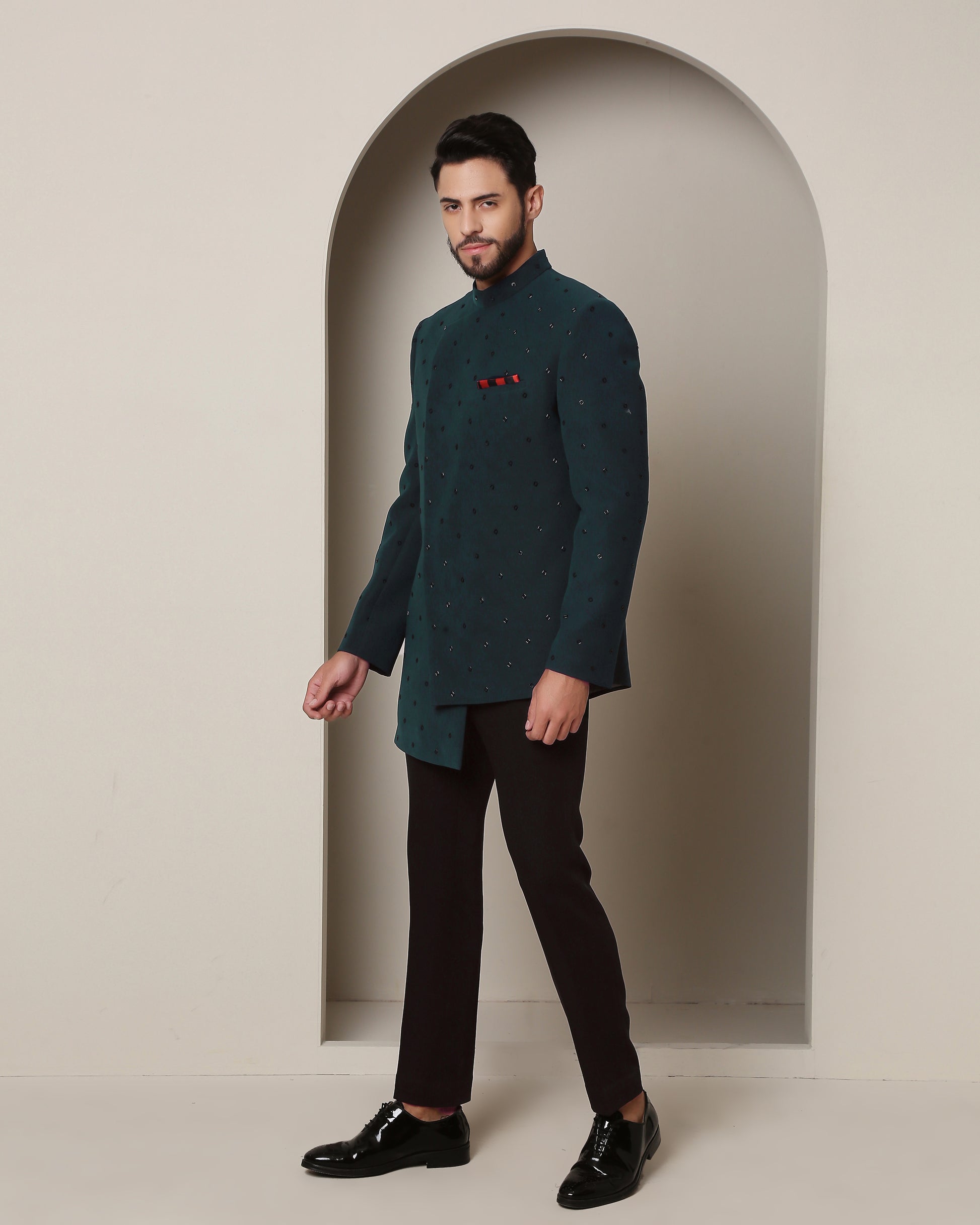 Teal Angrakha-style bandhgala with asymmetrical hem. Enhanced by sleek black shiny embroidery. Paired elegantly with matching trousers for refined charm.