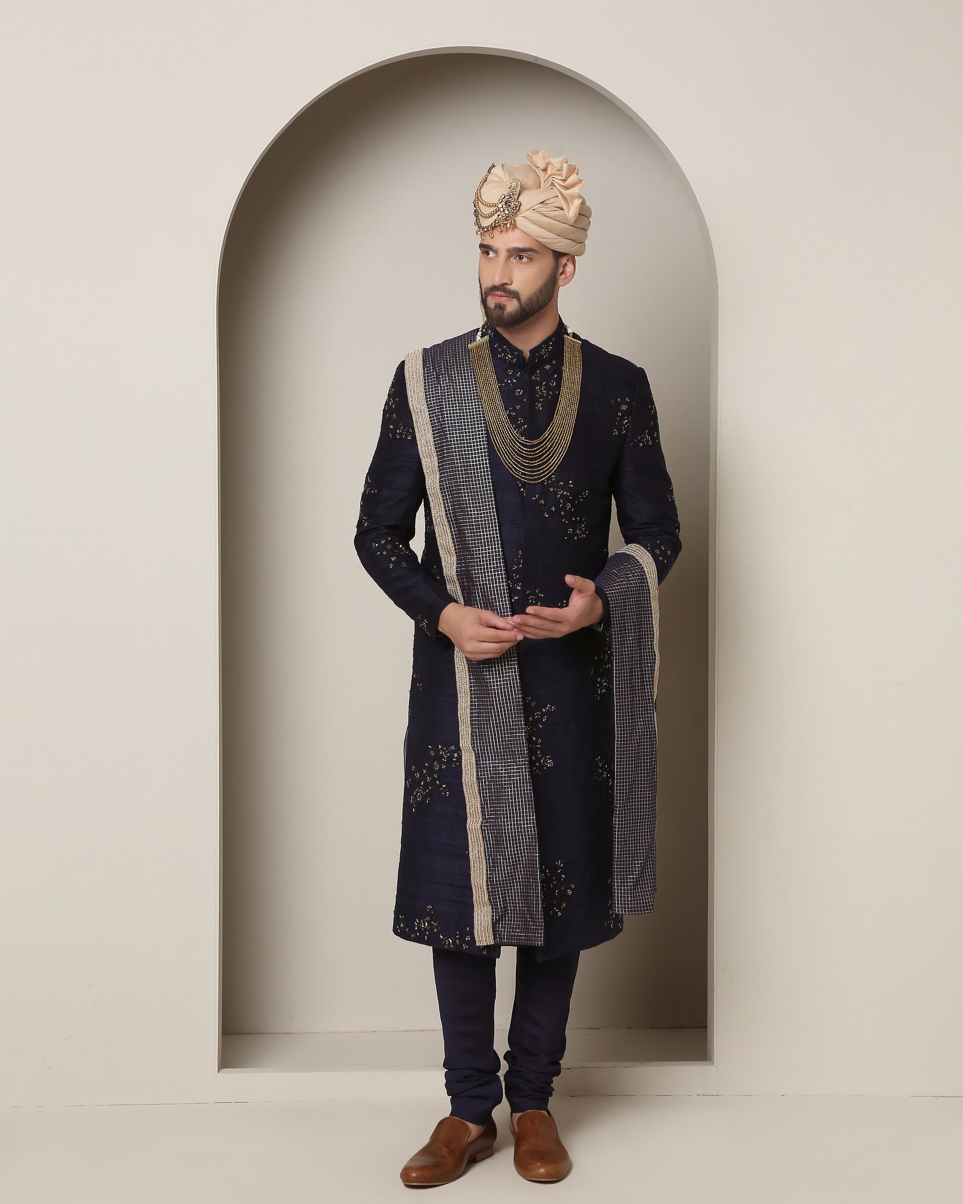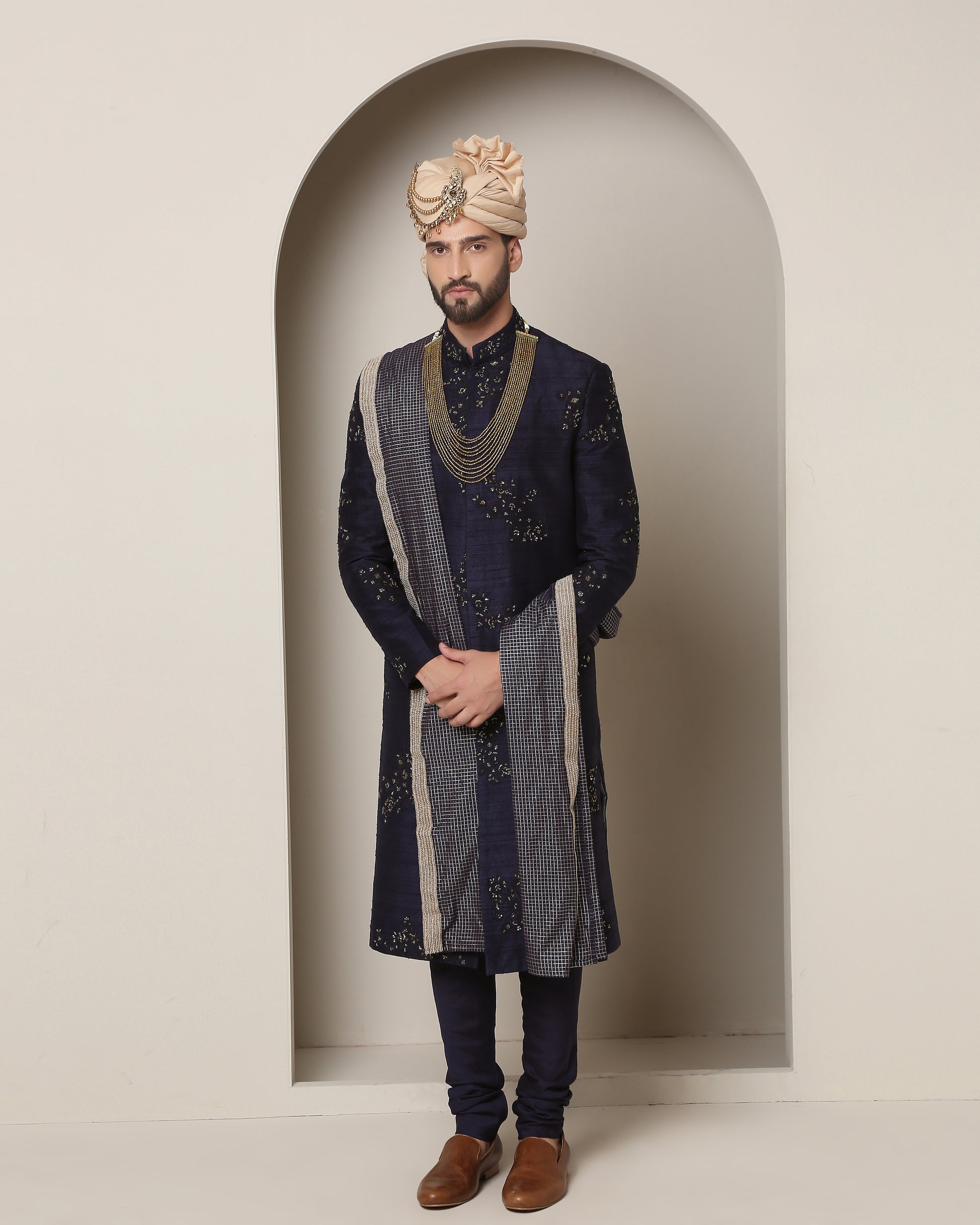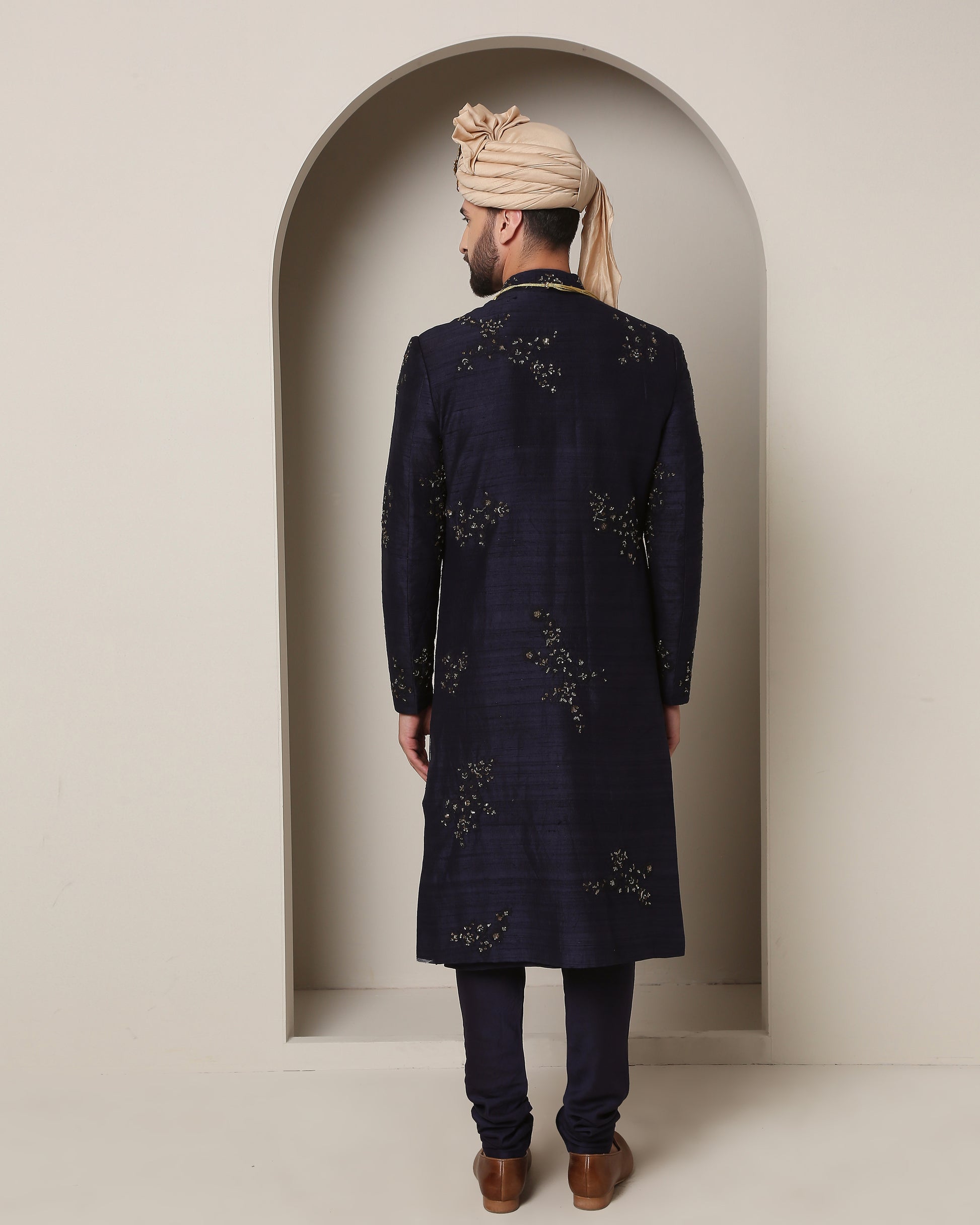 Regal royal blue handwoven silk sherwani, adorned with harmonizing thread embroidery and opulent gold accents. A classic epitome of timeless elegance and refined grandeur.