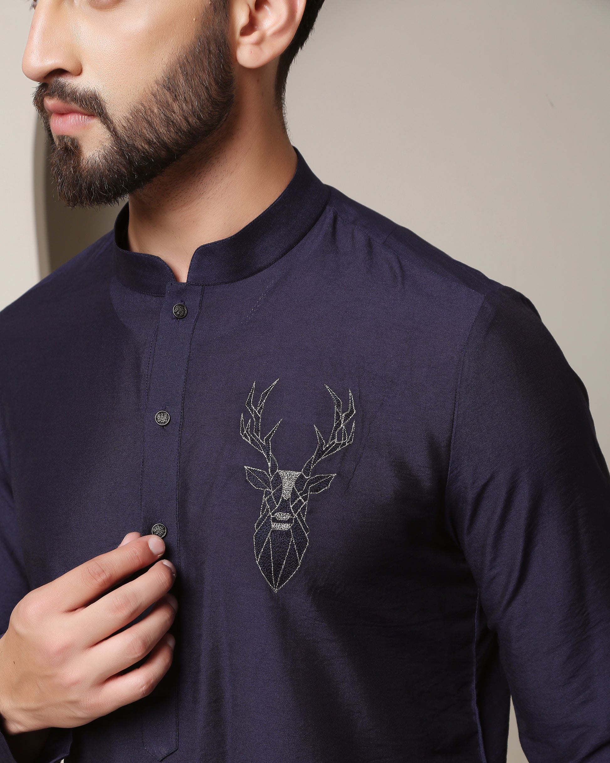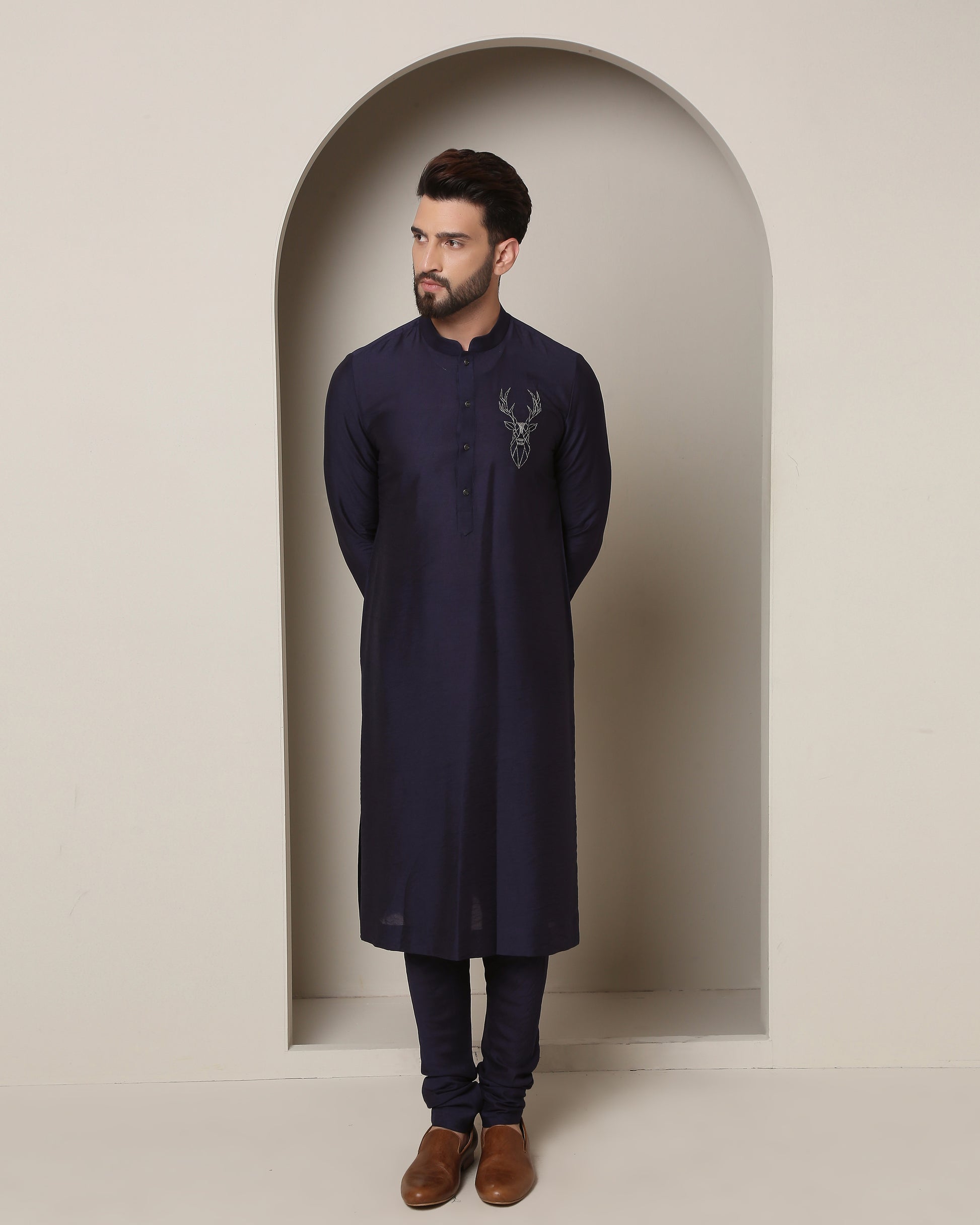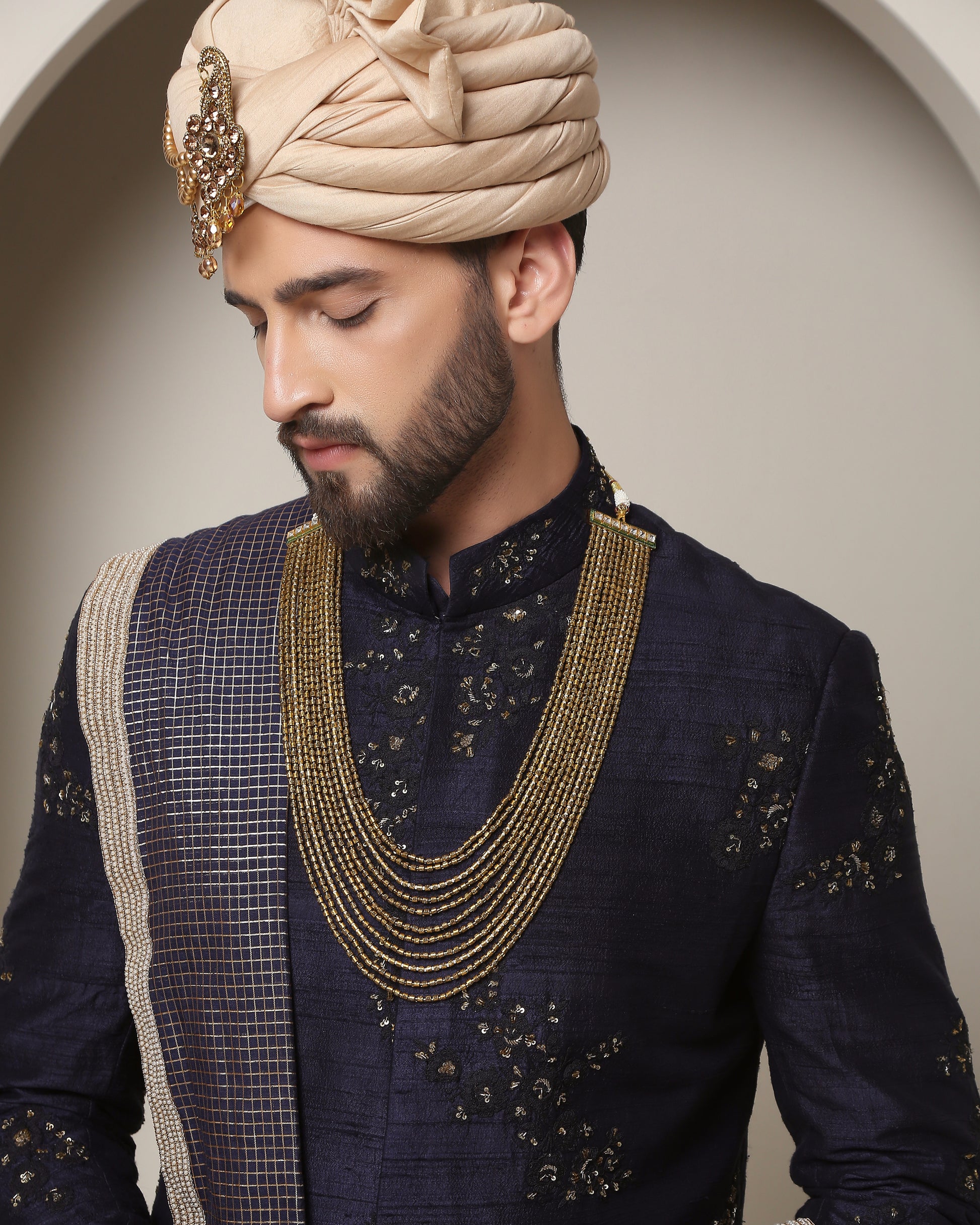 Regal royal blue handwoven silk sherwani, adorned with harmonizing thread embroidery and opulent gold accents. A classic epitome of timeless elegance and refined grandeur.
