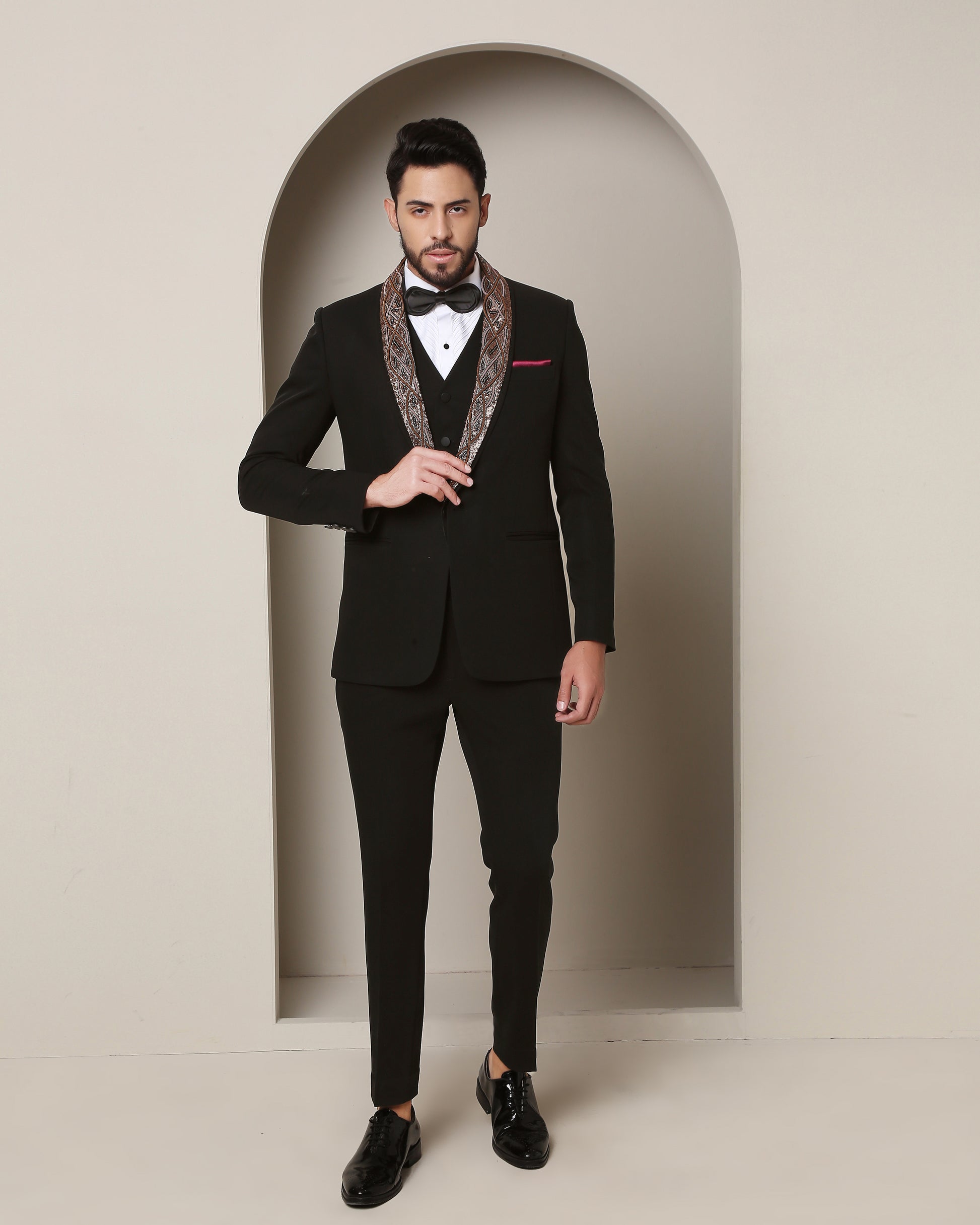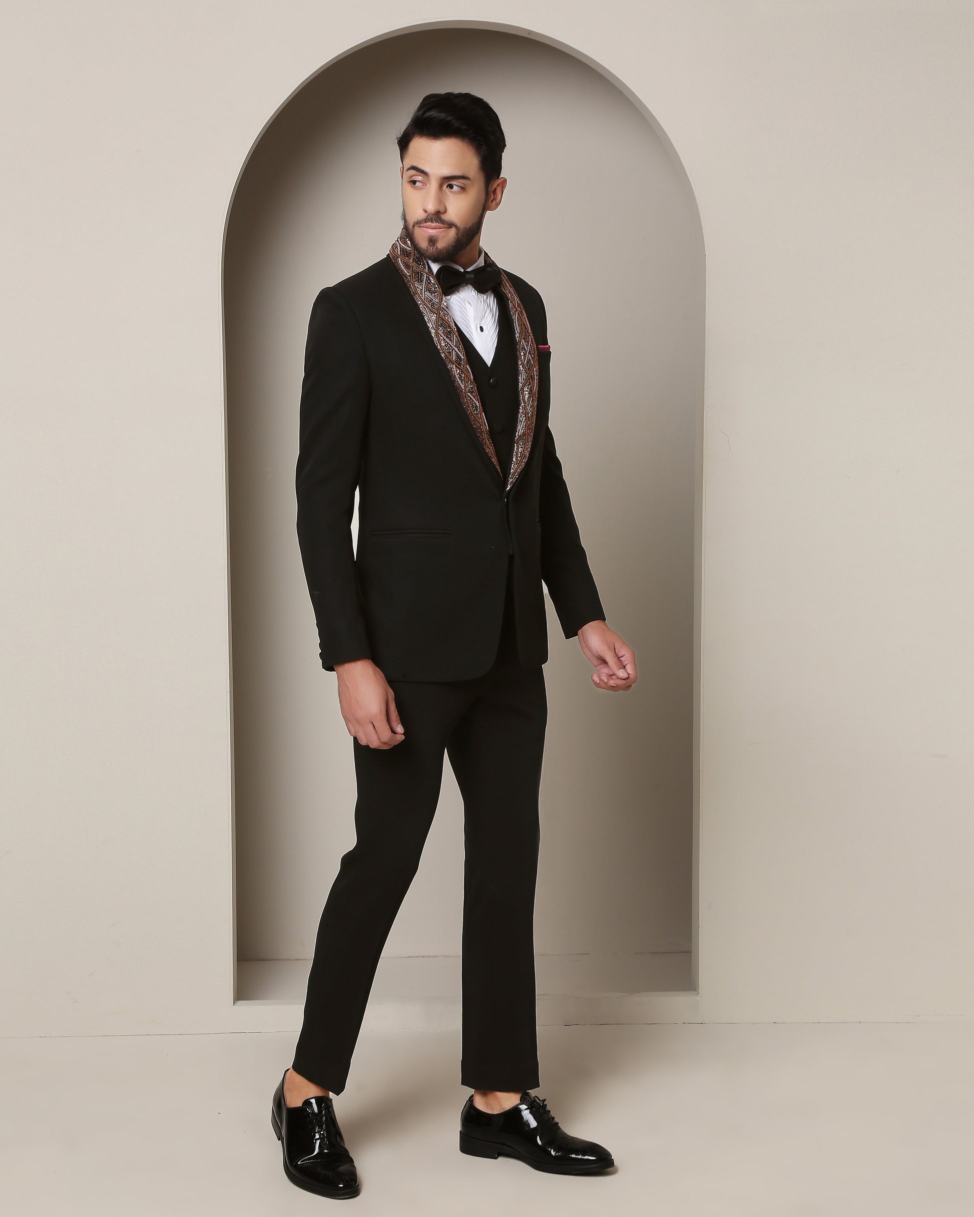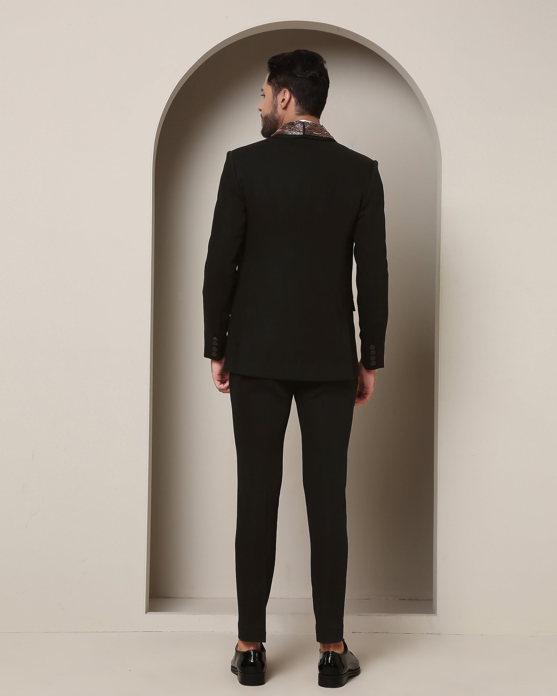 Twilight's Embrace Tuxedo: Black elegance envelops, while a removable embroidered lapel, a rugged metallic tableau of wire and rust, crowns the steadfast peak lapel, fusing allure with artistry."
