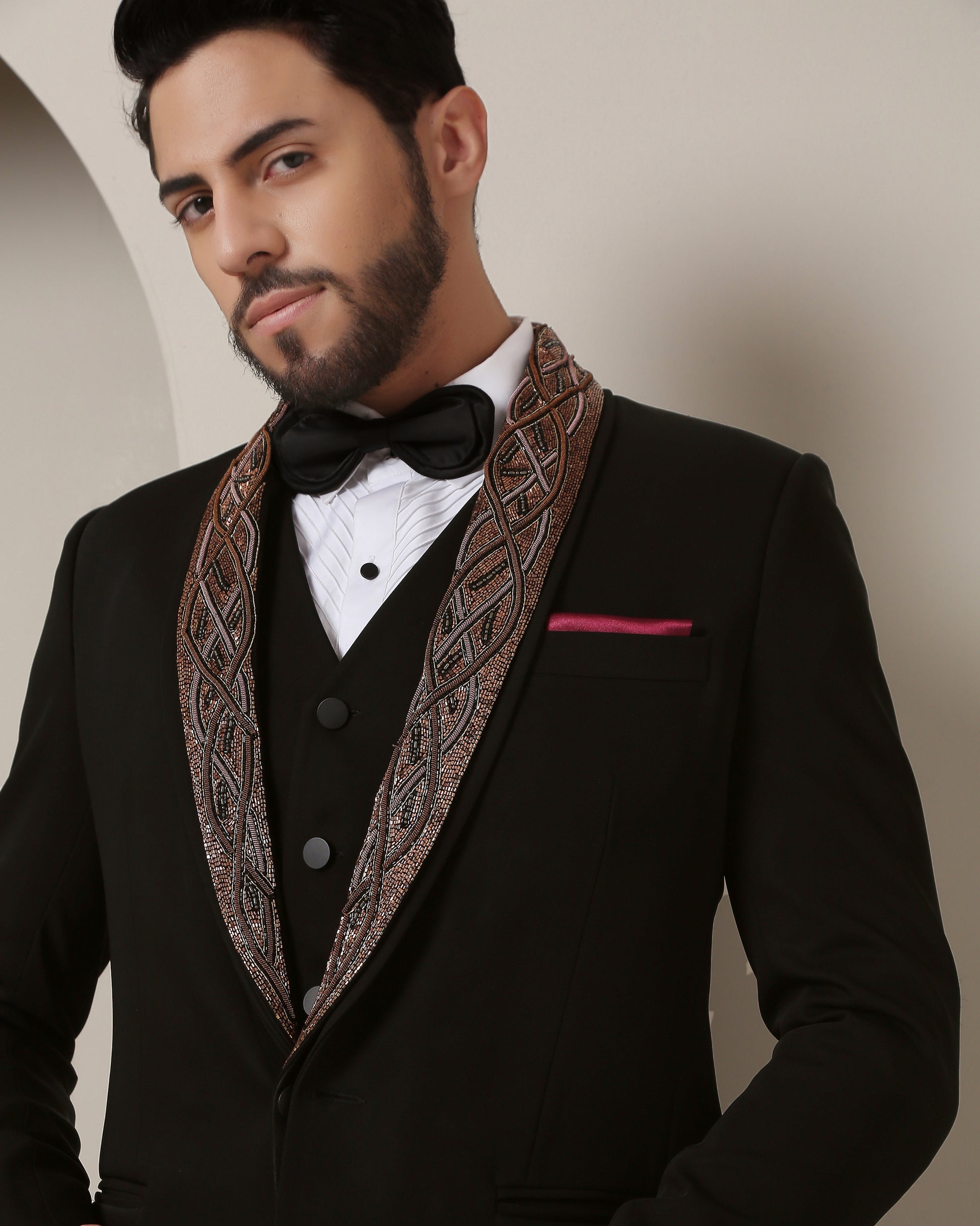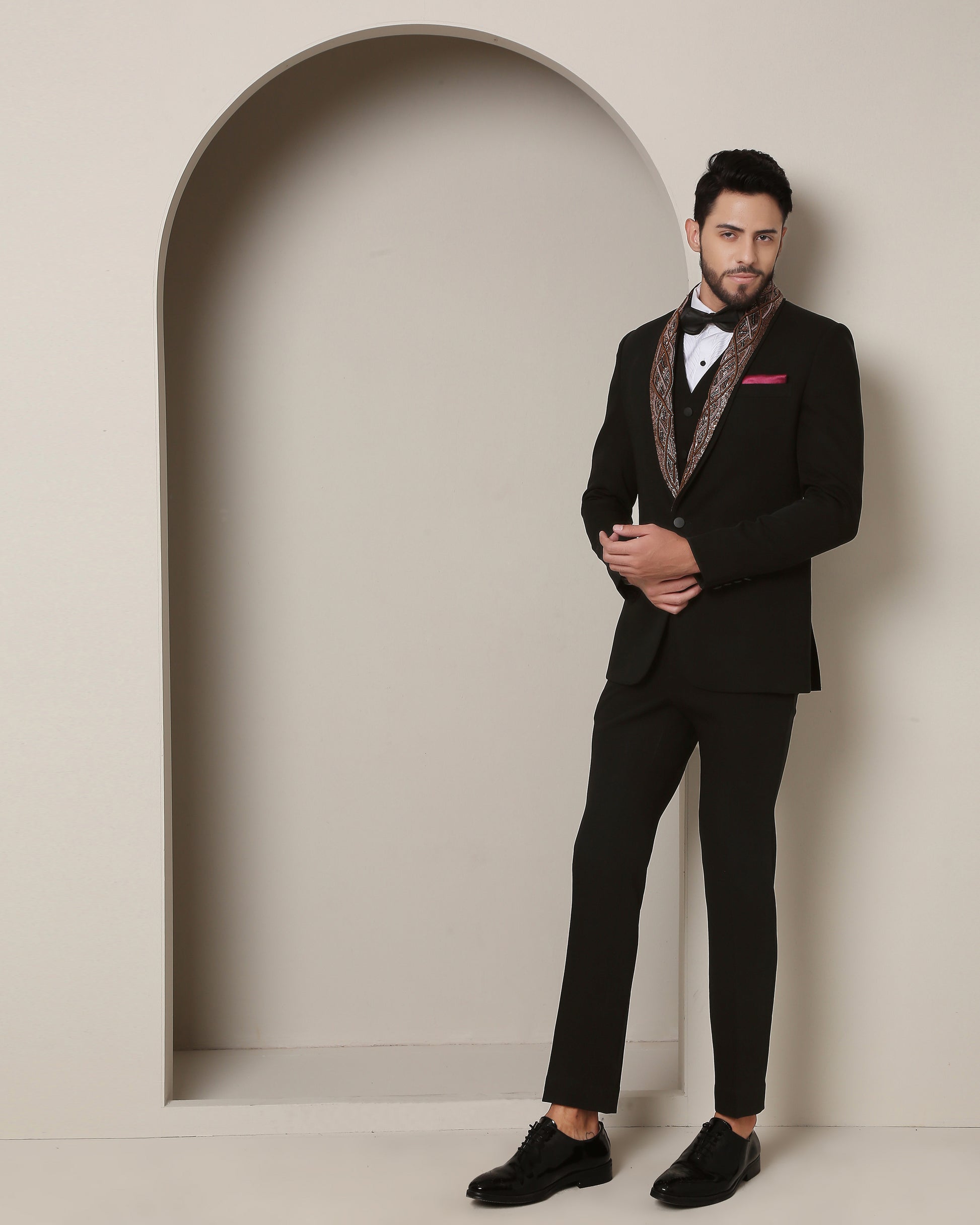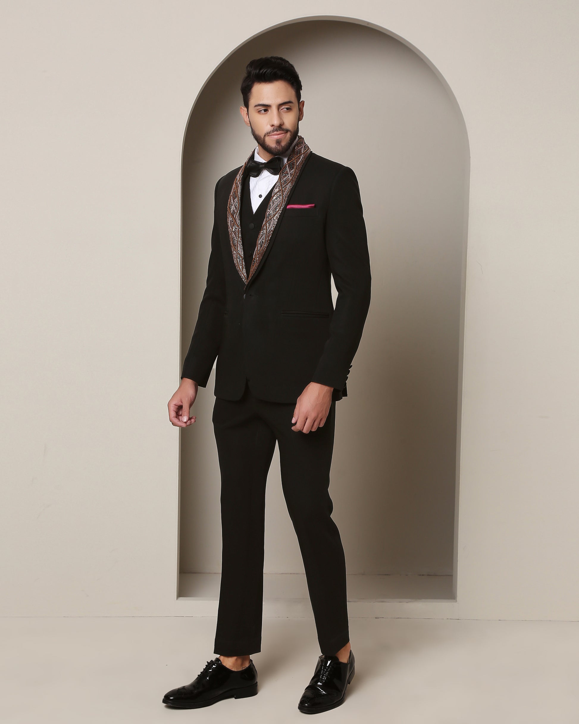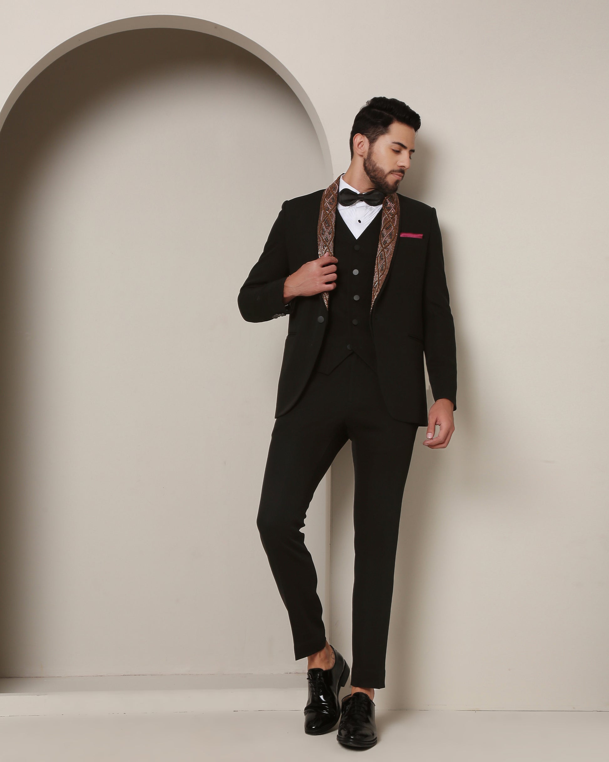 Twilight's Embrace Tuxedo: Black elegance envelops, while a removable embroidered lapel, a rugged metallic tableau of wire and rust, crowns the steadfast peak lapel, fusing allure with artistry."