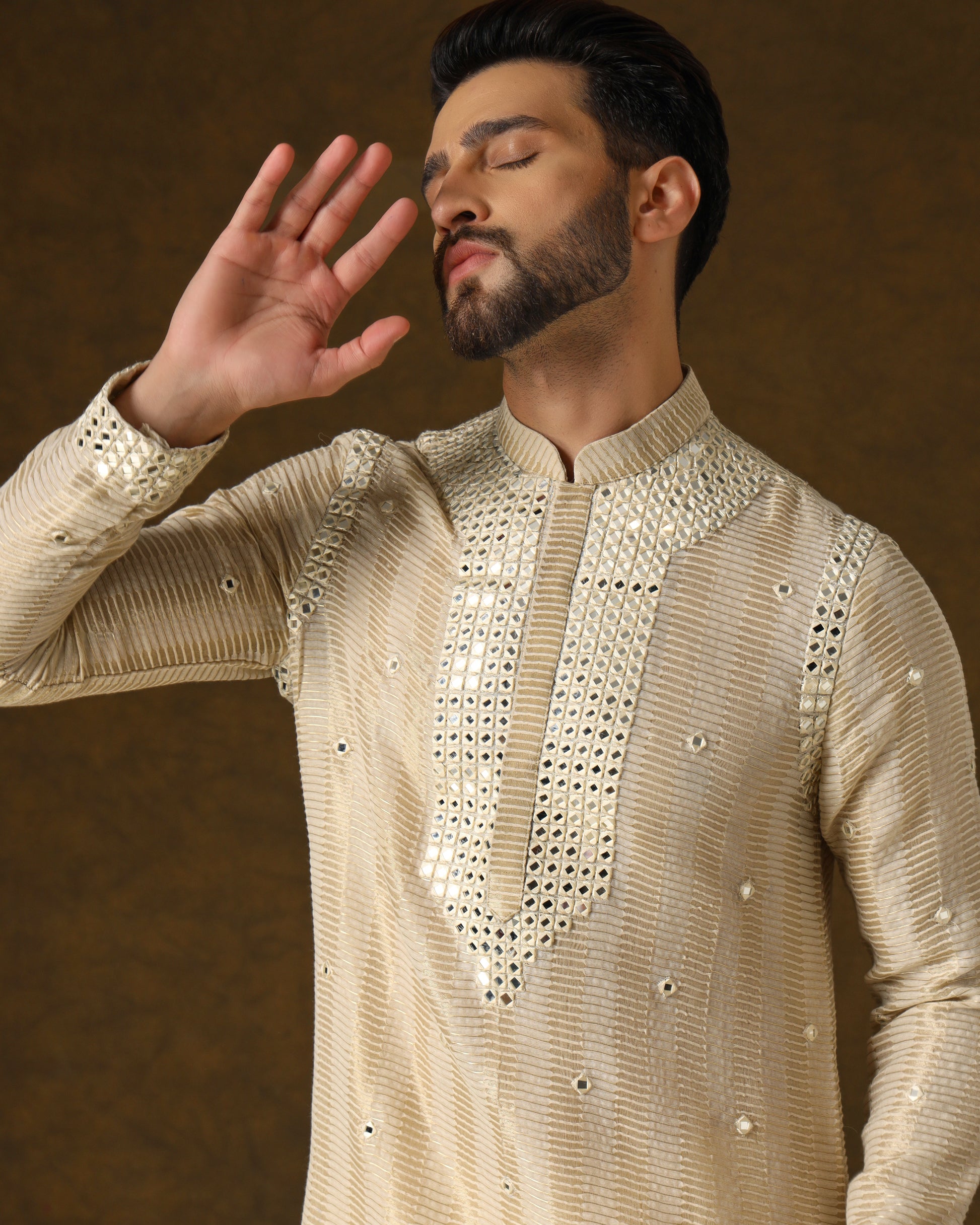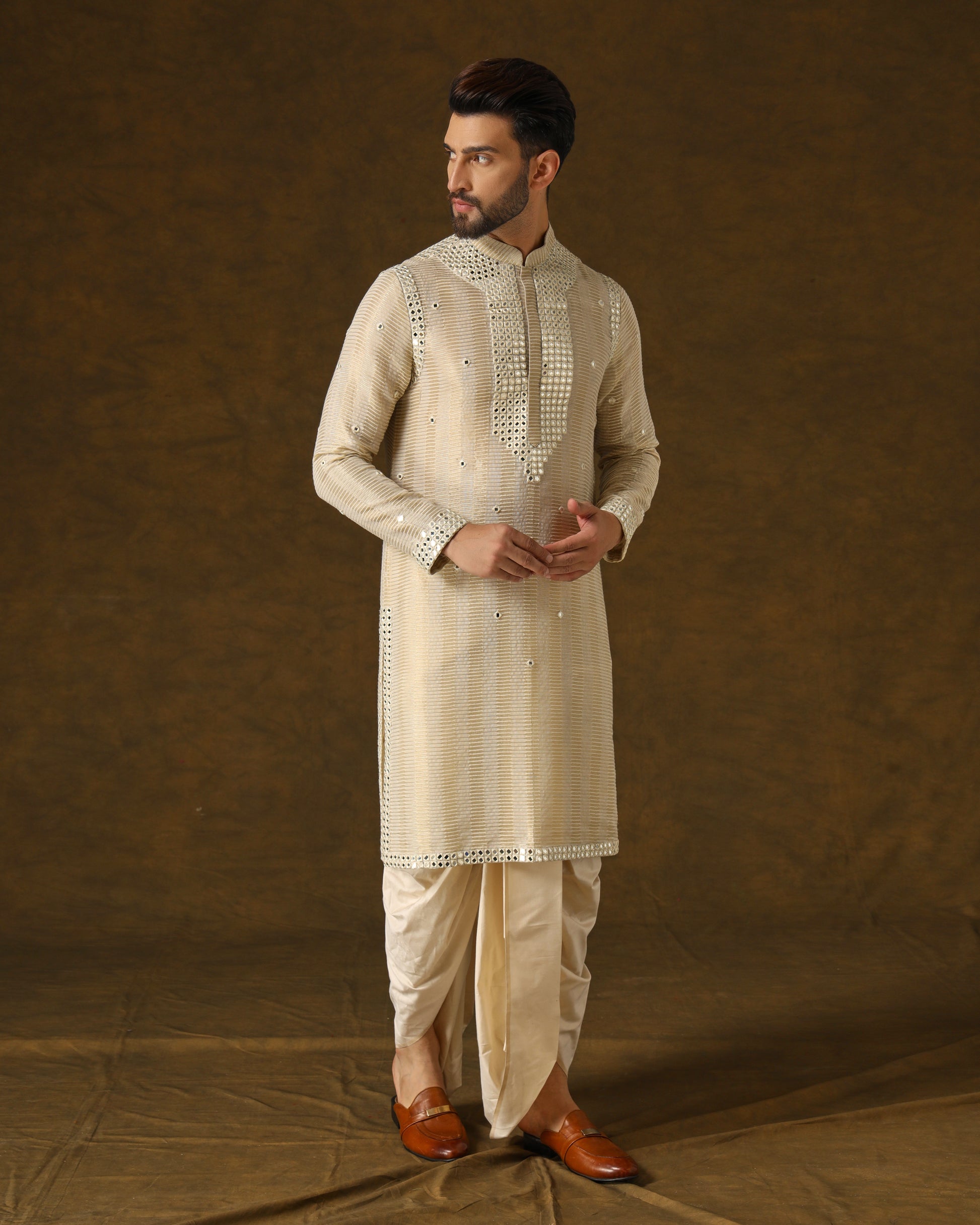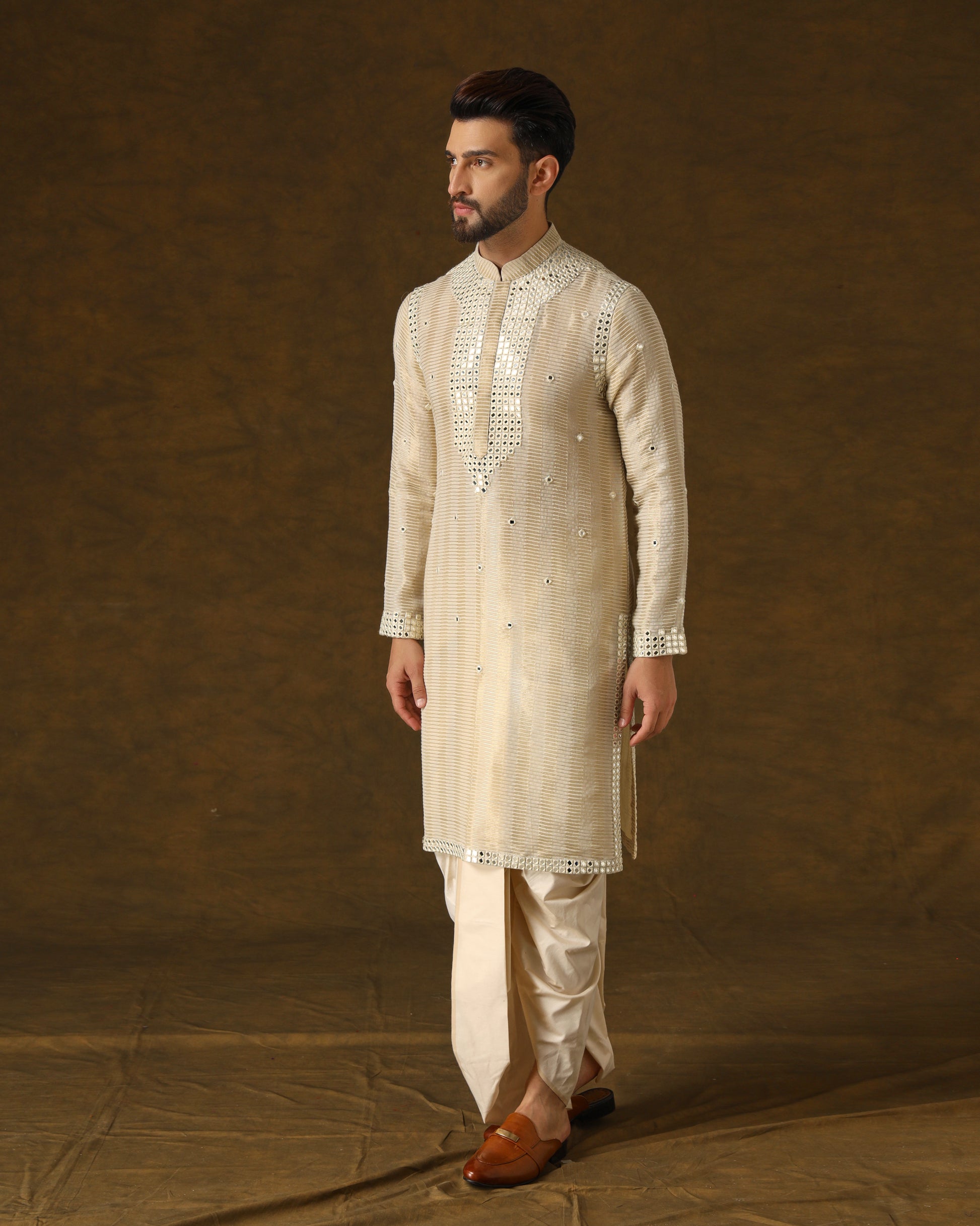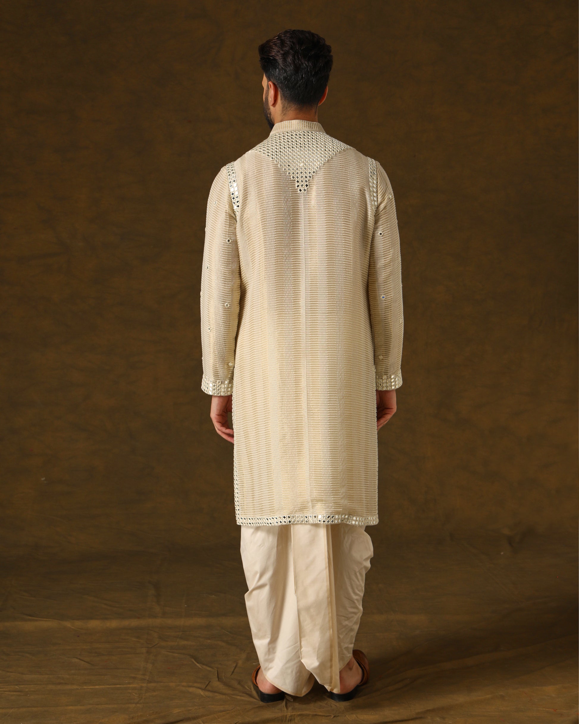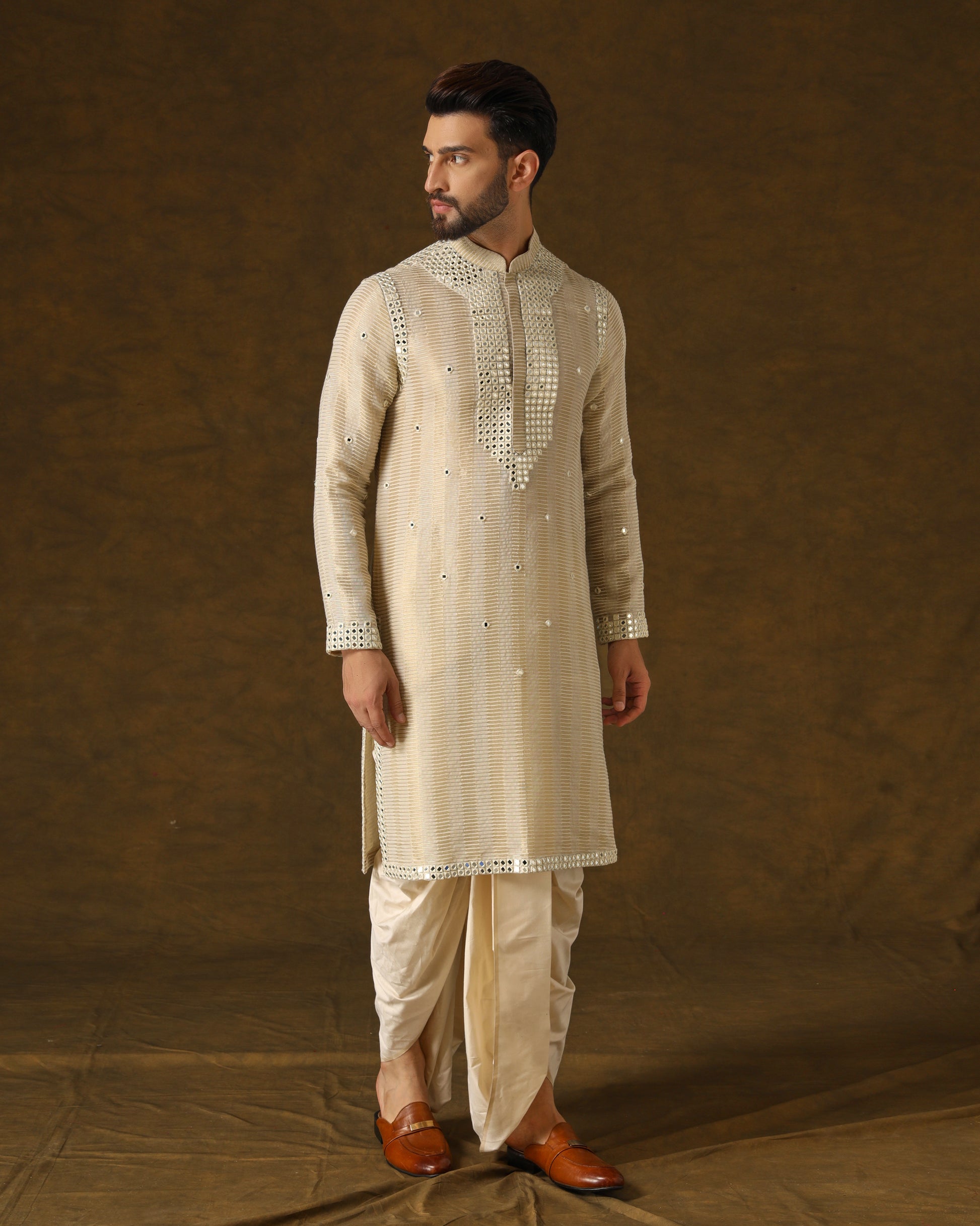 Luxurious handwoven silk kurta, adorned with intricate mirror work in ivory threads on placket, sleeves, shoulders, and back. Perfectly complemented by a traditional dhoti, epitomizing opulent elegance