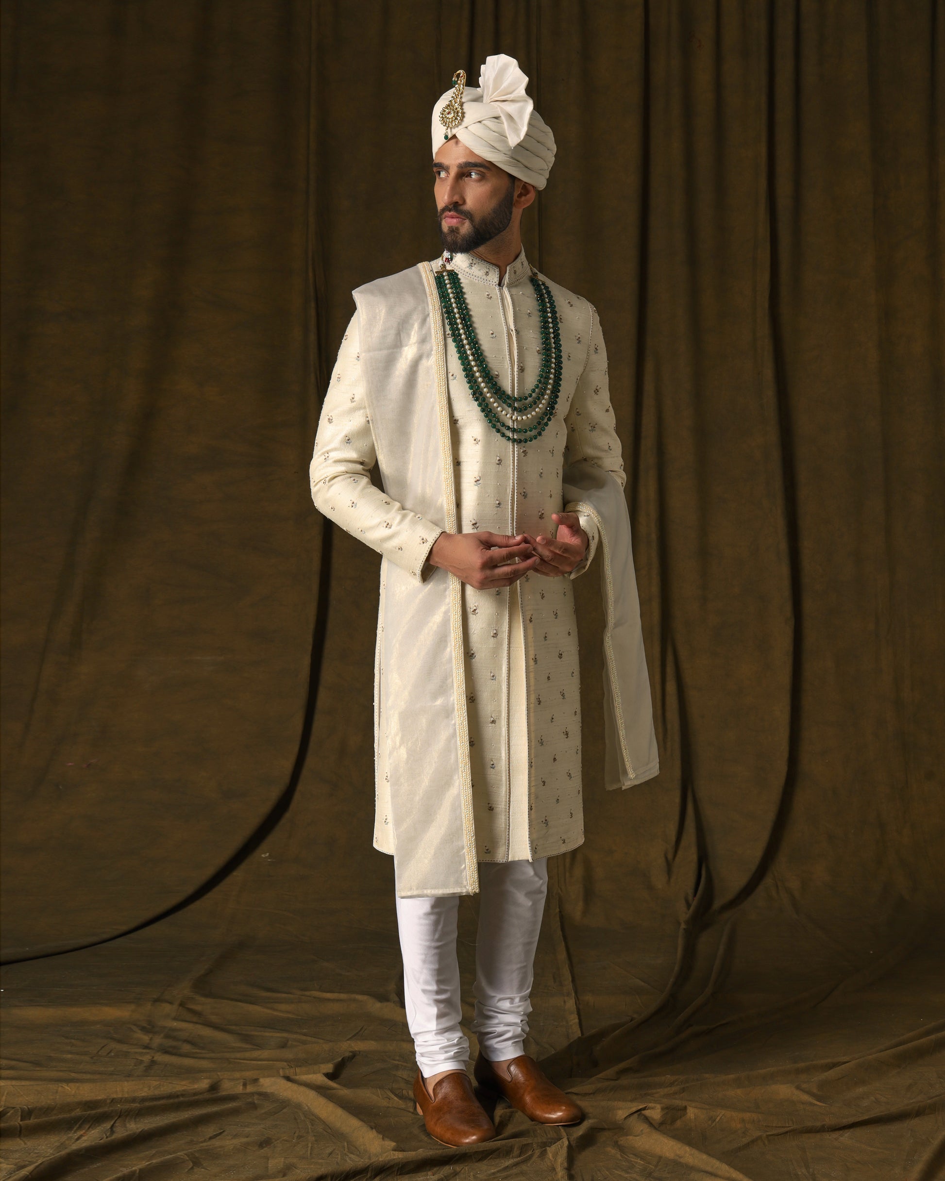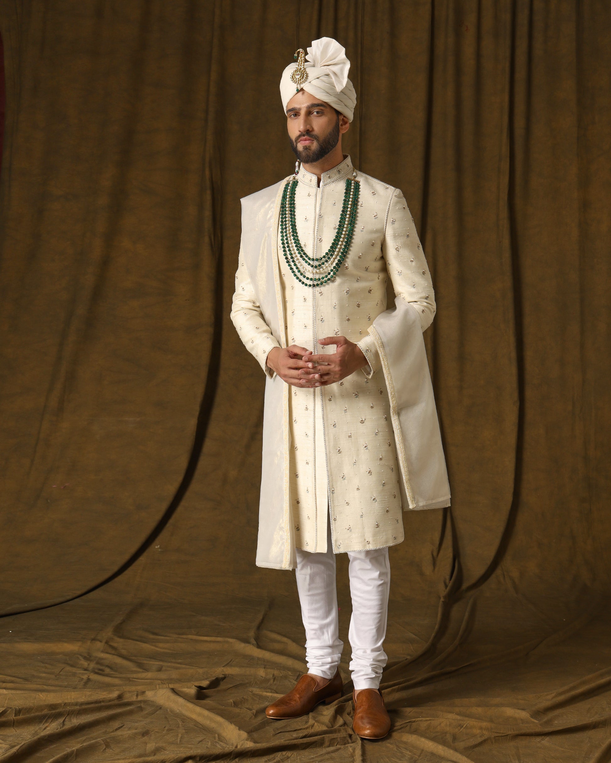 Pearl ivory sherwani, vine motifs, shimmering elegance