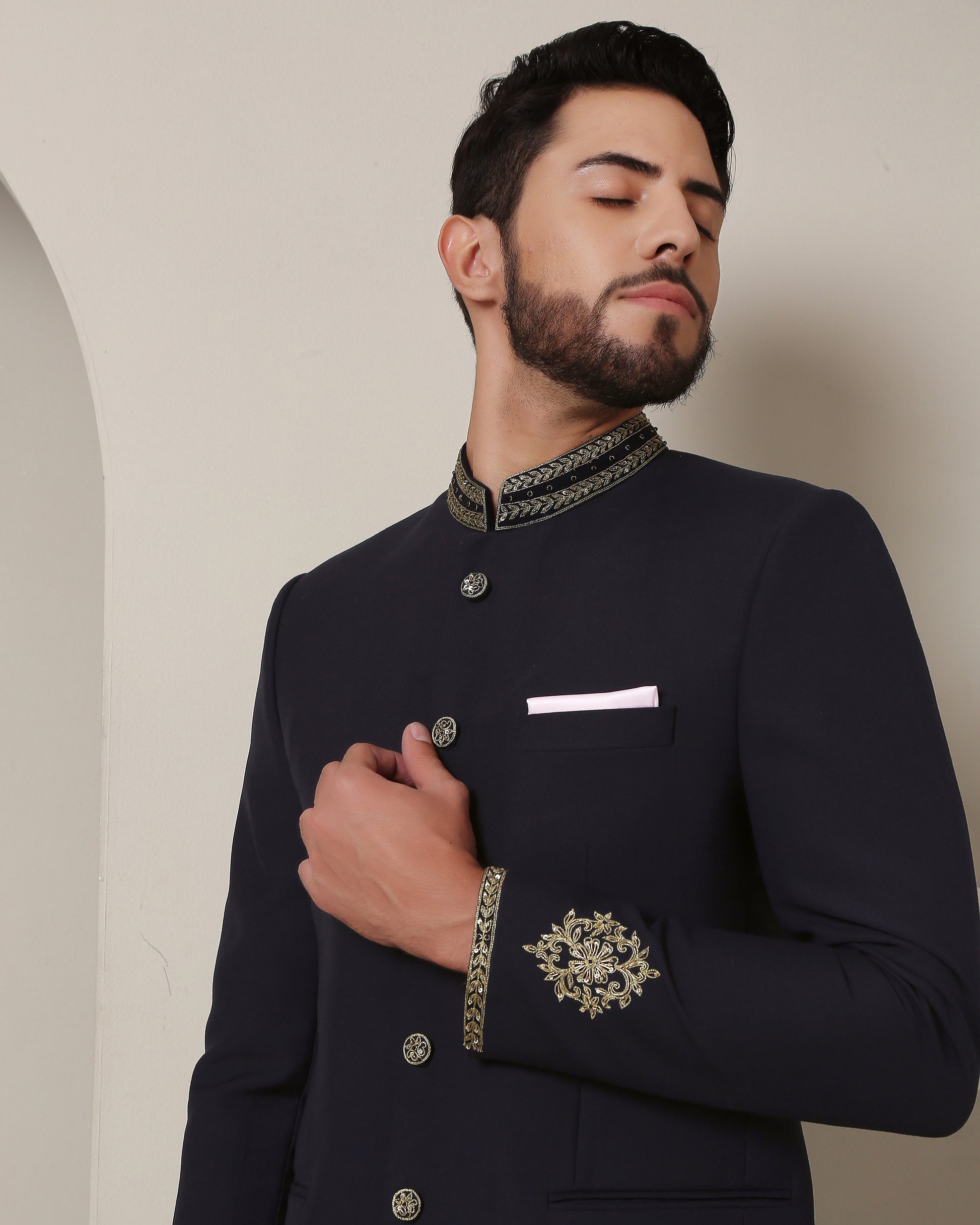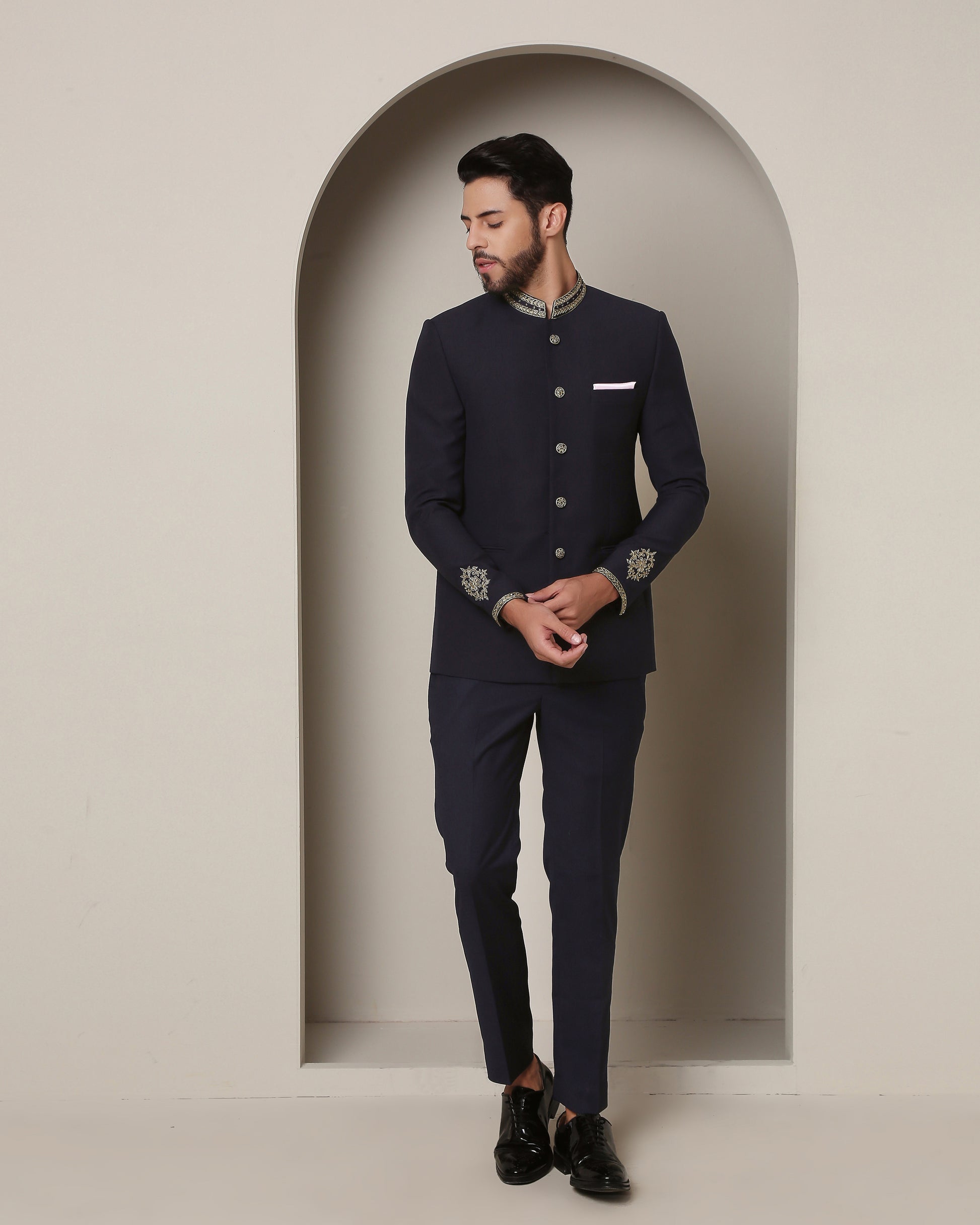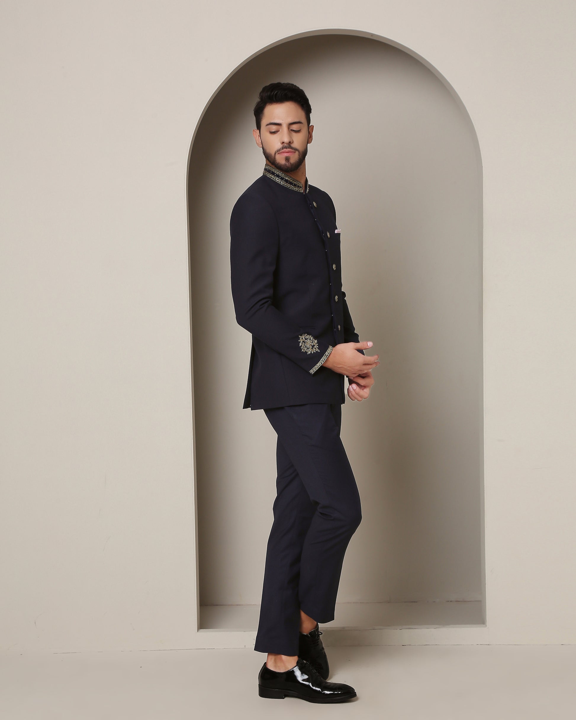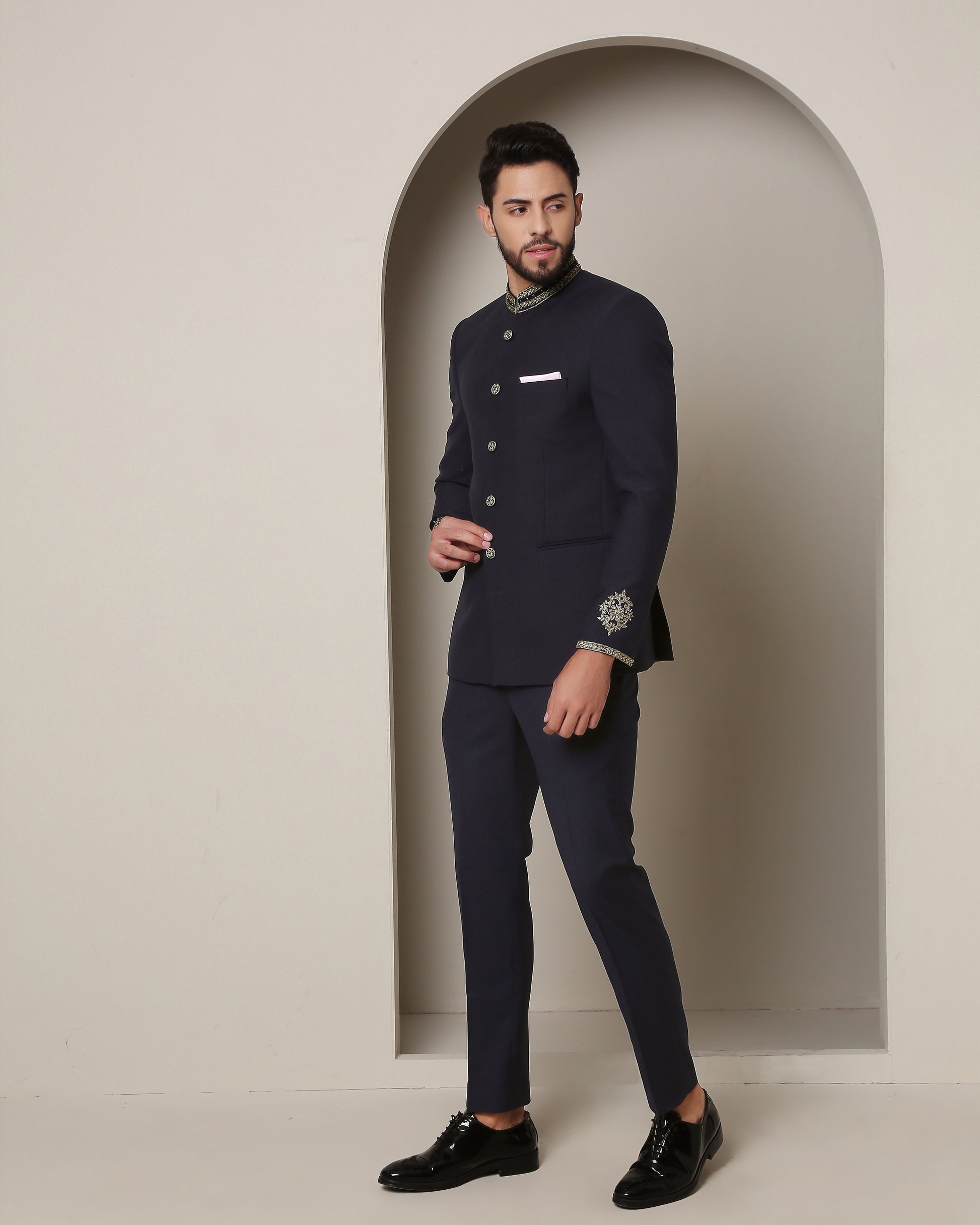 Indulge in navy sophistication with this bandgala. Gold zardozi-adorned collar and buttons exude opulence, while intricate sleeve bootas add regal charm, creating an ensemble of timeless elegance.
