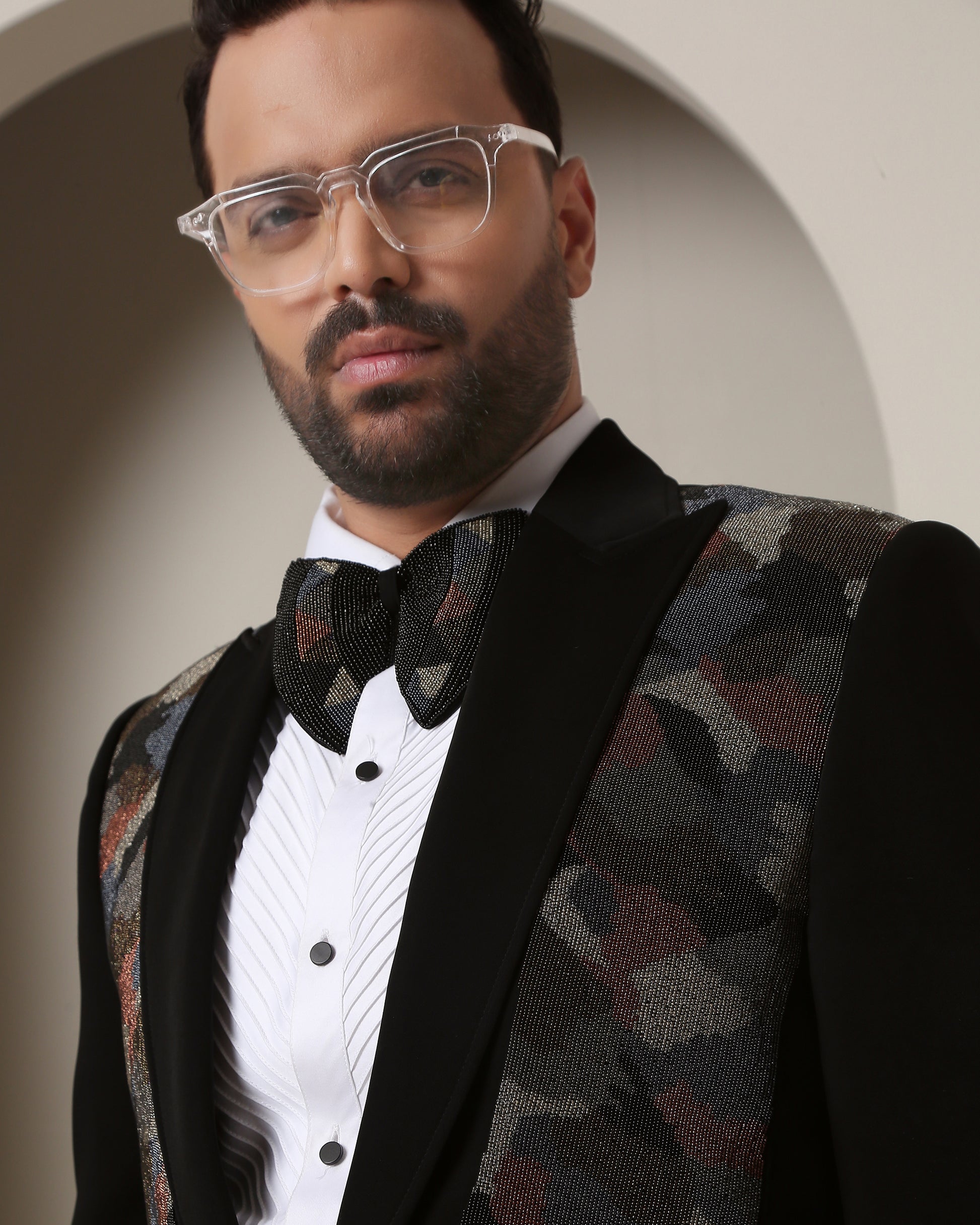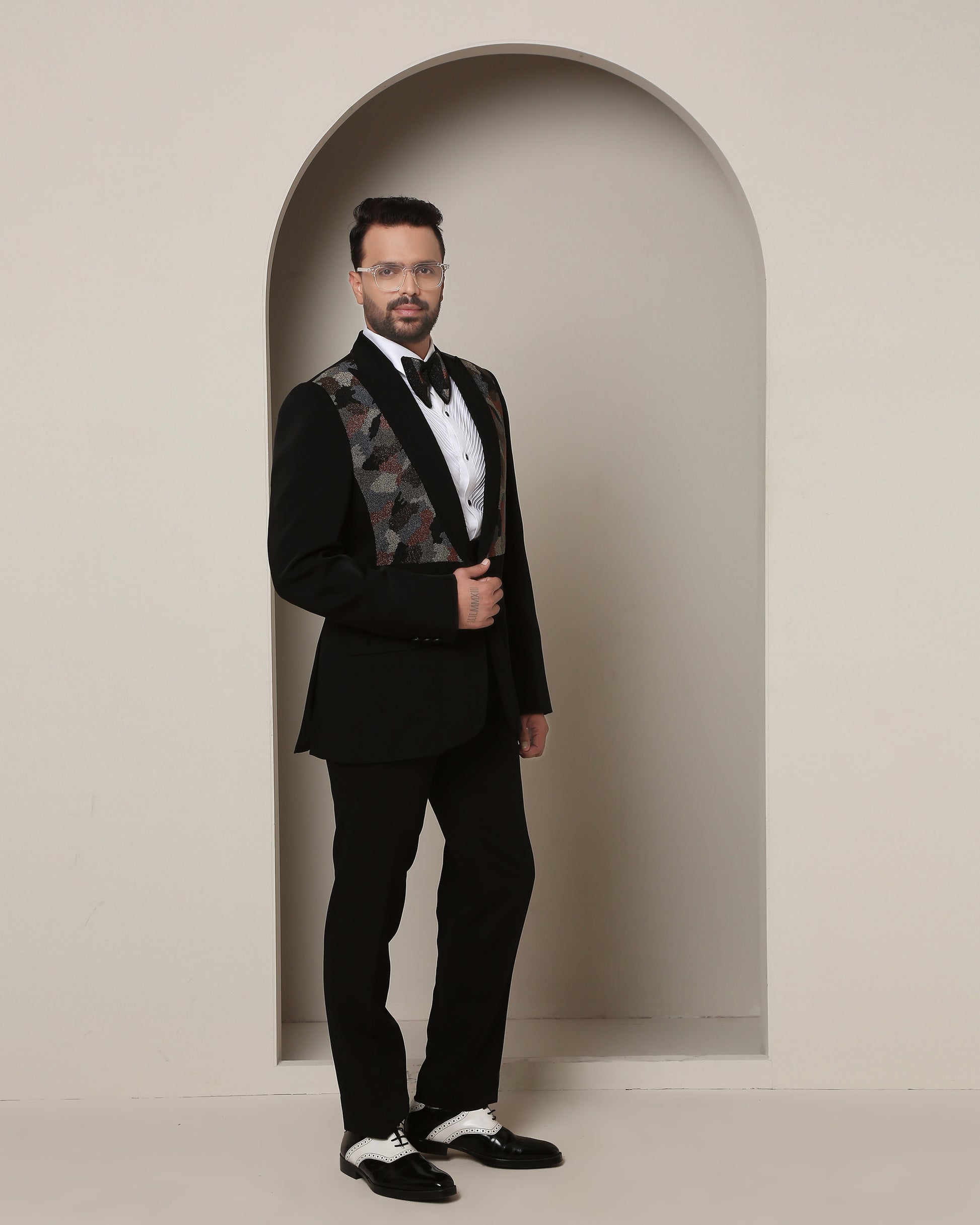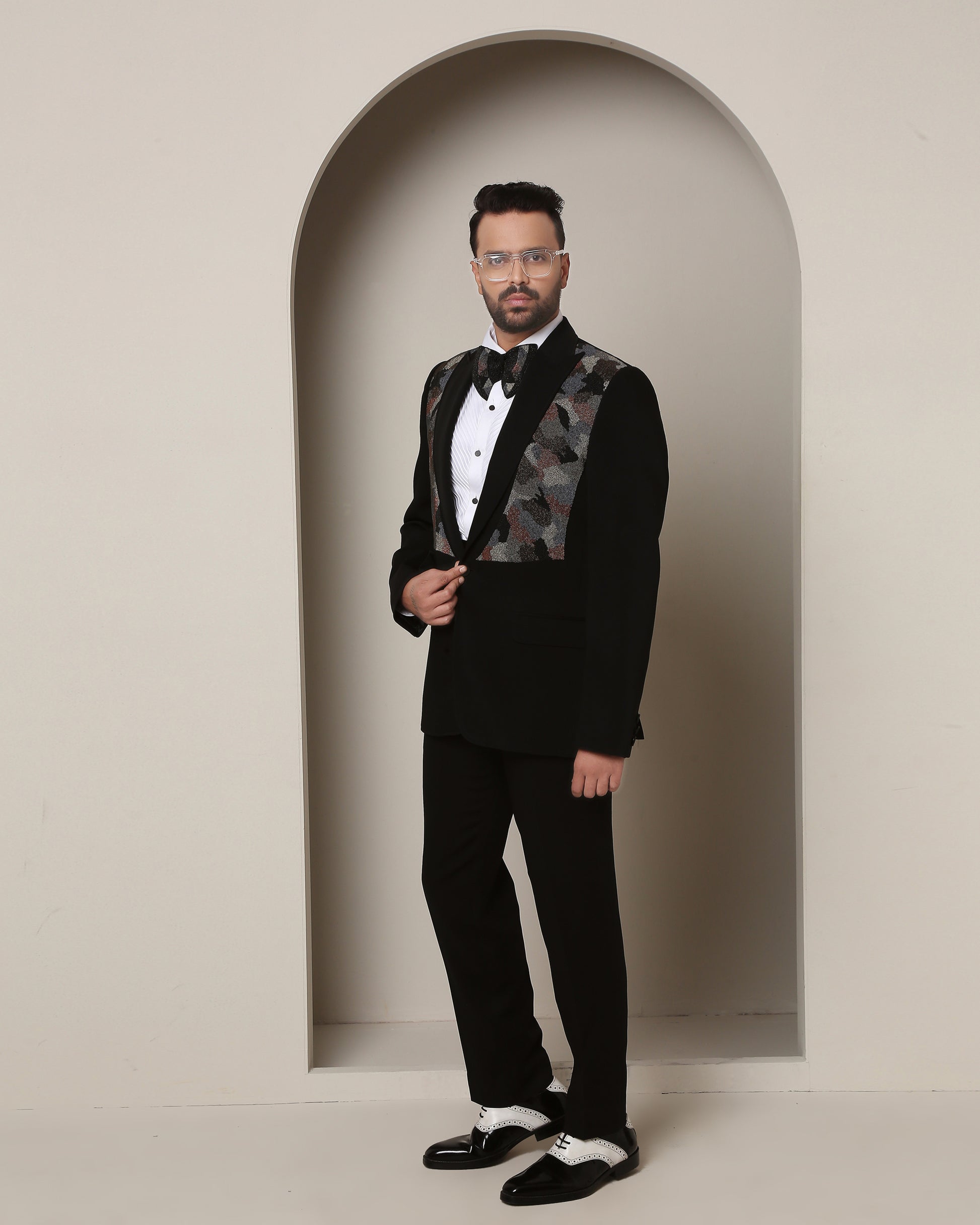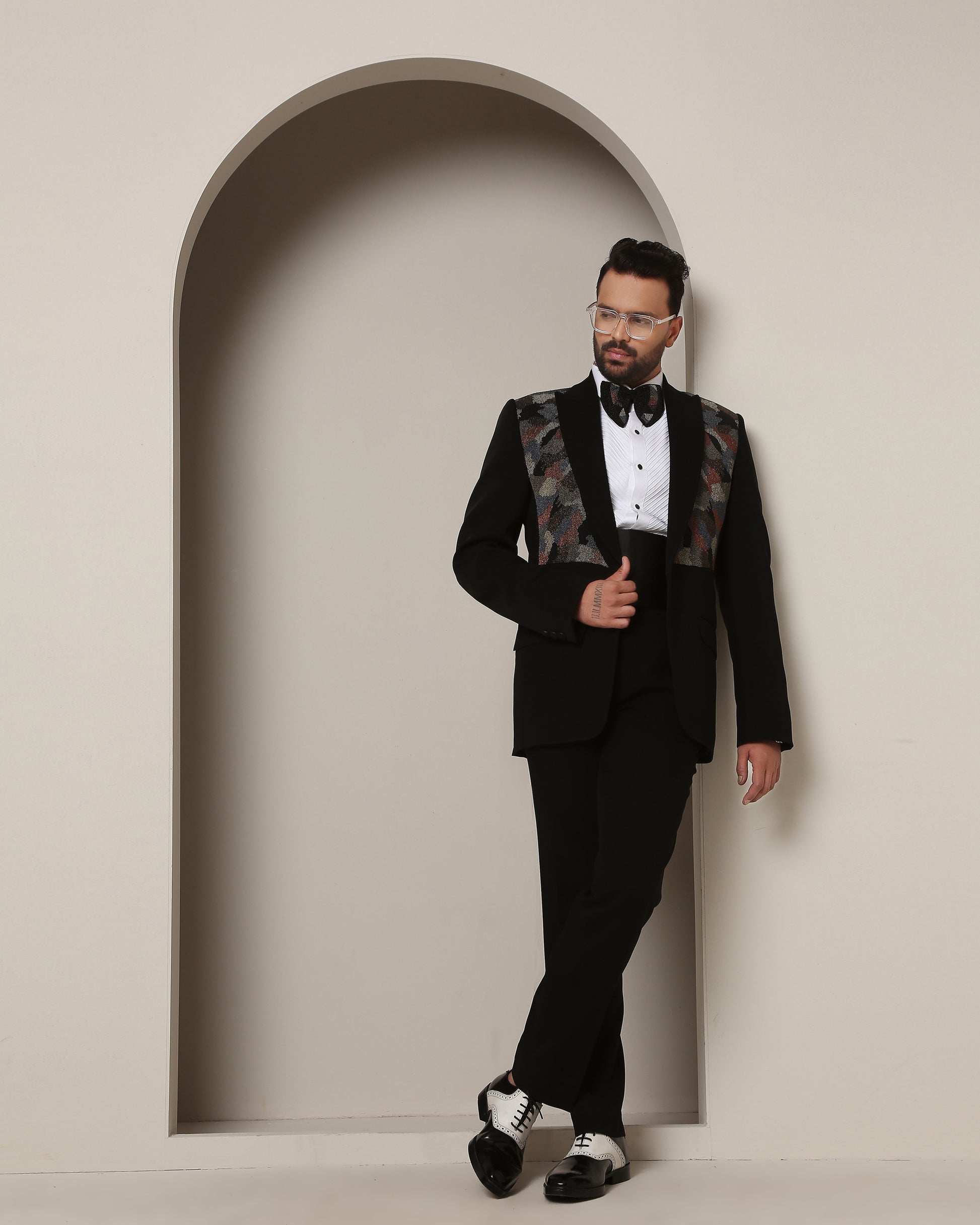 Black tuxedo, adorned with peak lapel, conceals a symbolic camouflage: bead-embroidered pattern shifts with colors, a tribute to soldiers' unity, love for family, future, and homeland. An ode to true gentlemen.