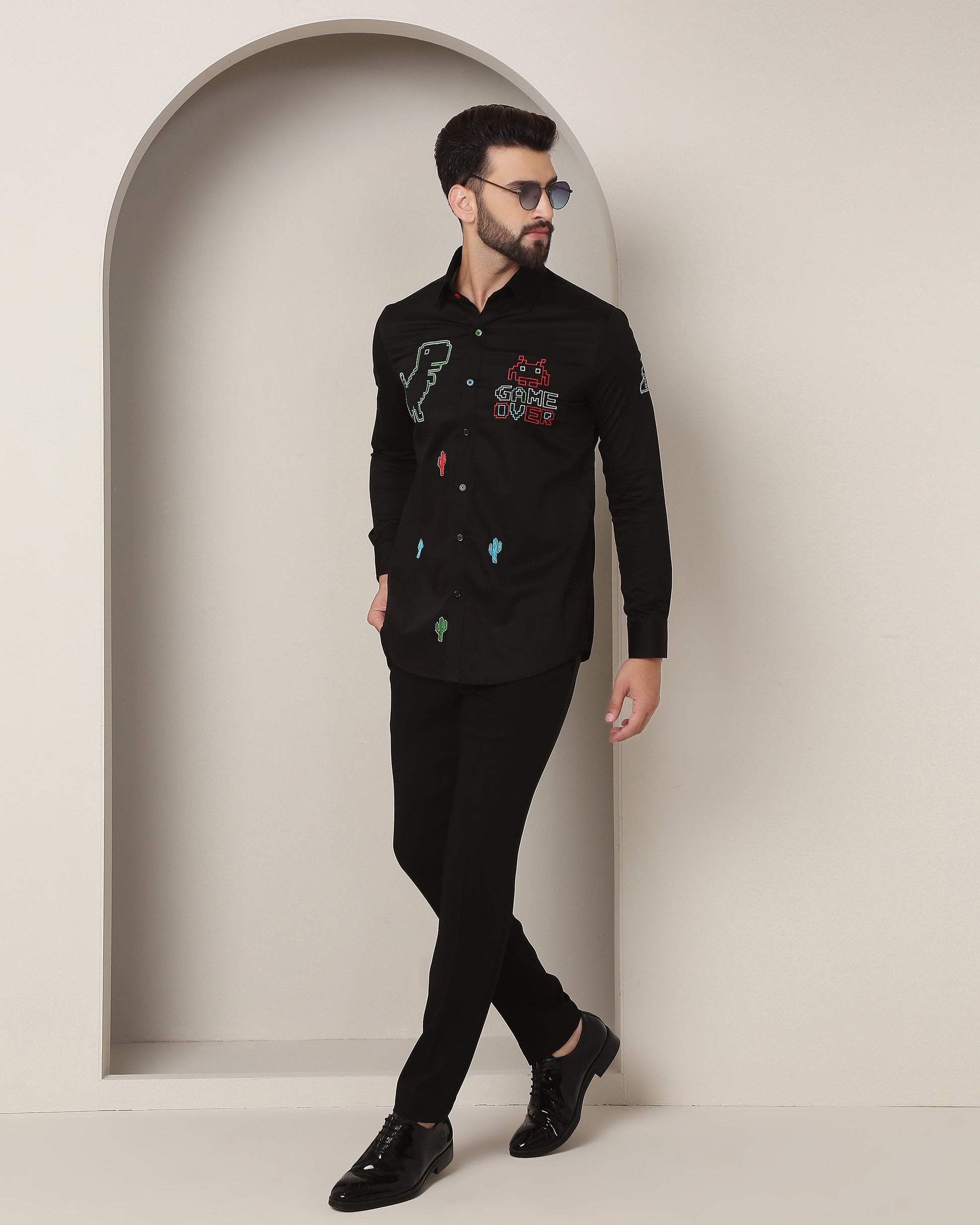 Nostalgic Gaming Elegance: Intricately Embroidered Black Shirt Fusing Love and Classic Design