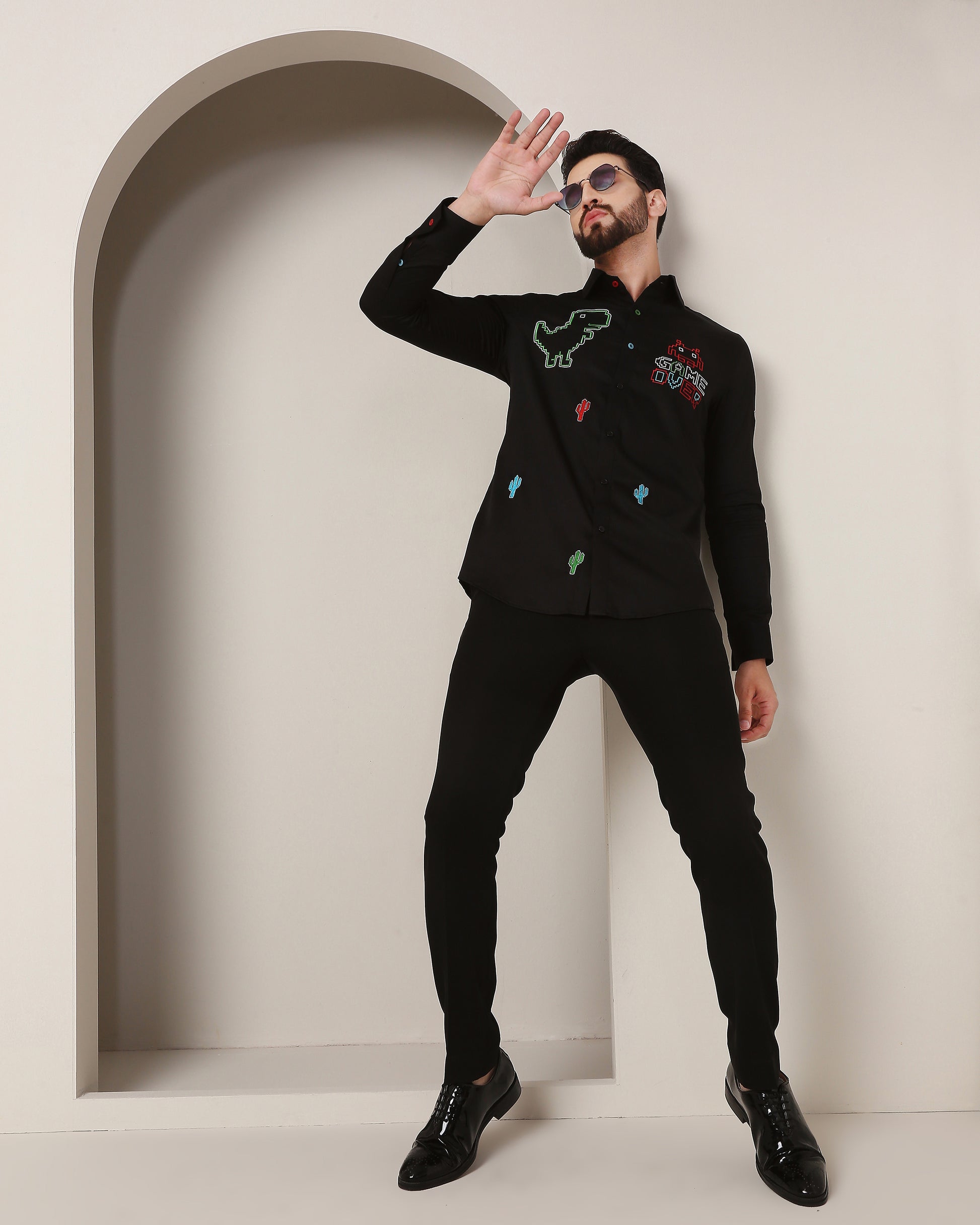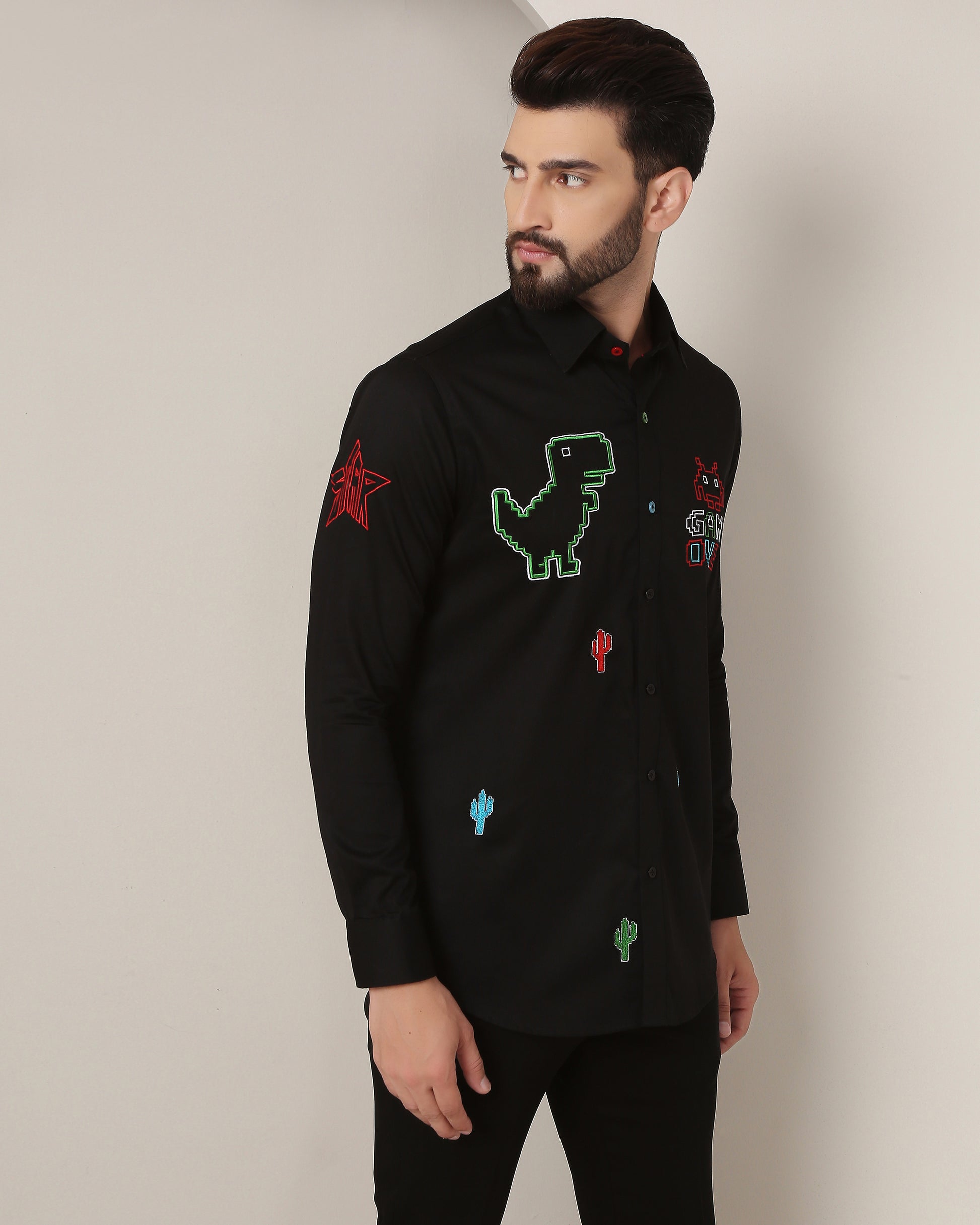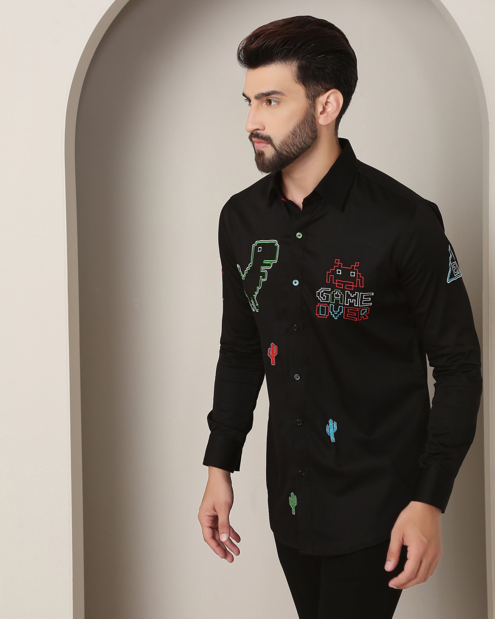This black shirt beautifully captures nostalgia with intricate game inspired embroidery, blending love and classic gaming in a timeless design.