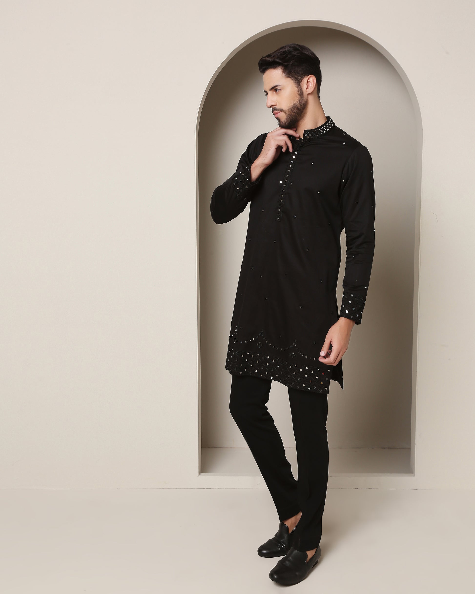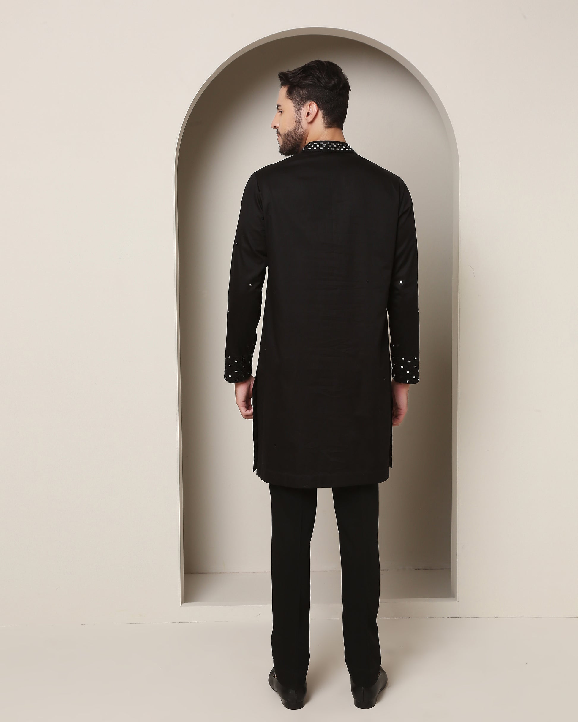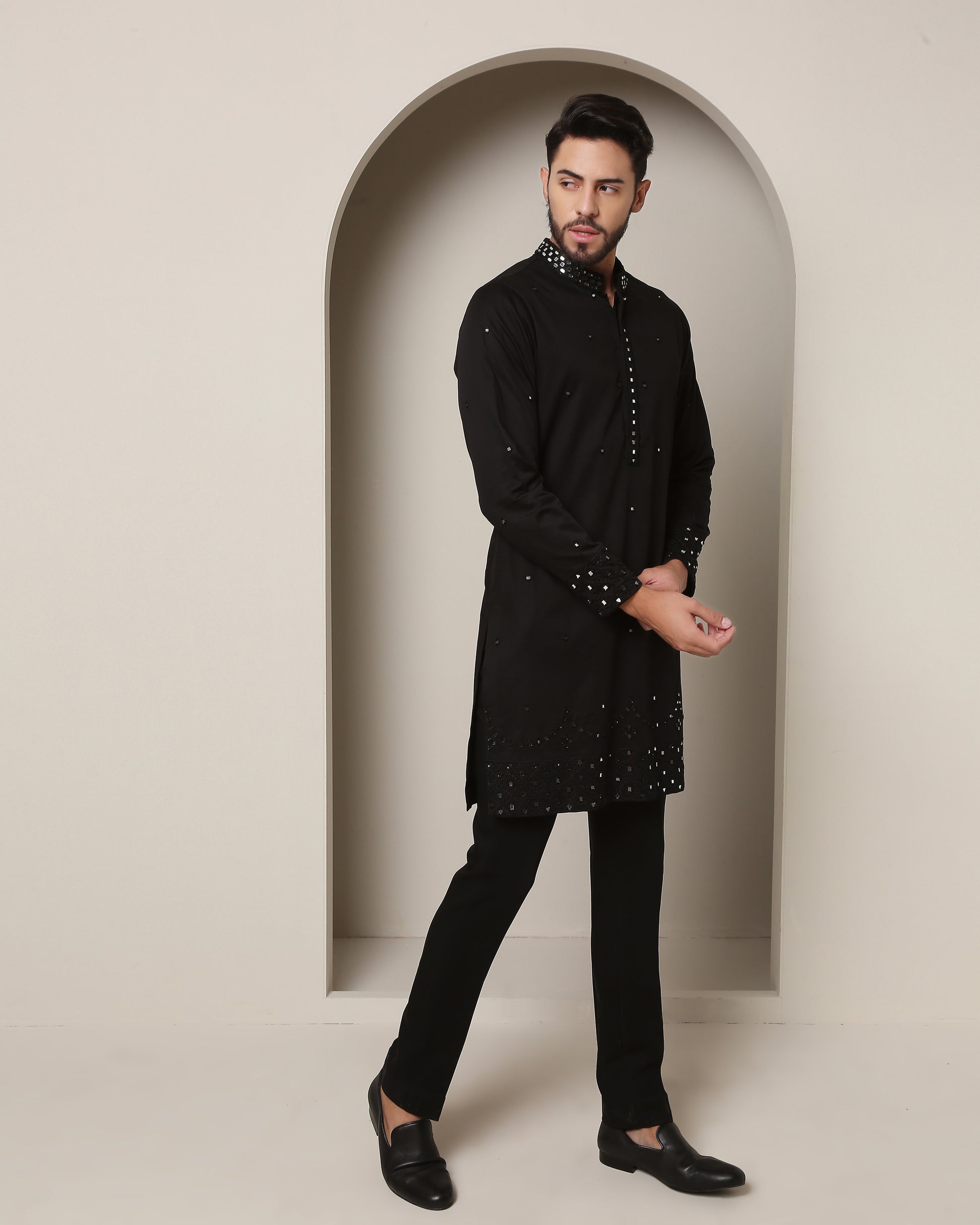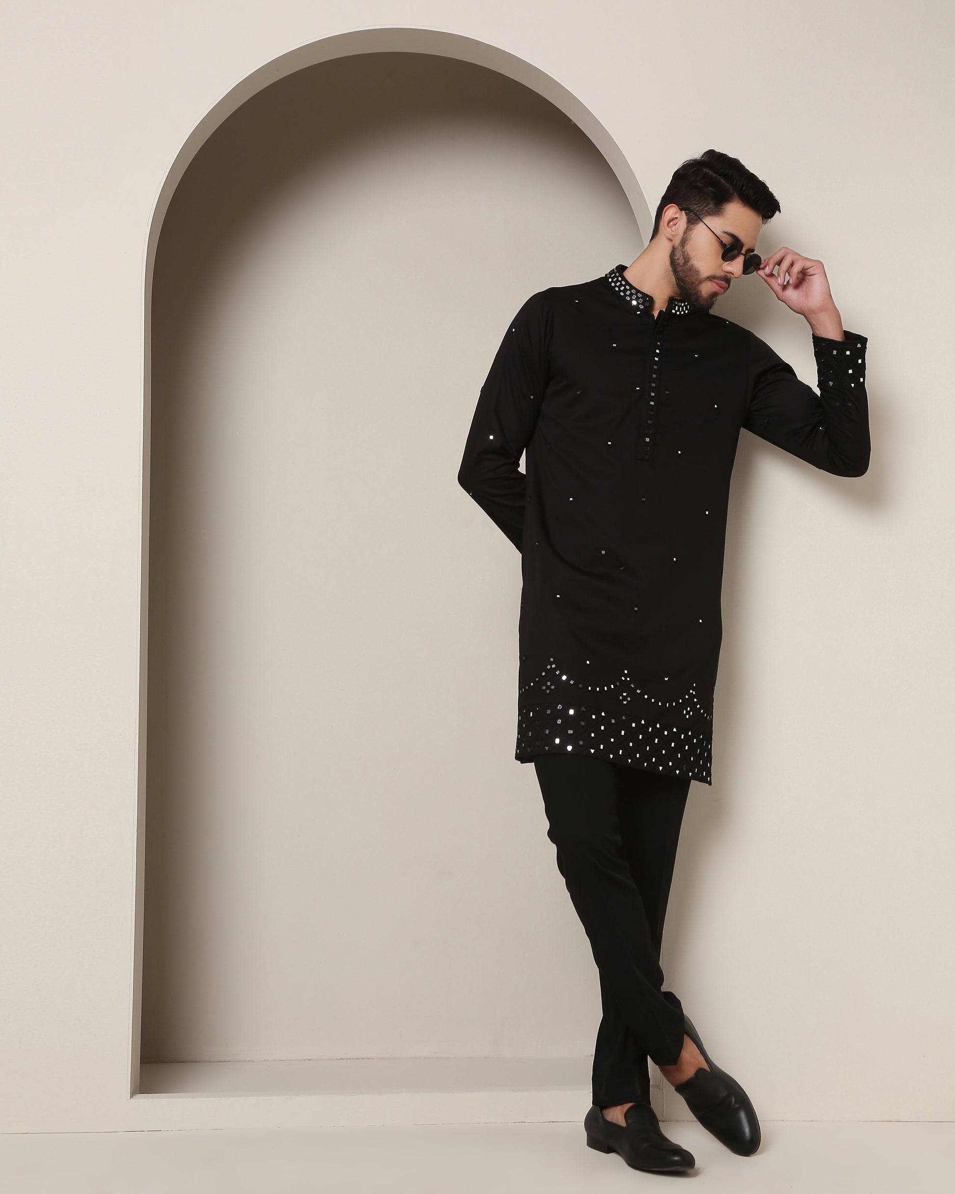 A black kurta, a mosaic of mirrors. Collar, placket, hem intricately embroidered, each reflection a story. Paired with cigarette trousers for a striking ensemble