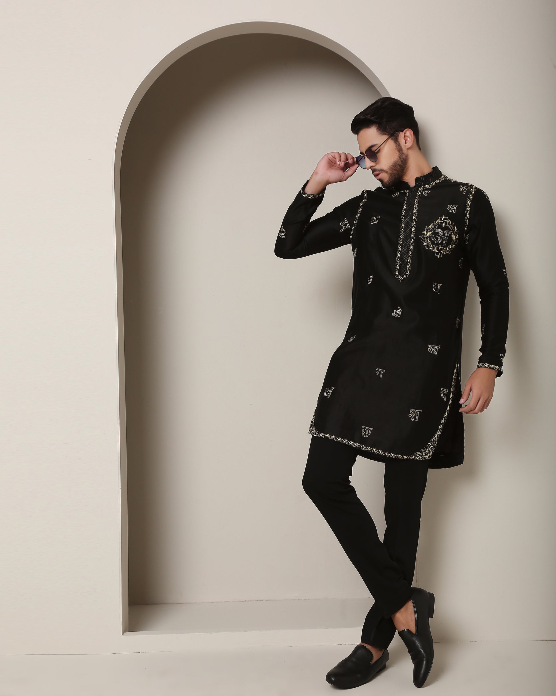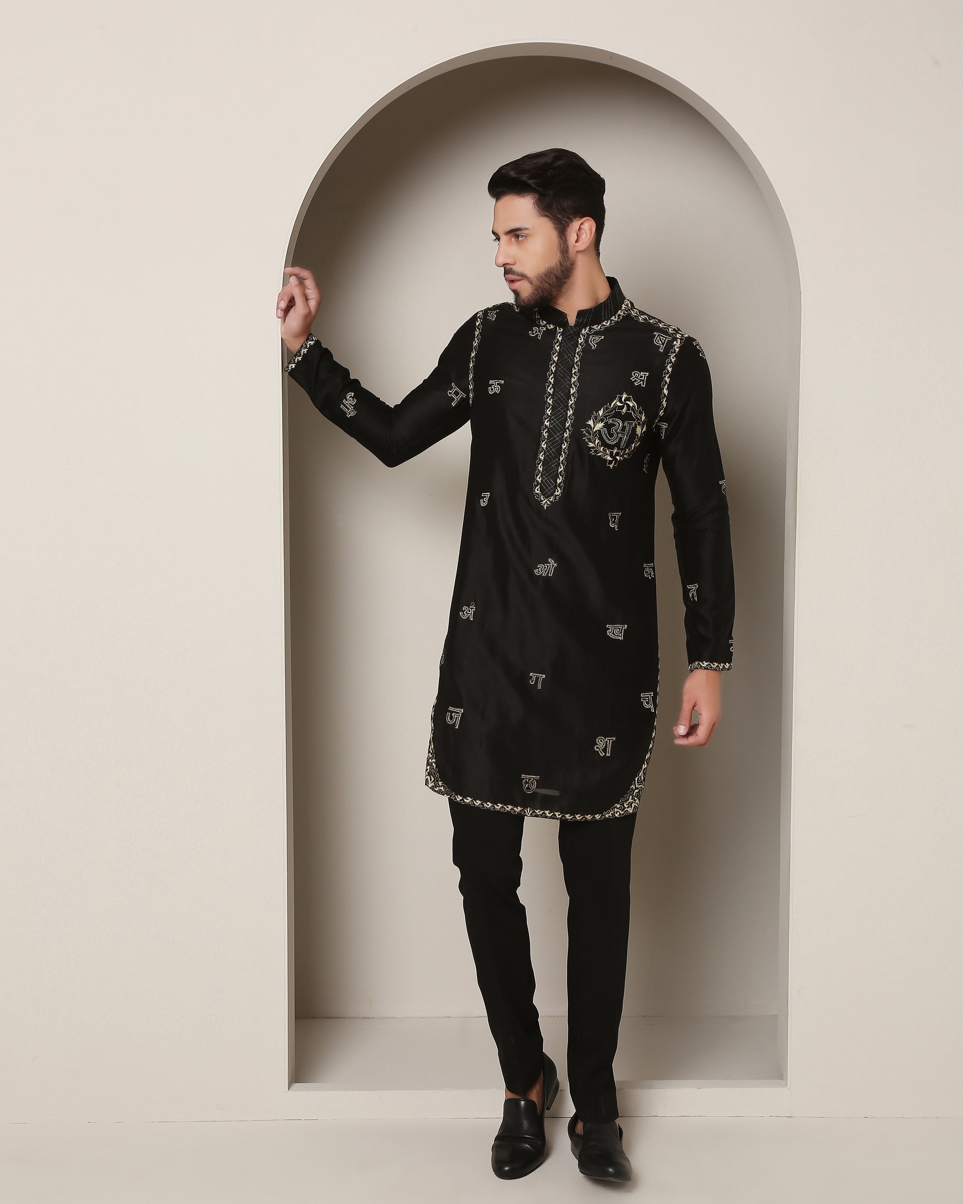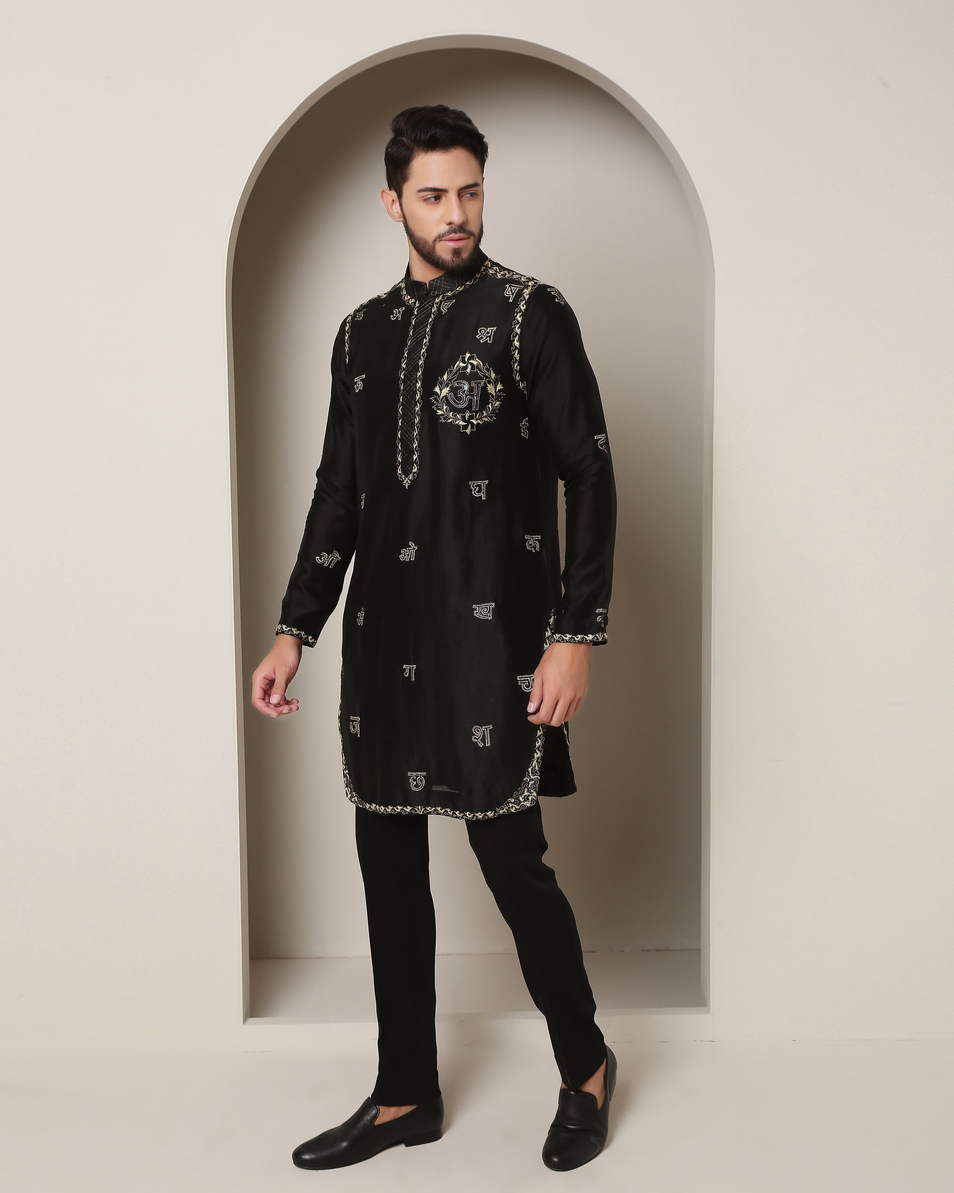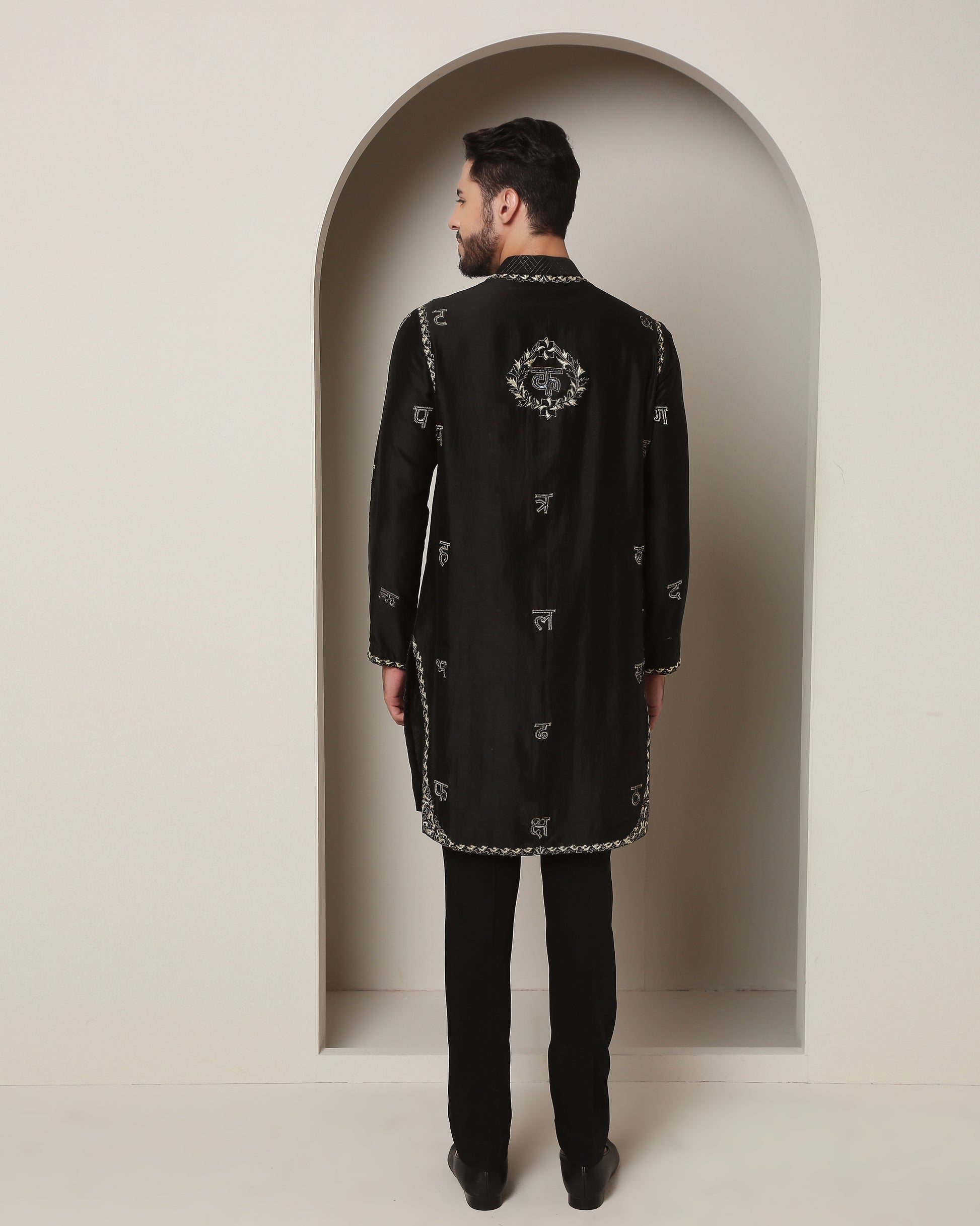 Gold wire gemotry, historic wave motif, emblem accents. Front adorned with Hindi letters, back with corresponding sounds. A shimmering tribute to language and heritage."