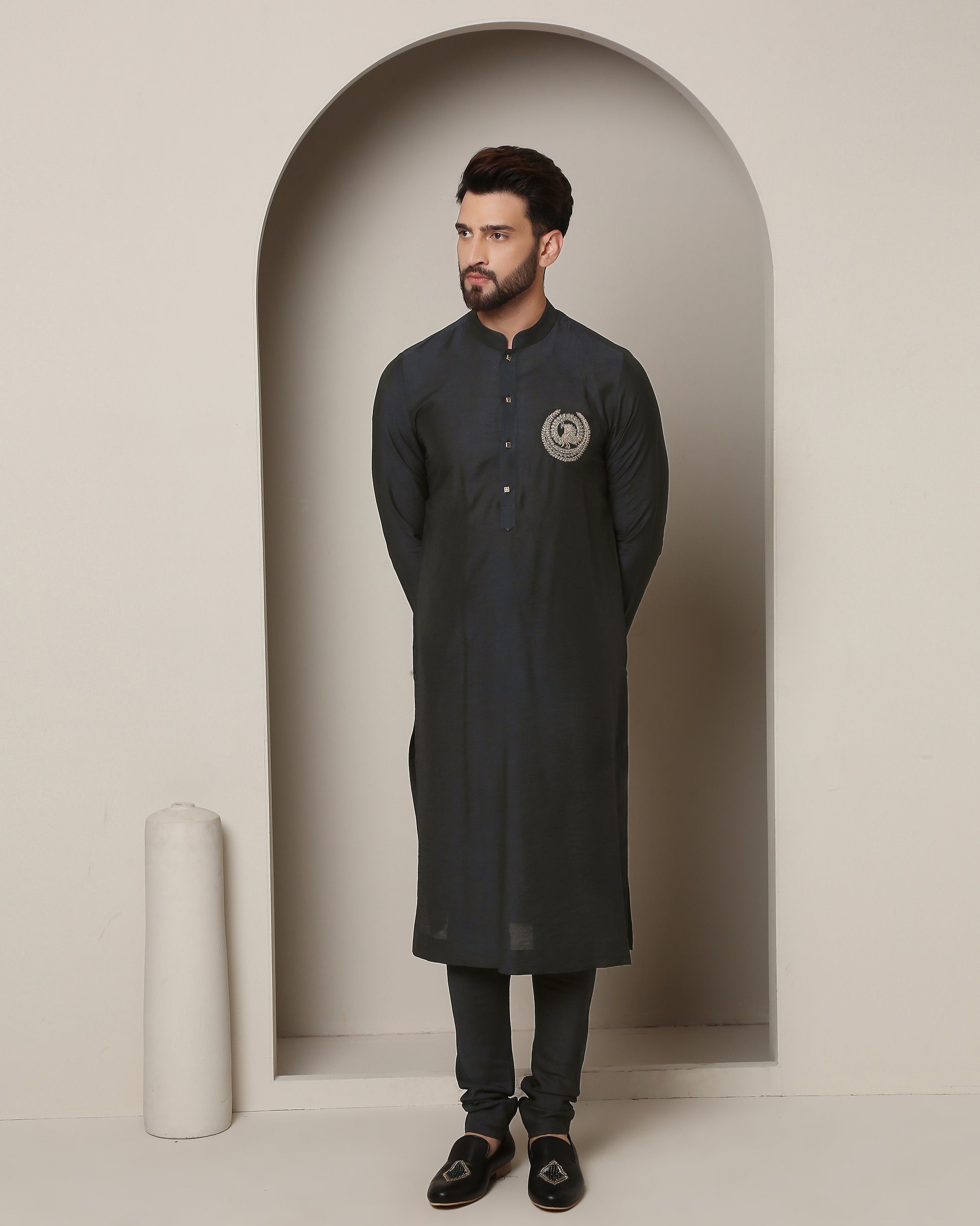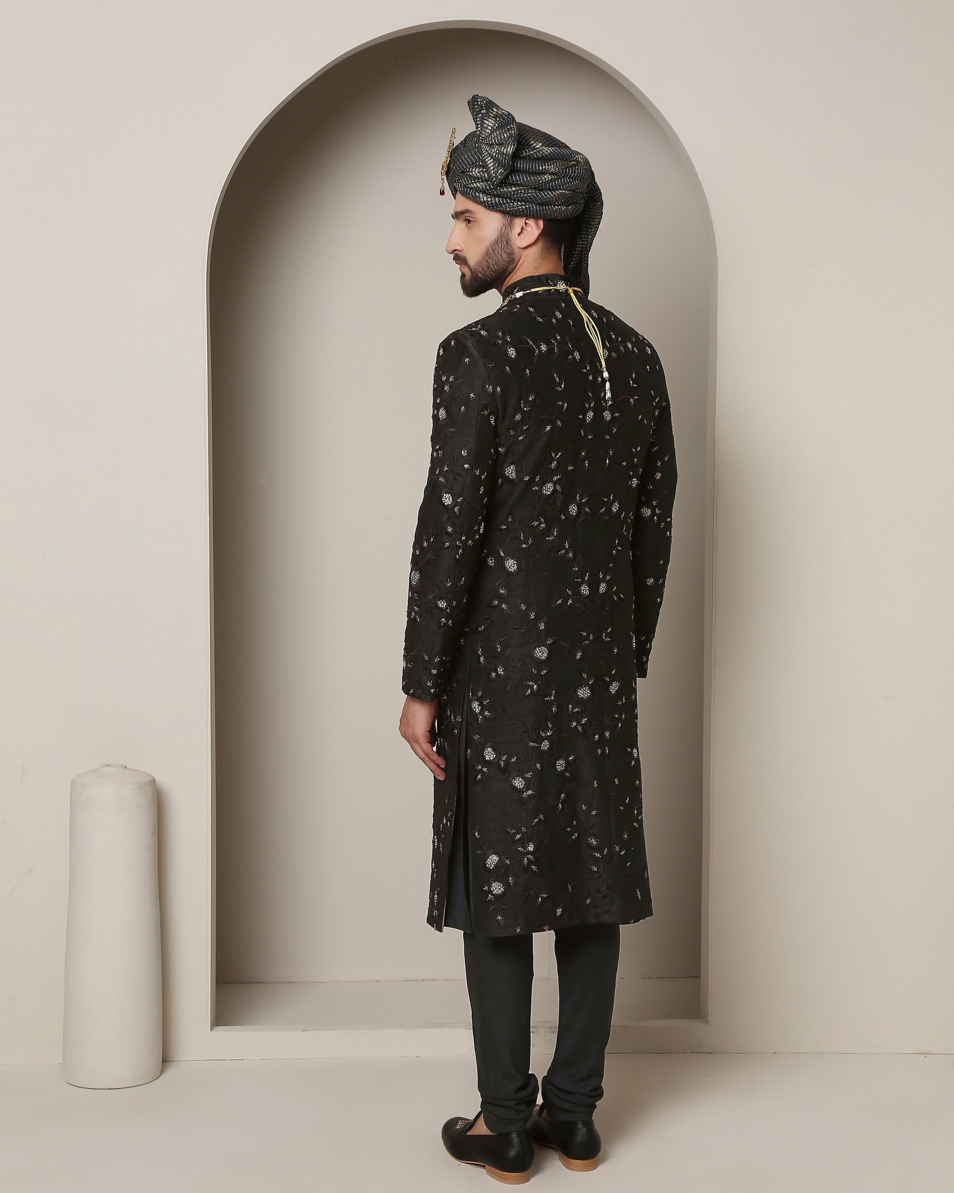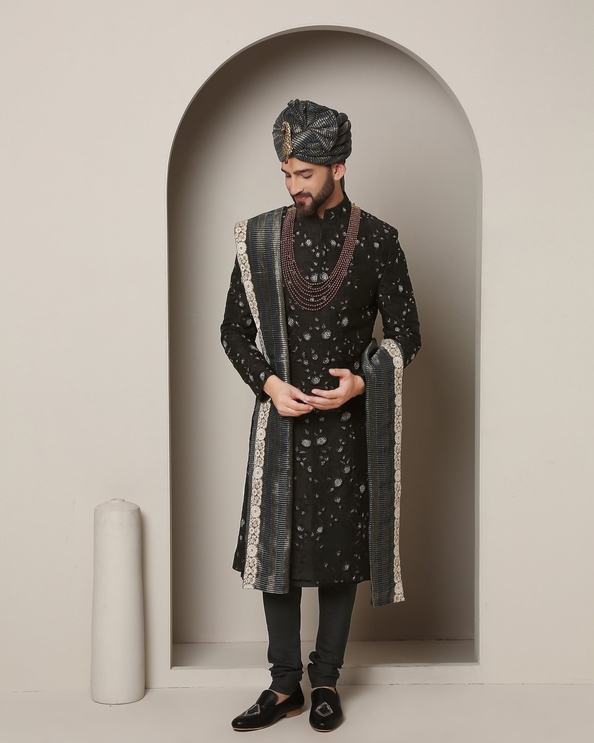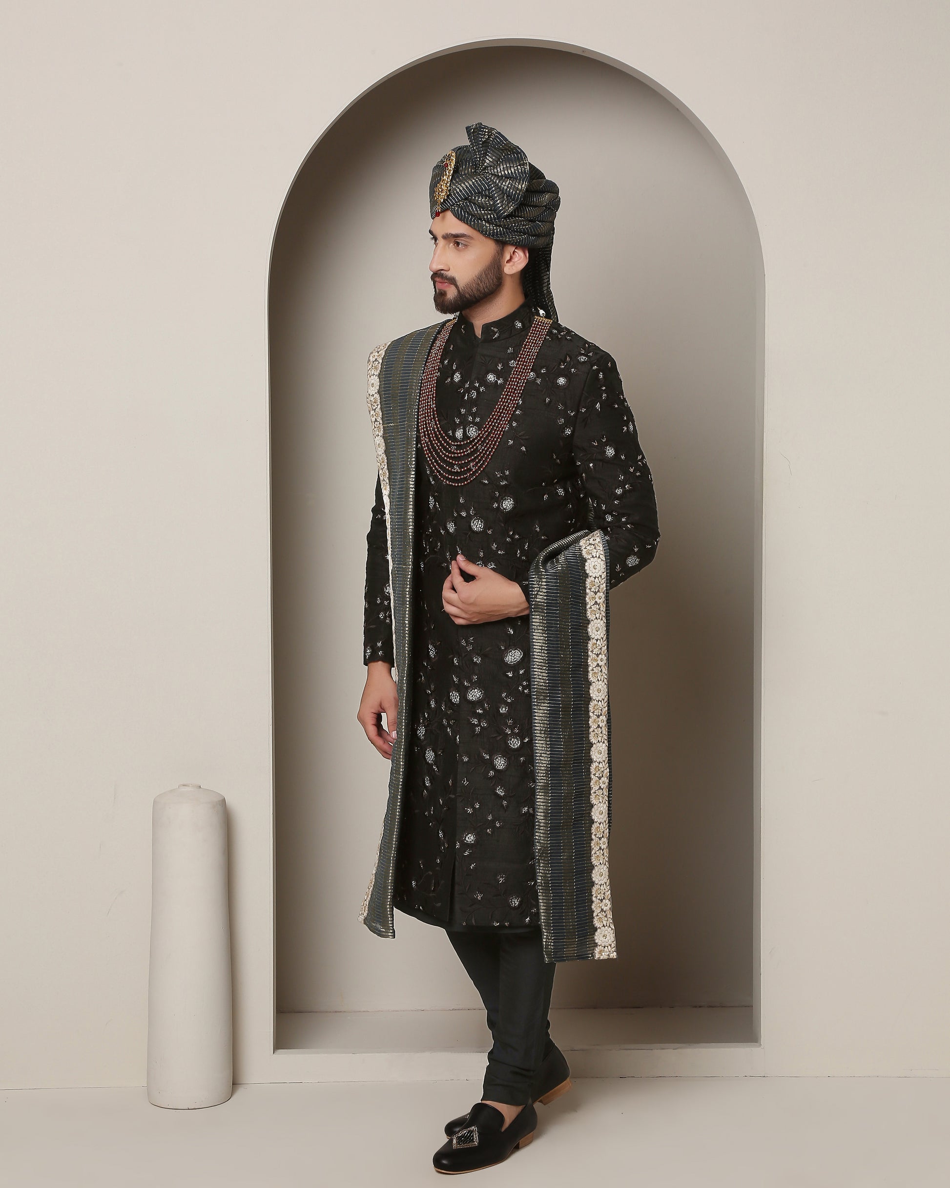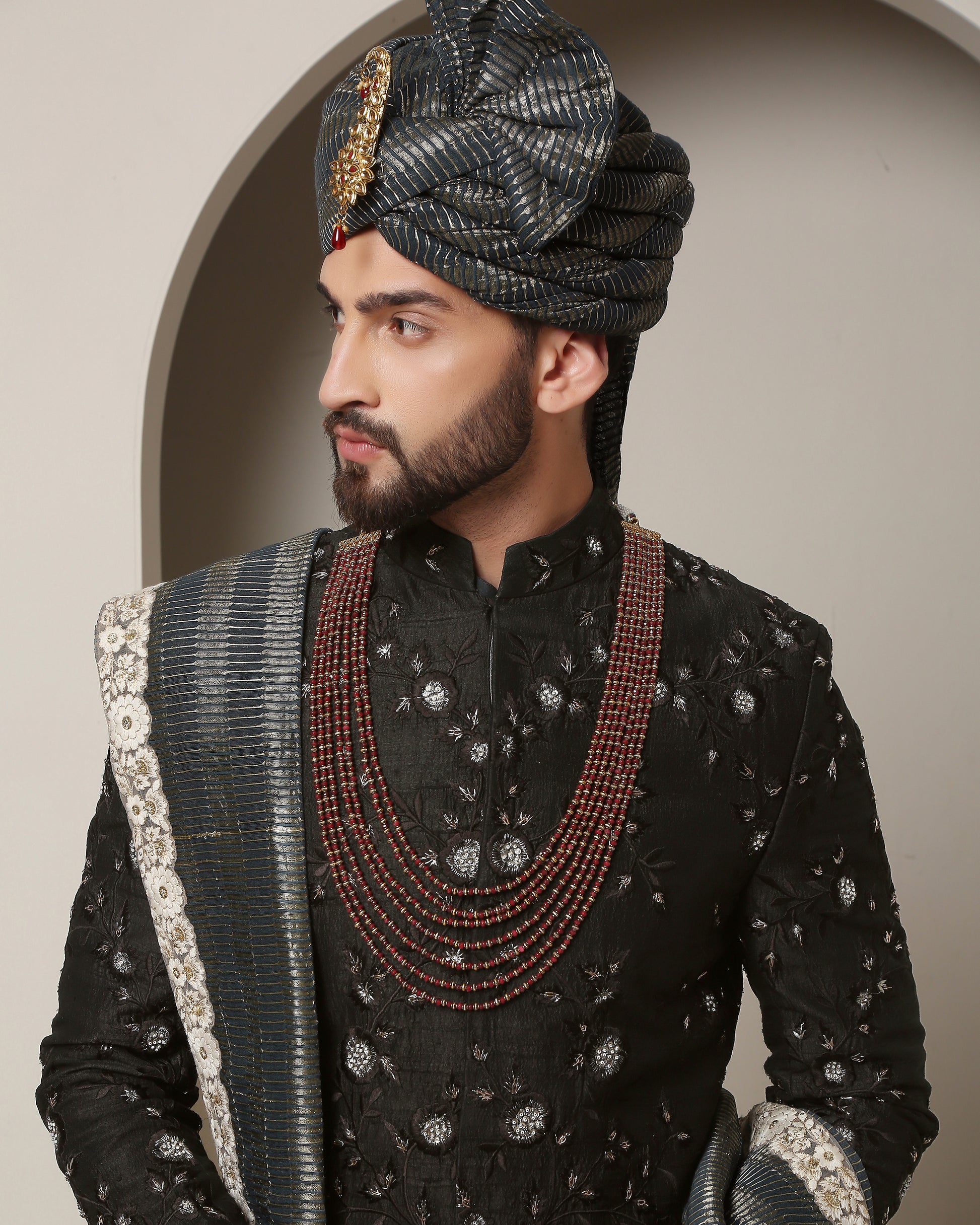 Elegant midnight green sherwani, intricately embroidered with midnight-tone floral motifs, enriched by gold and silver detailing. Complemented by a dark green dupatta with silver zari weave and ivory-gold symmetrical floral border.