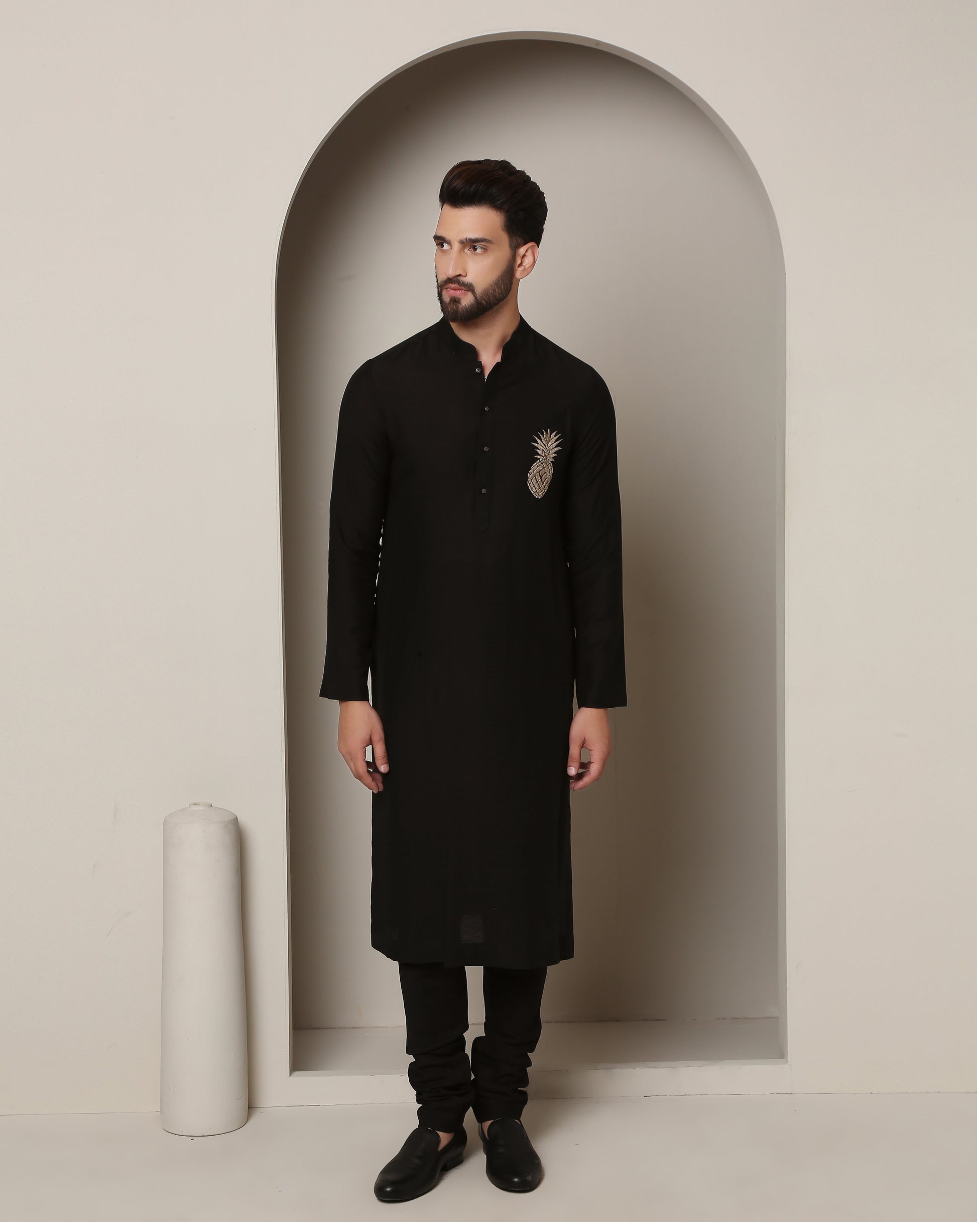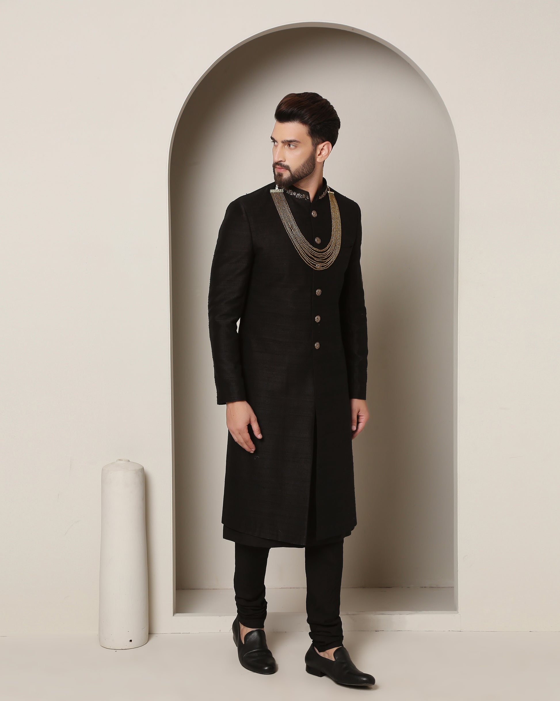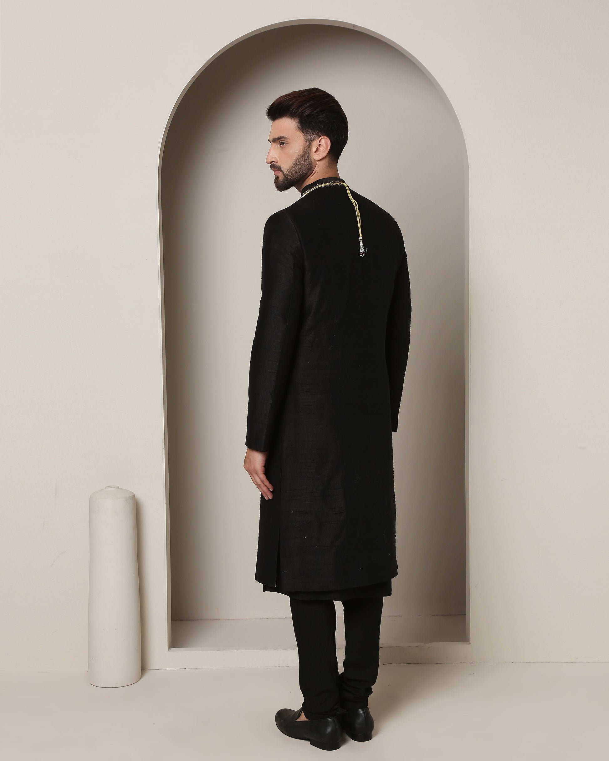 Onyx silk symphony handwoven, whispers tales of night. Gold zardozi dances 'round the neck like stars, as aurous buttons grace the front, a regal ensemble woven with moonlight's touch.