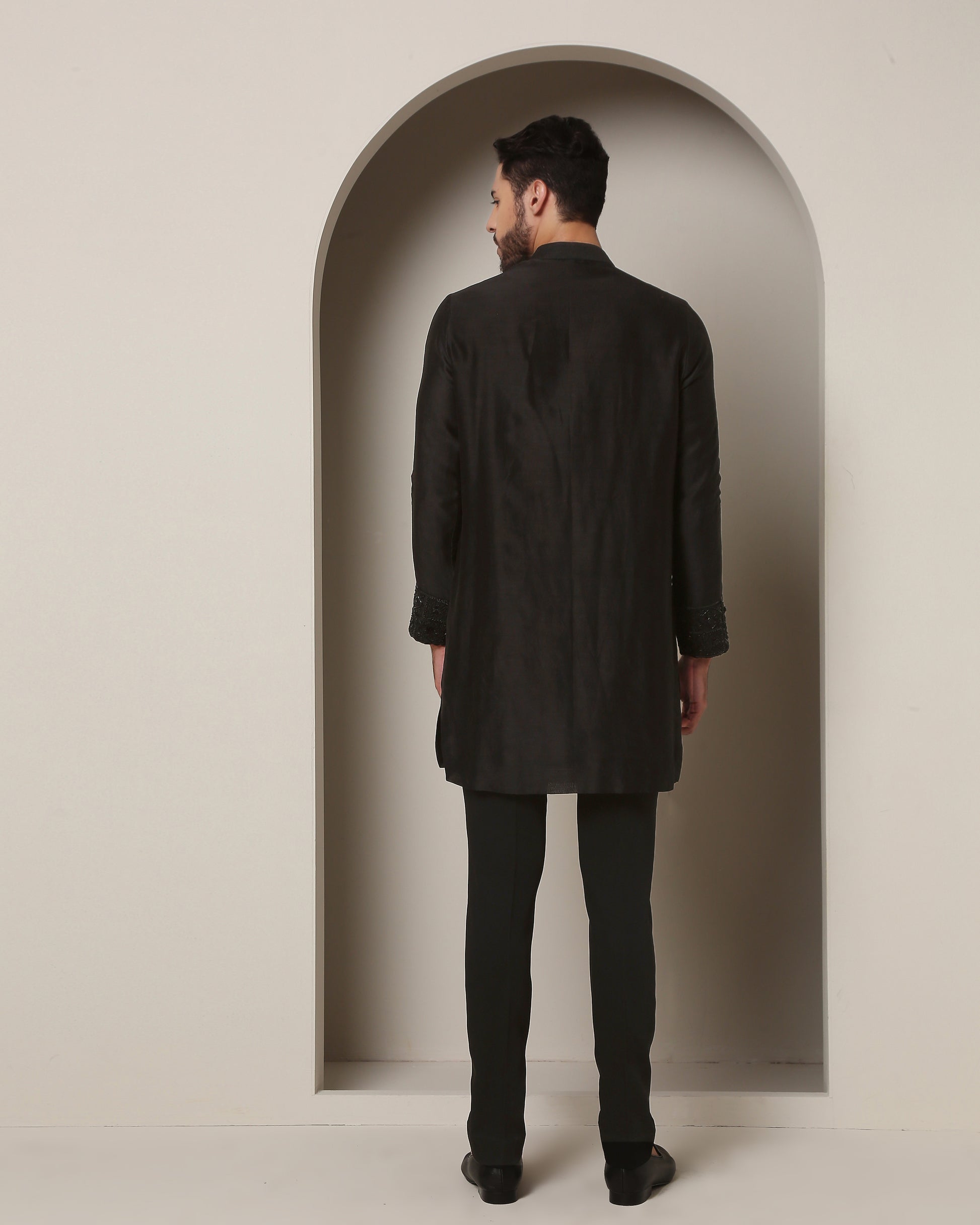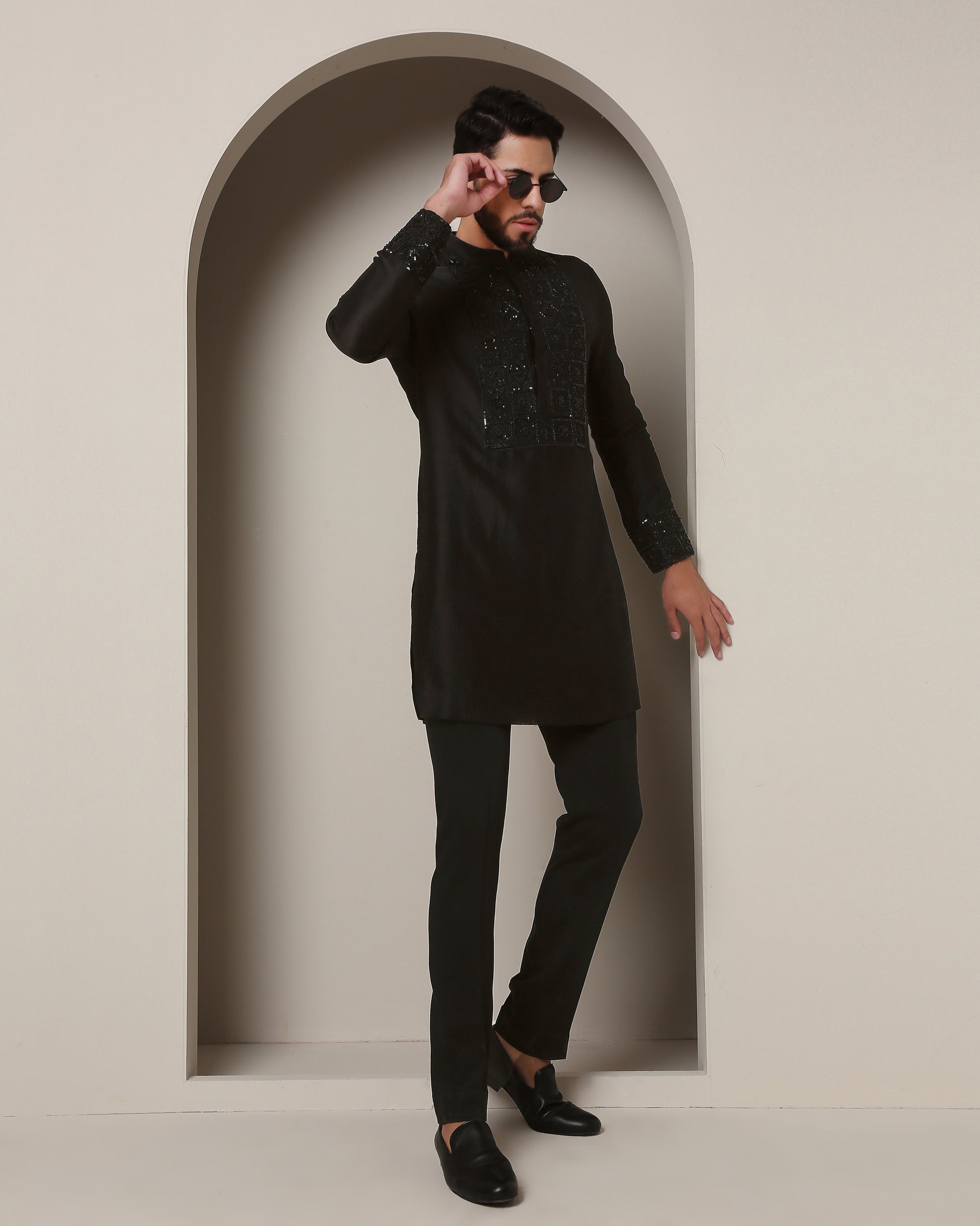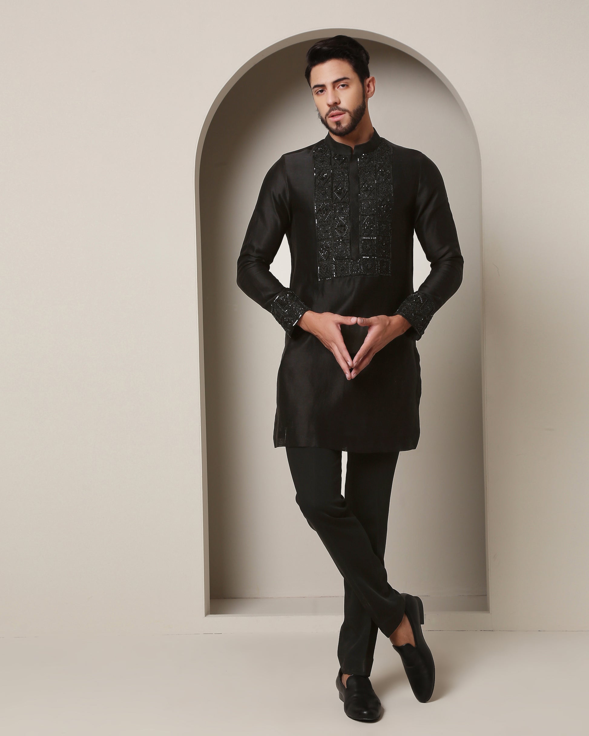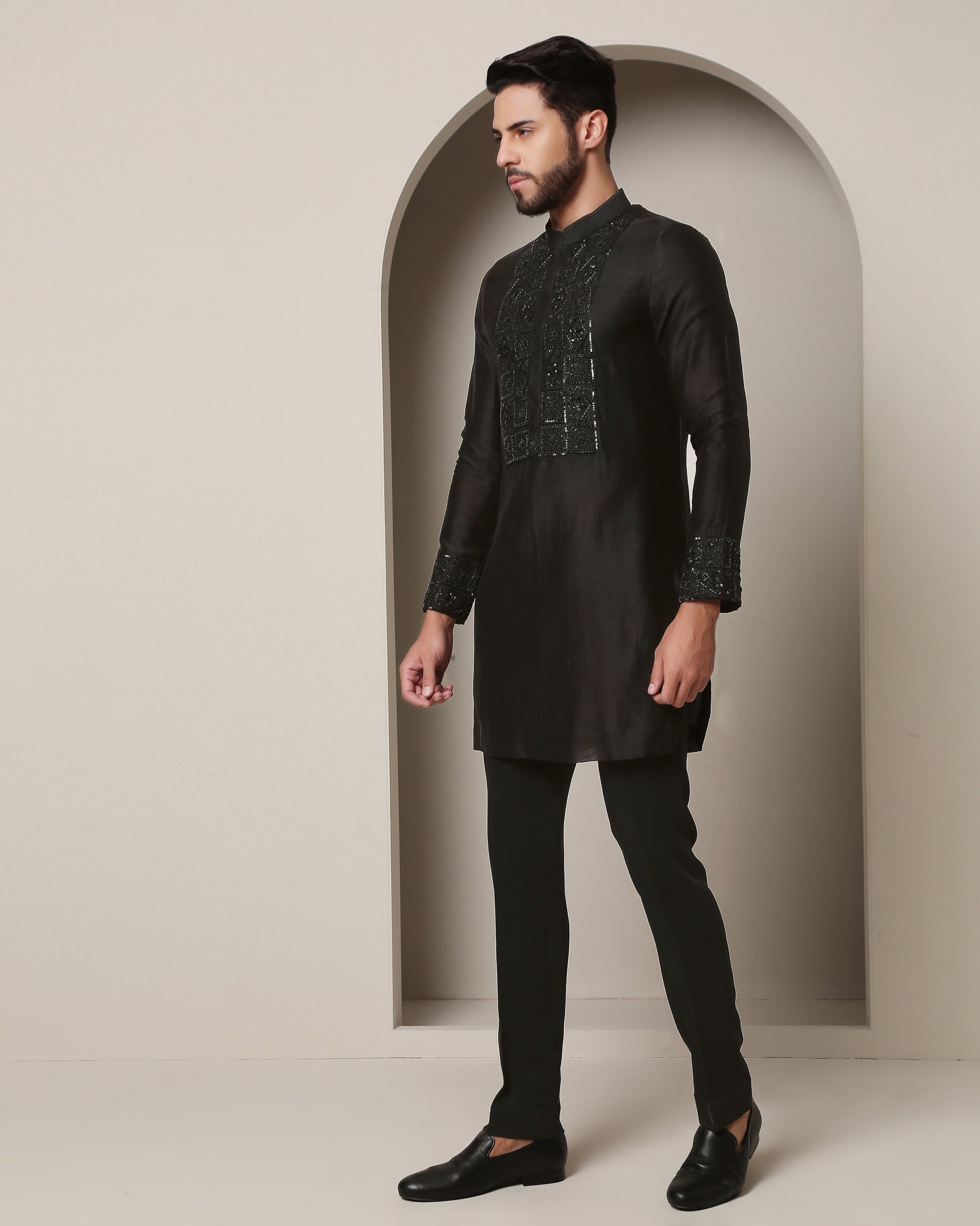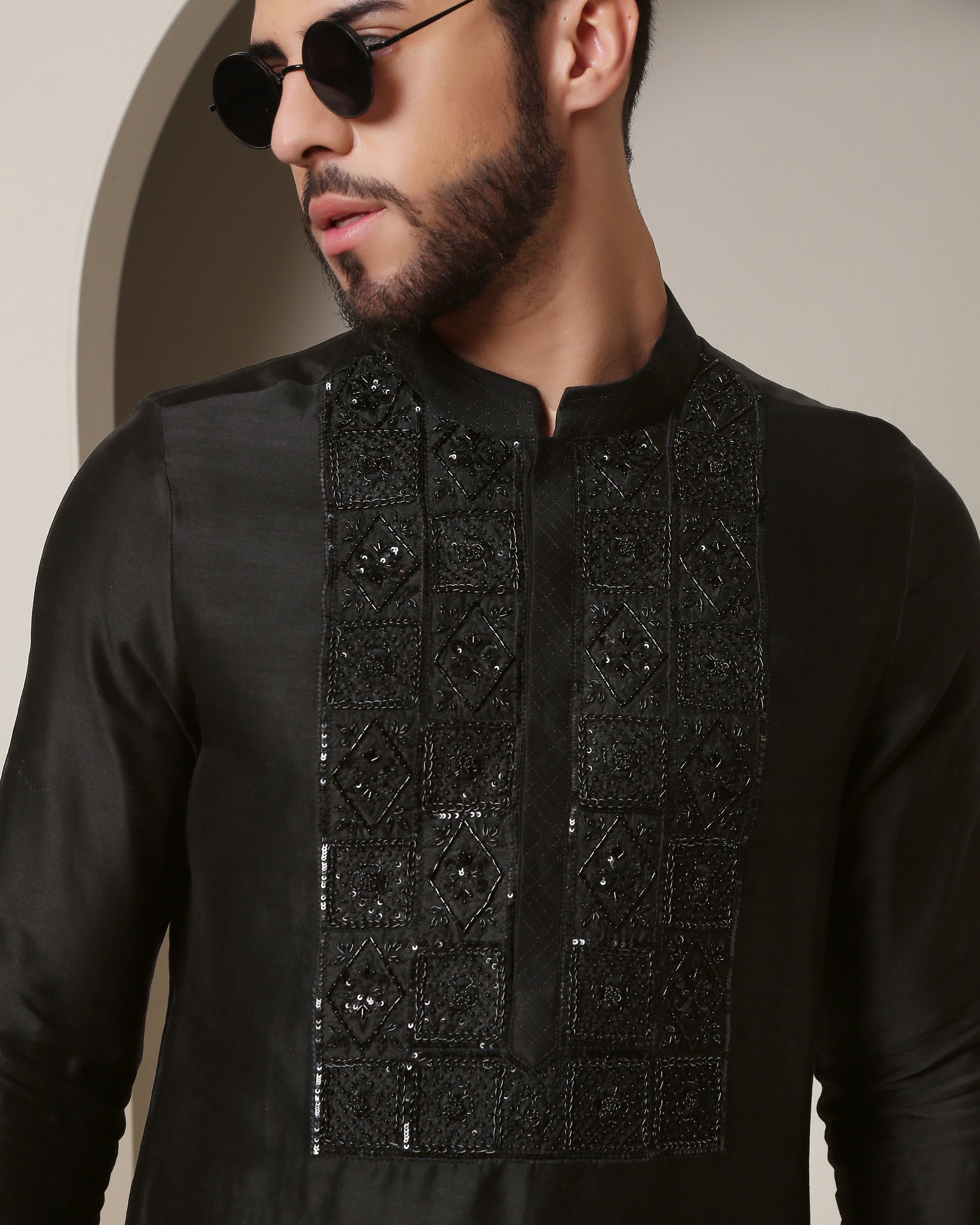 Embark on a journey of elegance with this black kurta. Meticulously handcrafted, zardozi embroidery intertwines with enigmatic square grills, creating an aura of mystique and grandeur. A true masterpiece of style.