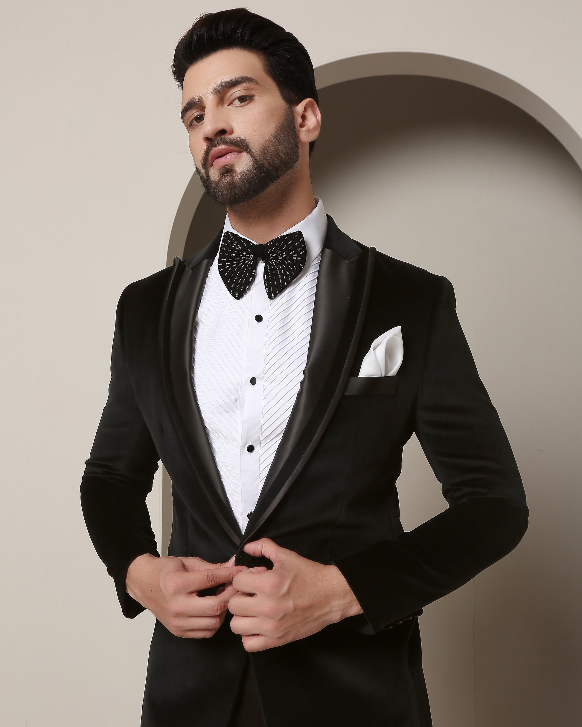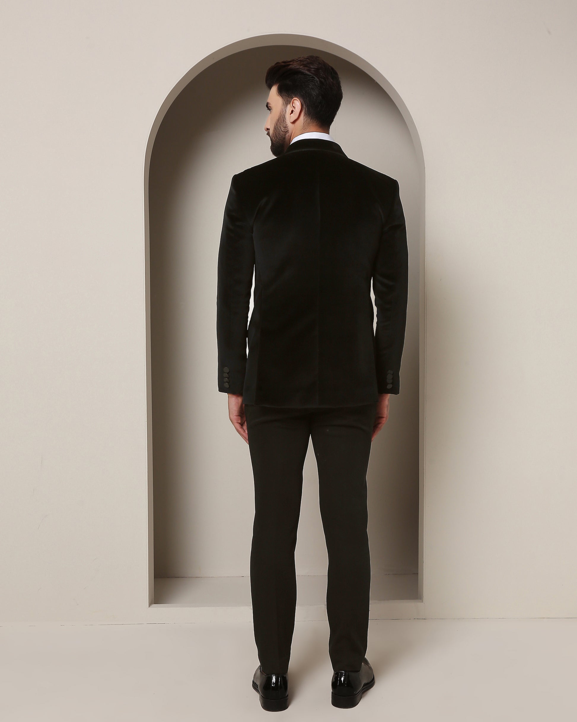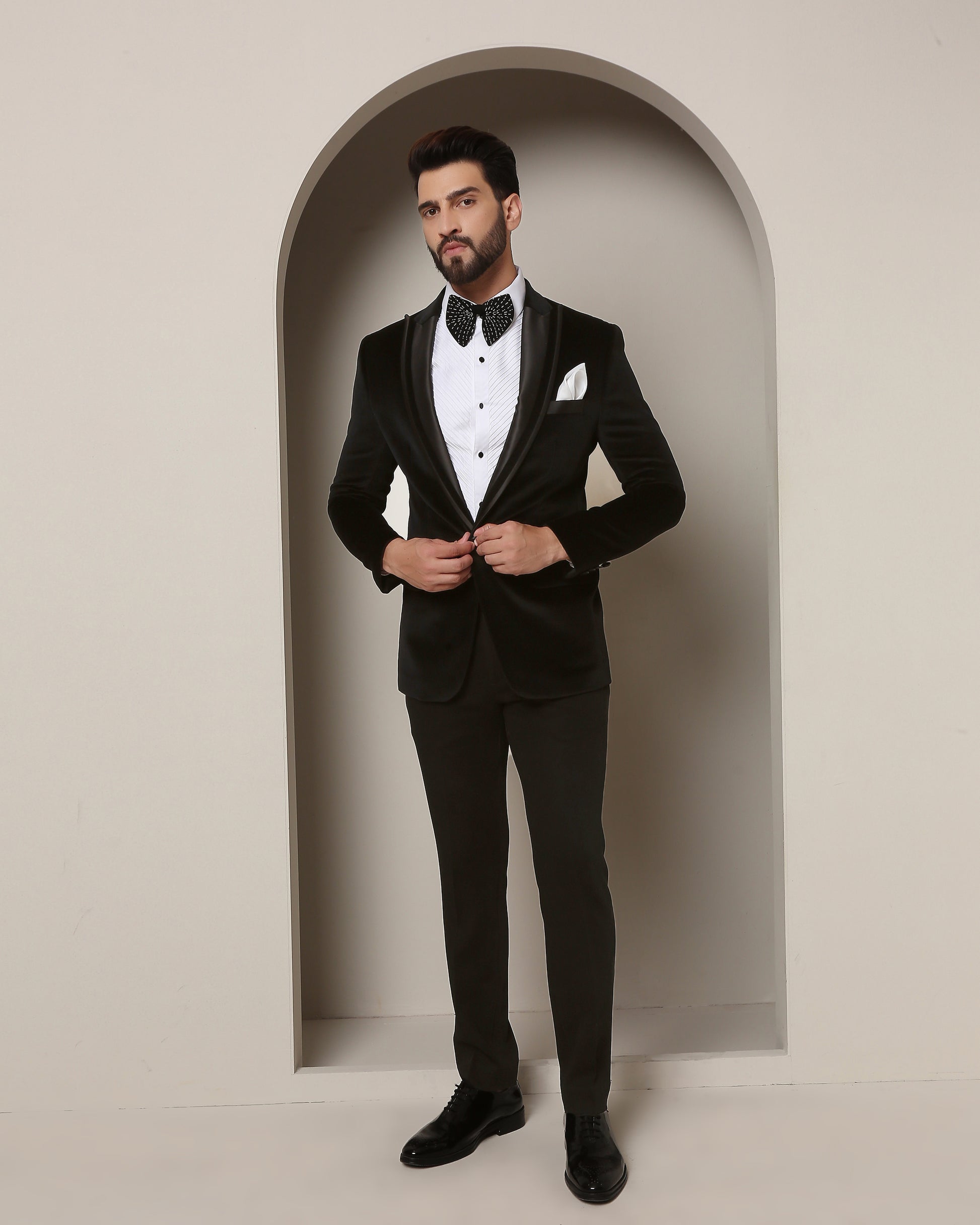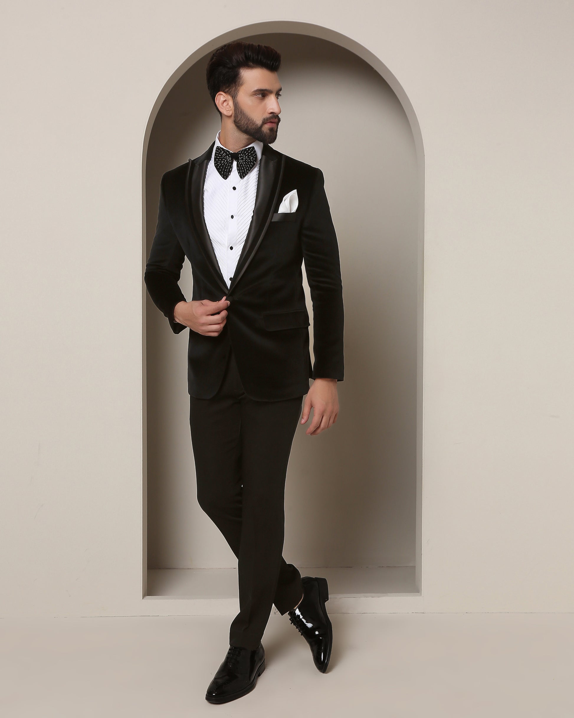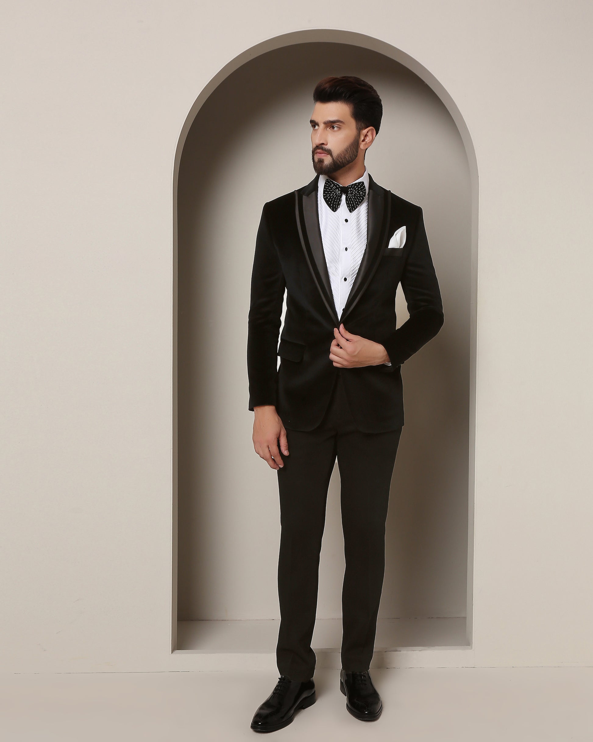 Luxe velvet, peak lapel elegantly detailed in satin. Classic single-button jacket paired with sleek black trousers."