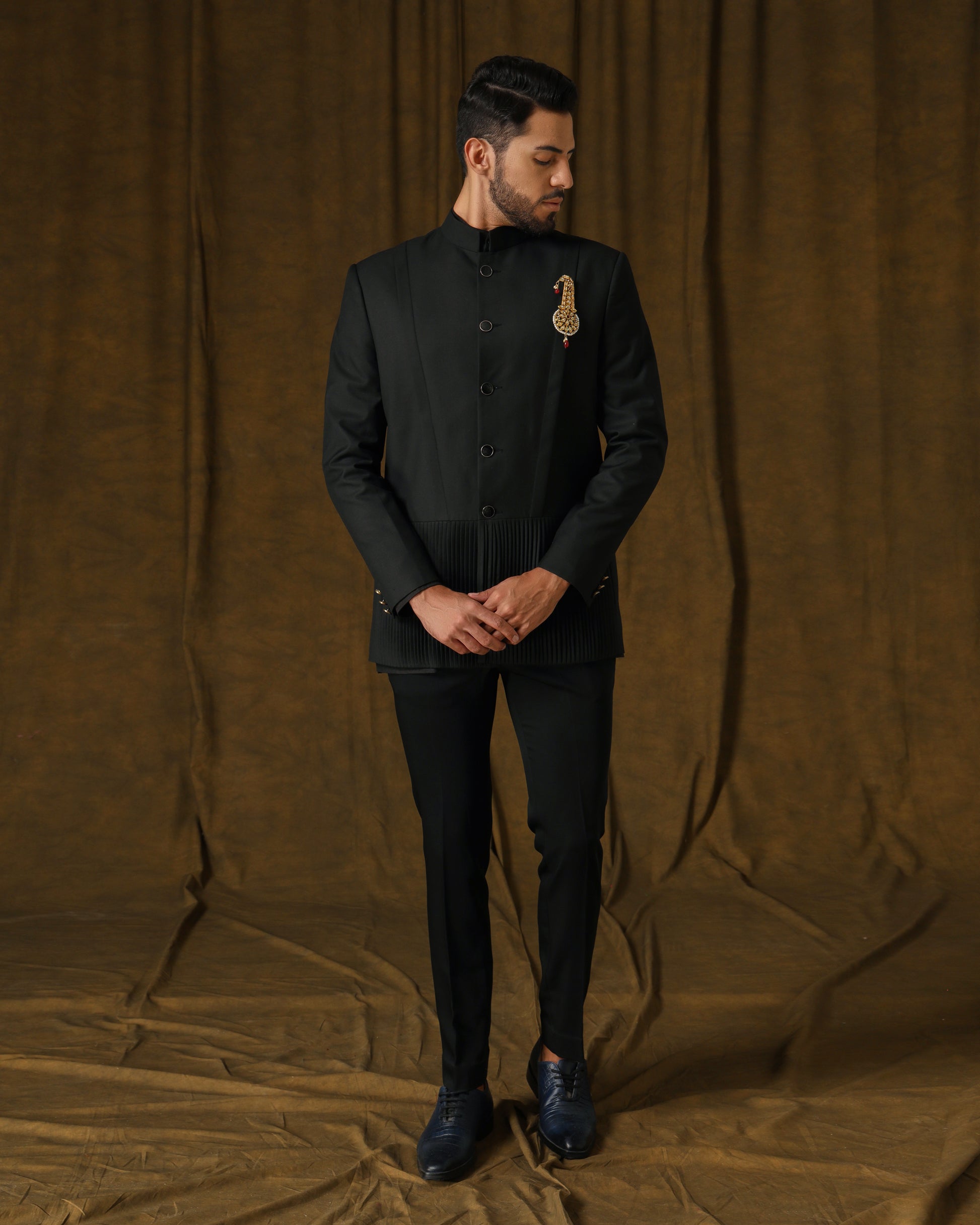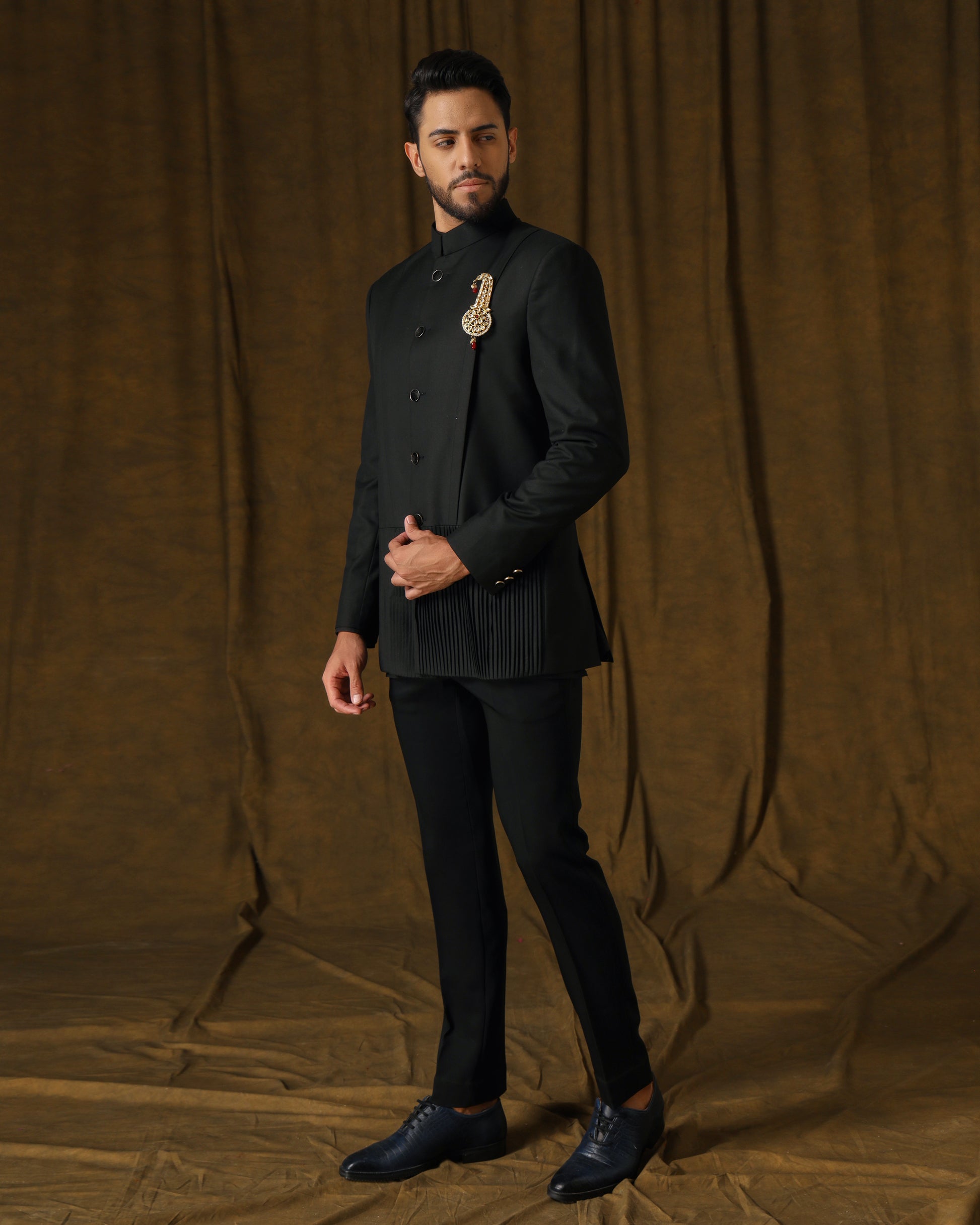 "Sophisticated black bandhgala with pleats and pintucks on lower portion. Paired elegantly with trousers for a refined ensemble."