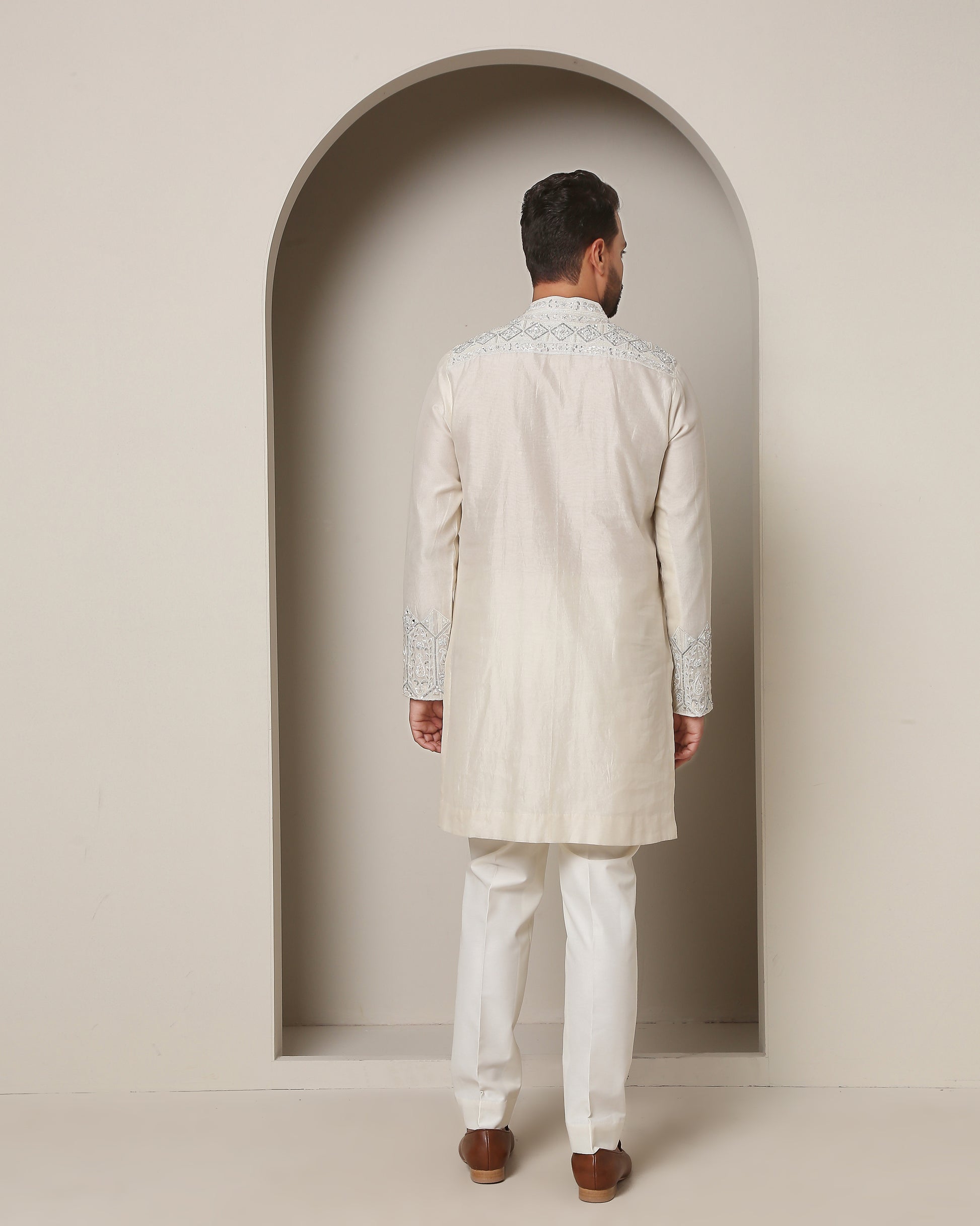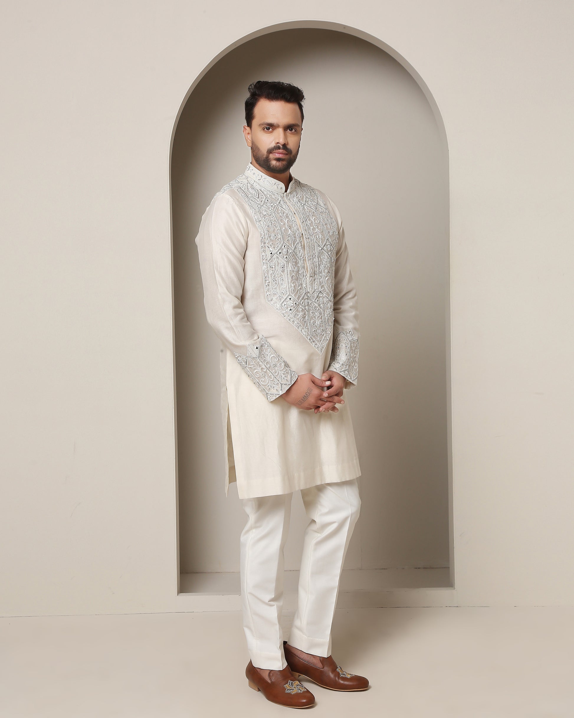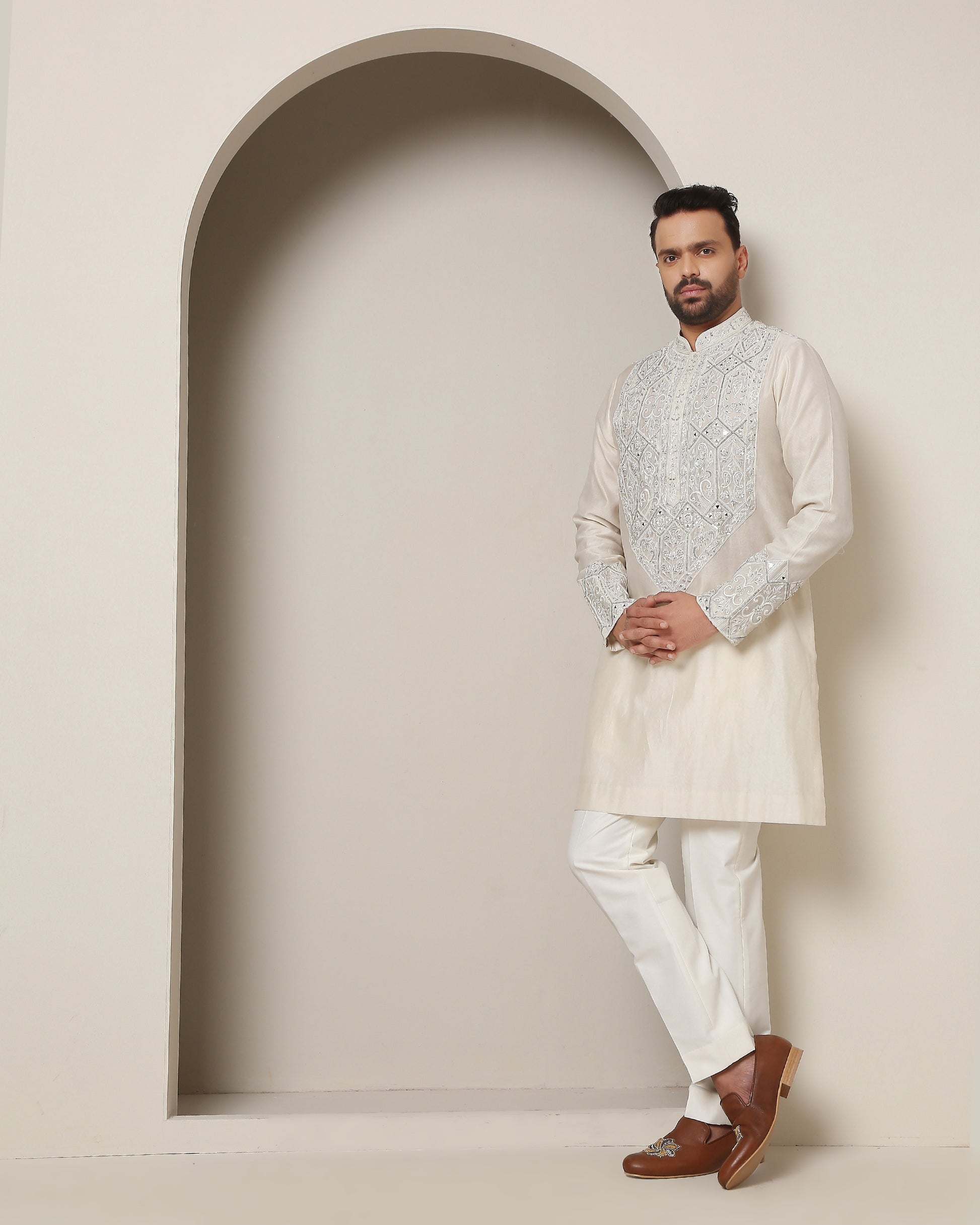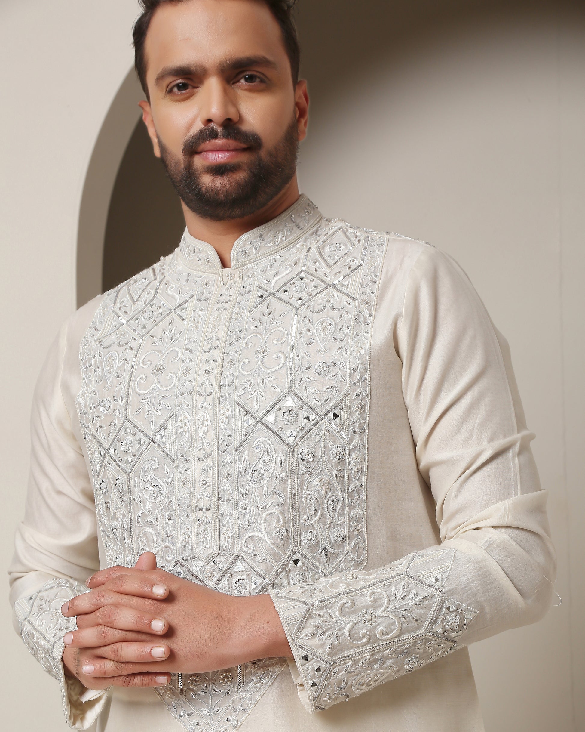 Exuding regal charm, the handwoven silk kurta features ivory thread embroidery, silver accents, mirrors, and pearls. Paired flawlessly with ivory trousers, it's a tribute to royal elegance.