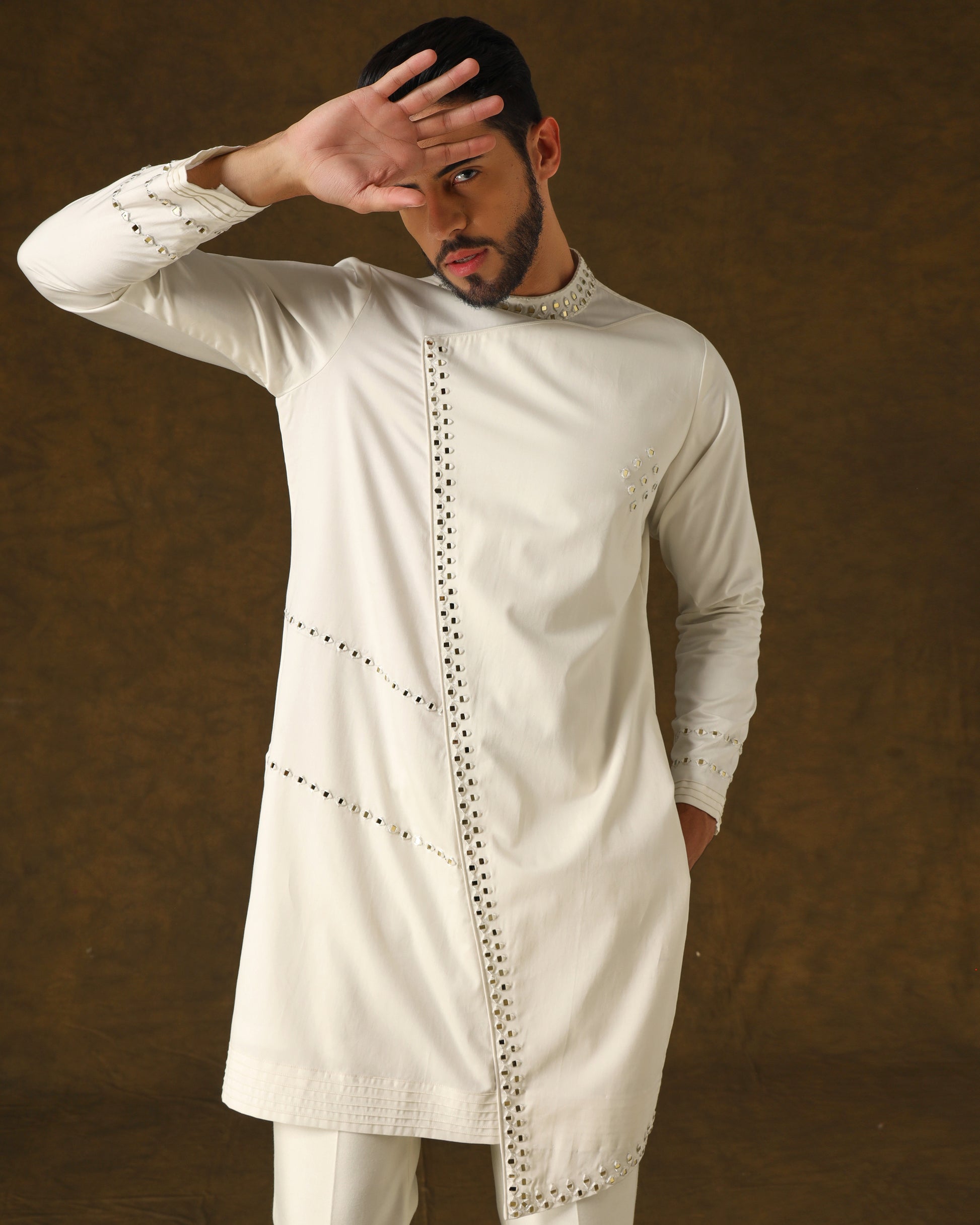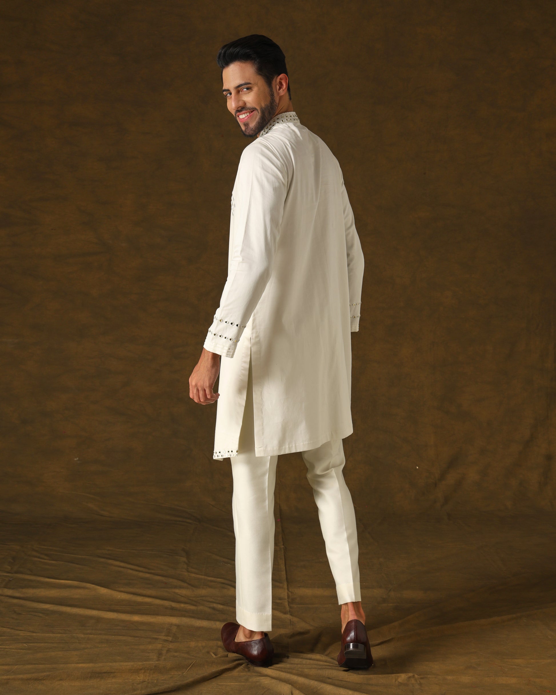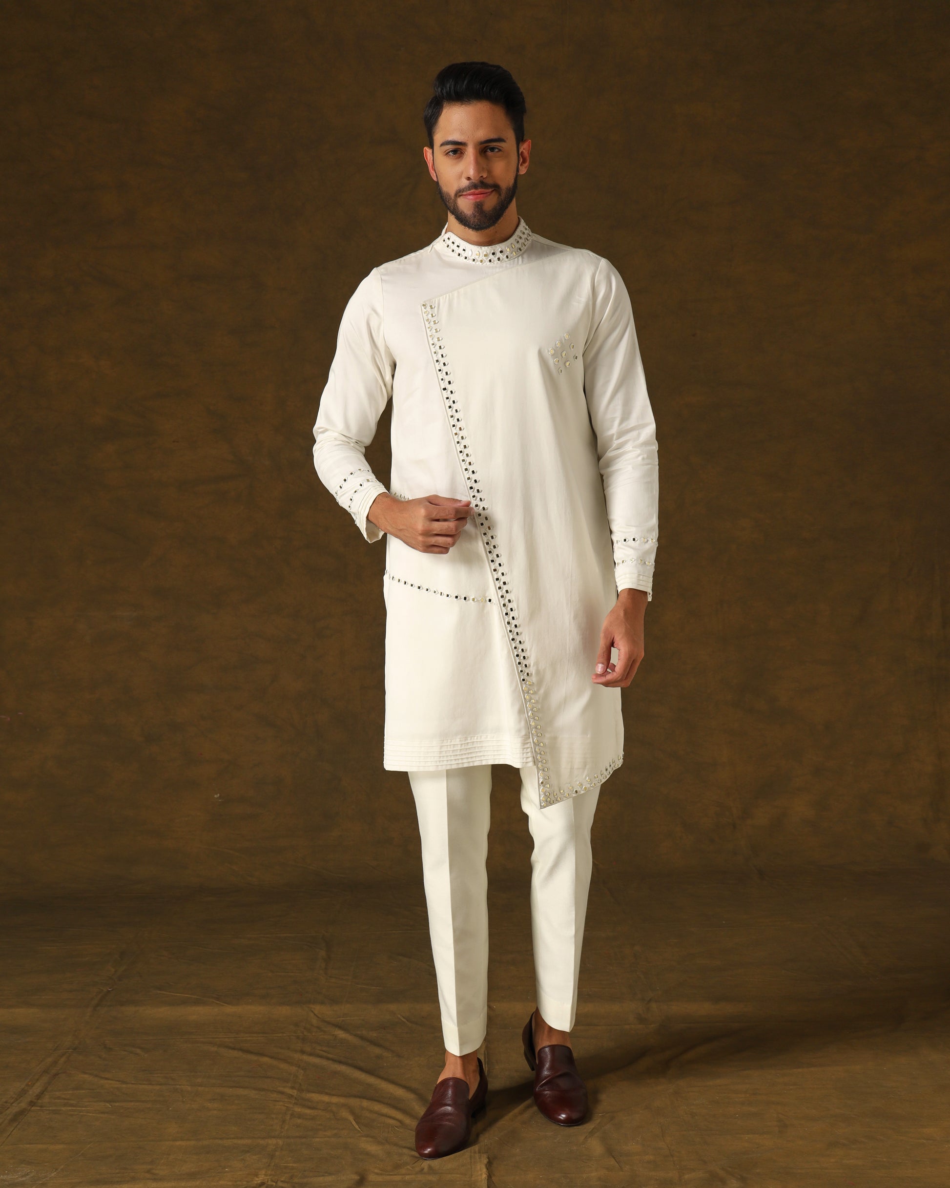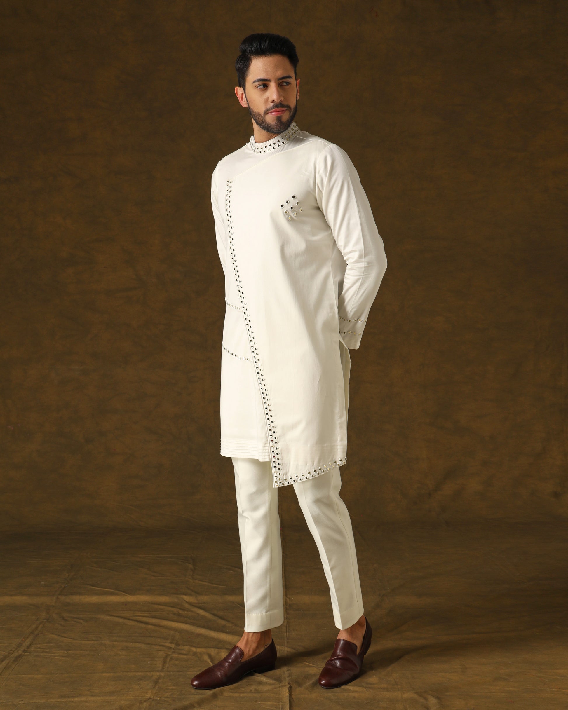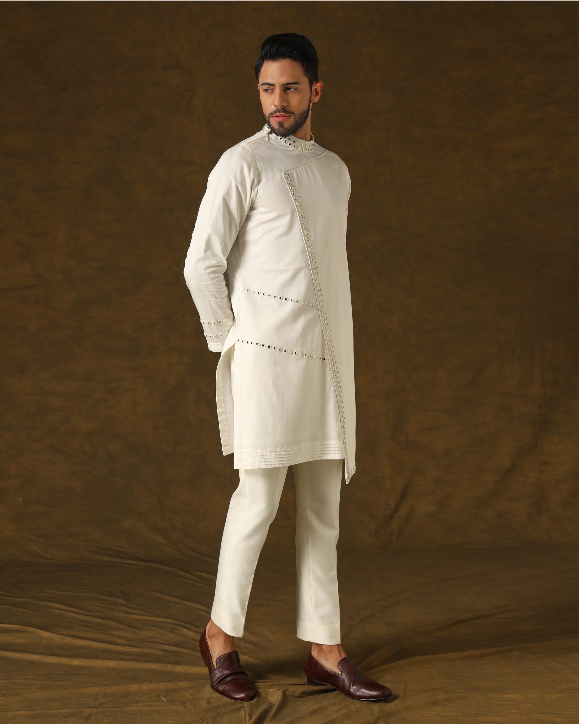 Ivory angrakha-style kurta, enhanced with mirrors on the neckline, pintucks at the hem, and delicate mirror-pintuck detailing on the sleeves. Complemented by matching ivory cigarette trousers for a coordinated look