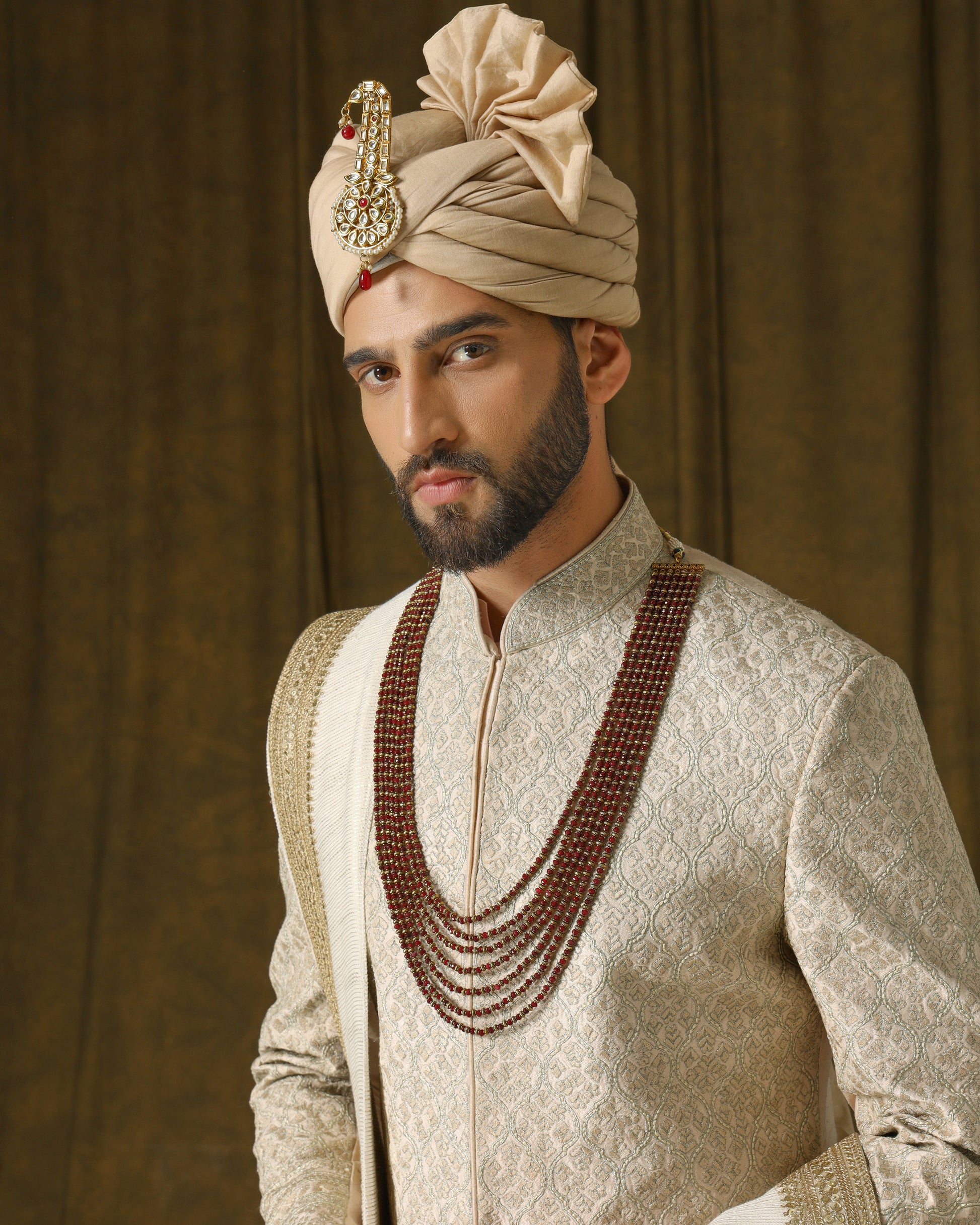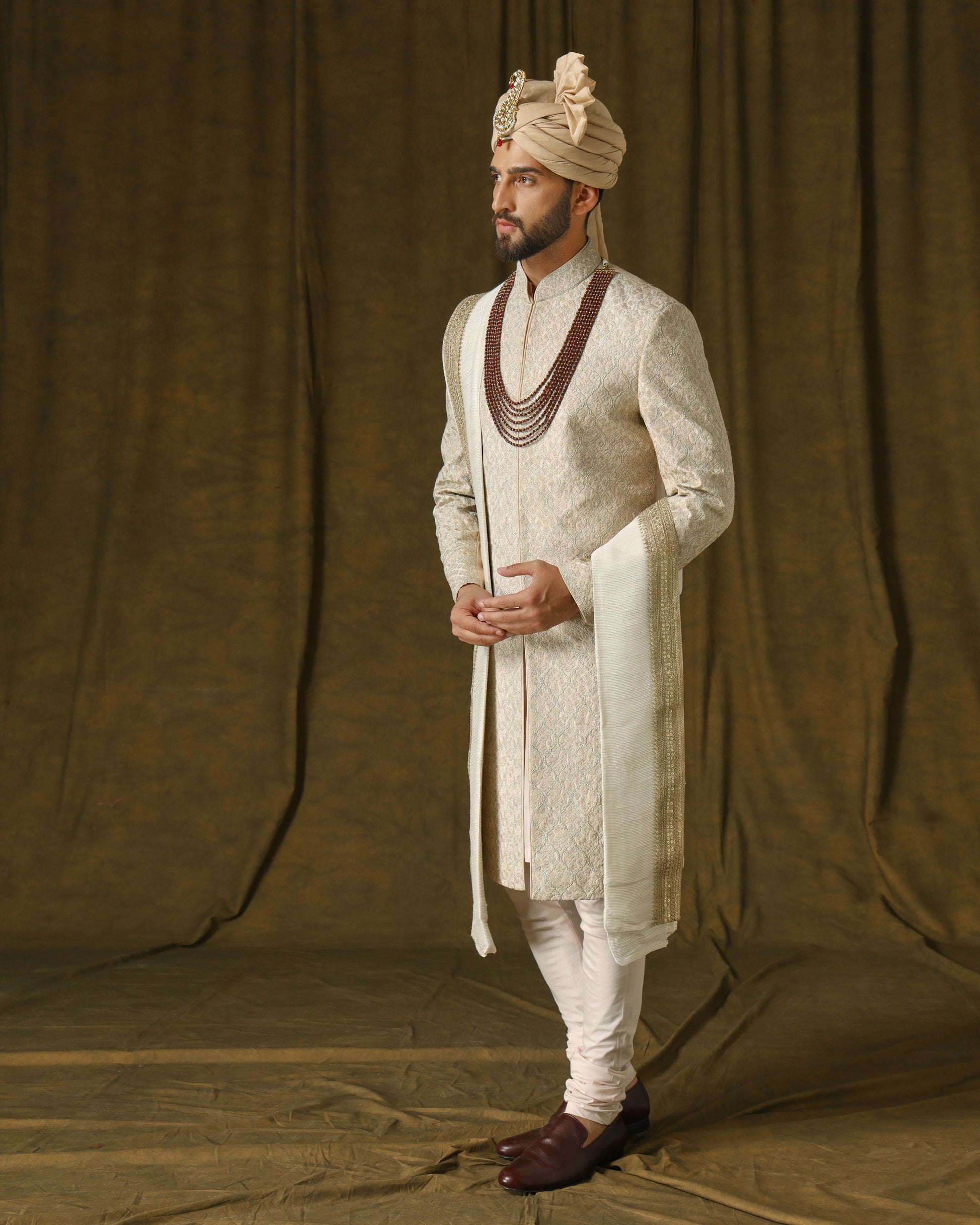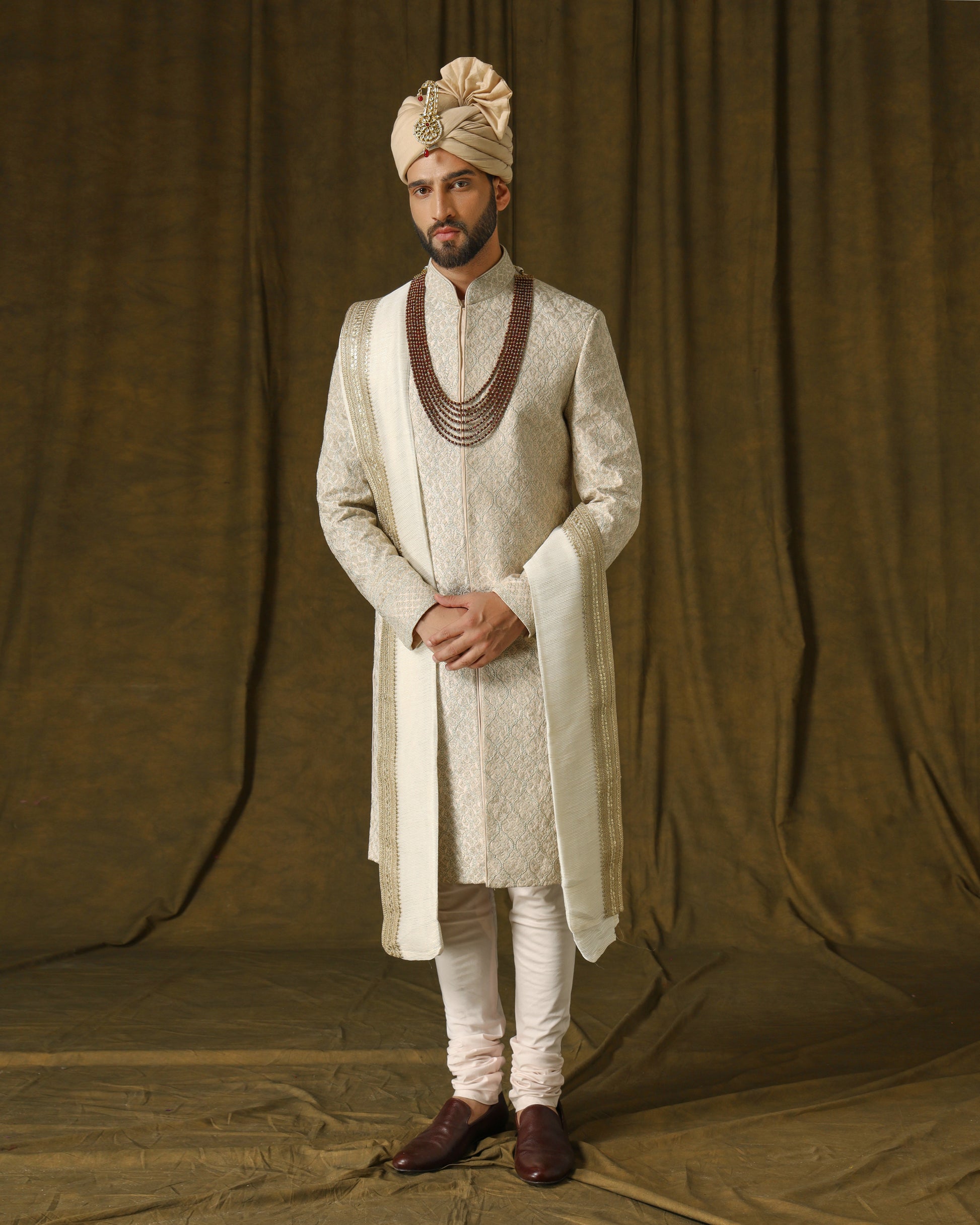 Exquisite handwoven silk sherwani in a soft coral hue, embellished with intricate embroidery using delicate blush threads and shimmering gold accents. Paired with an ivory dupatta adorned with a lavish golden embroidered border, exuding regal opulence.
