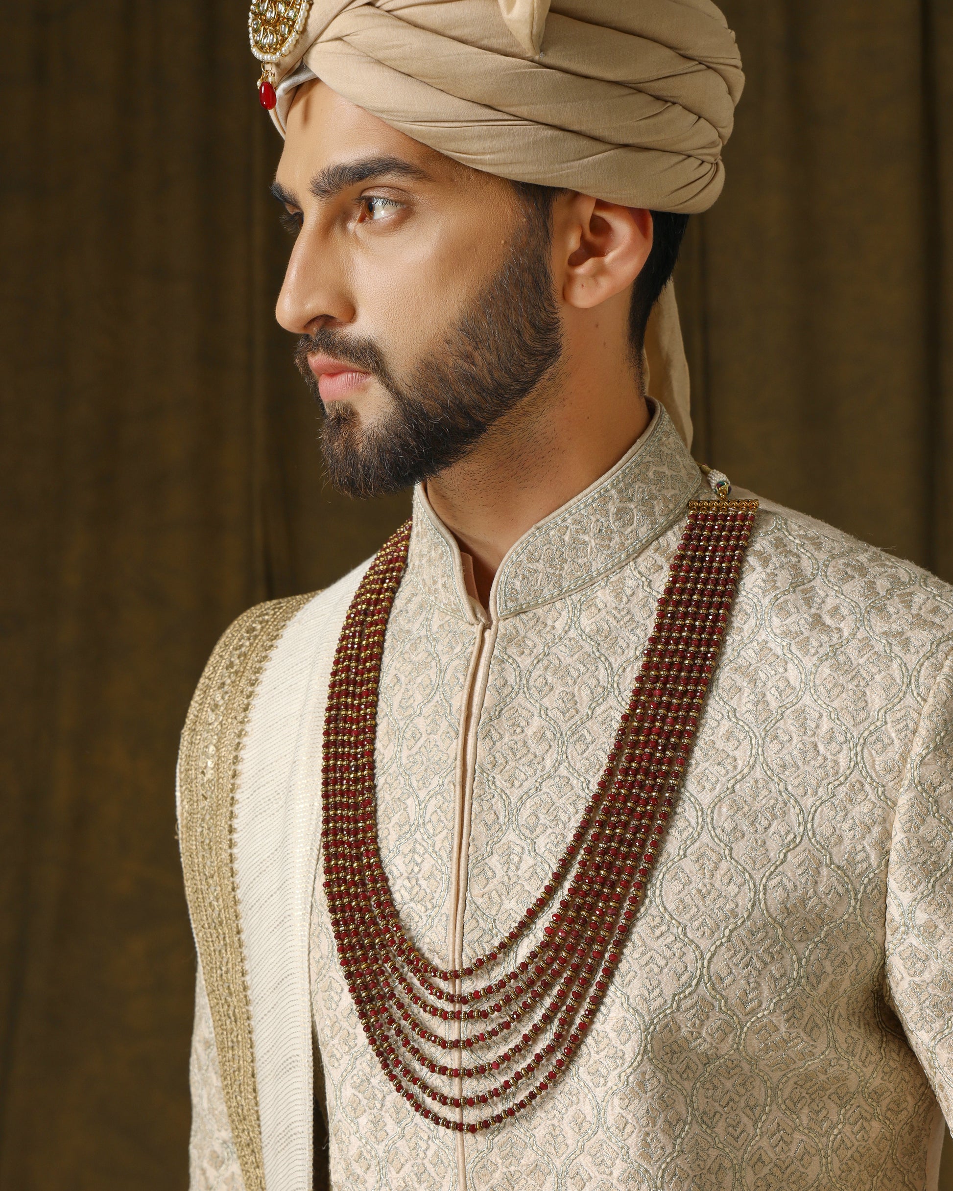 Coral silk sherwani, intricate gold embroidery