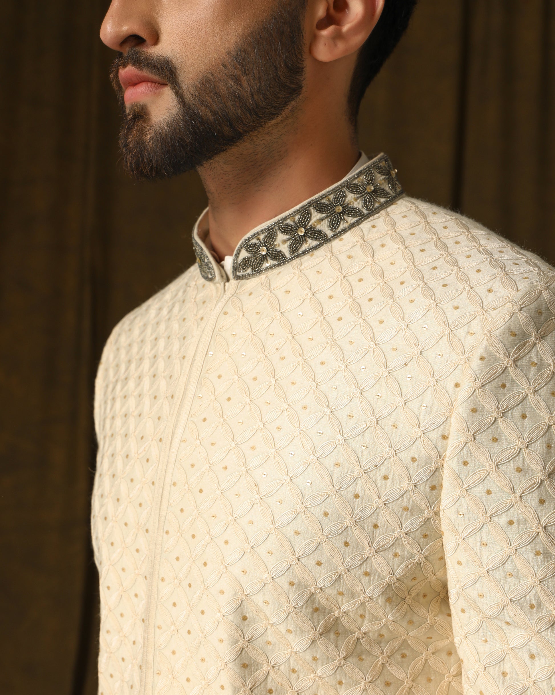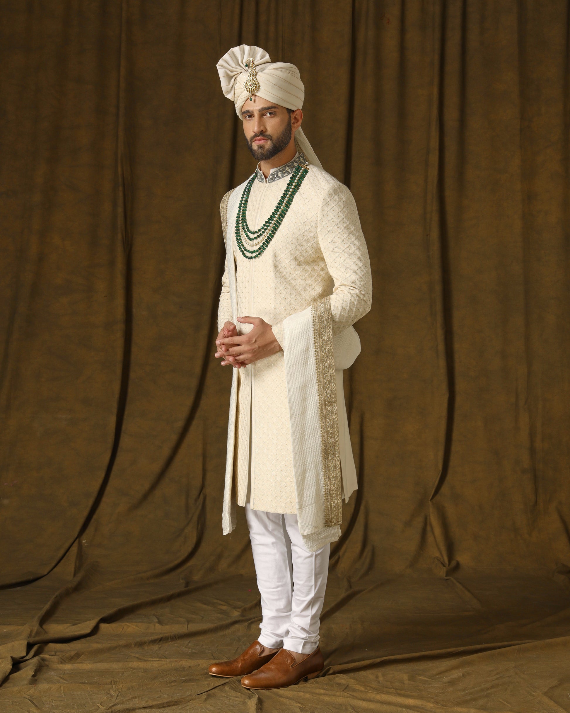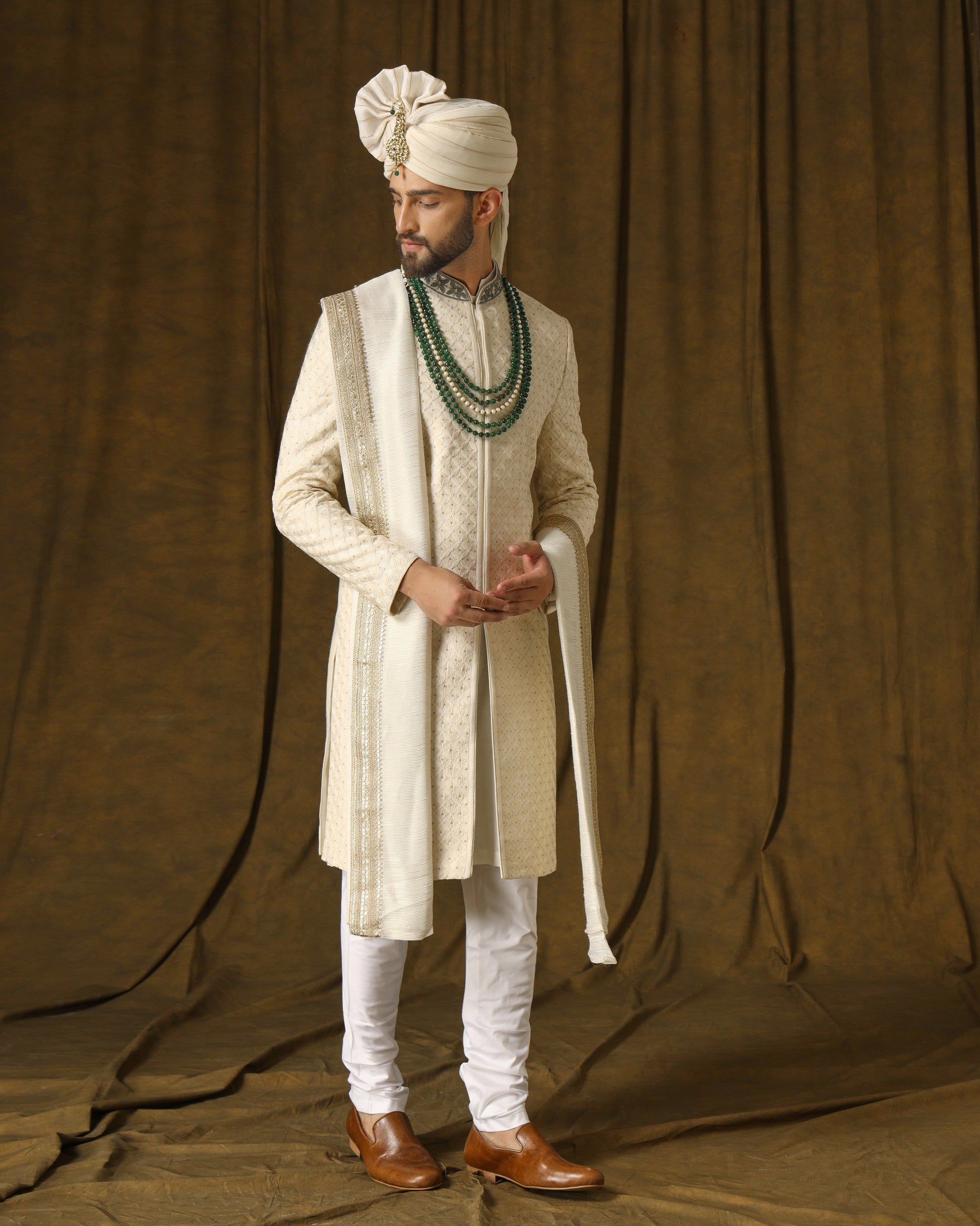 Elegant ivory handwoven sherwani adorned with intricate Indian heritage patterns in ivory silk thread. Paired harmoniously with white churidar and a heavenly golden-bordered dupatta, creating a timeless and regal ensemble.