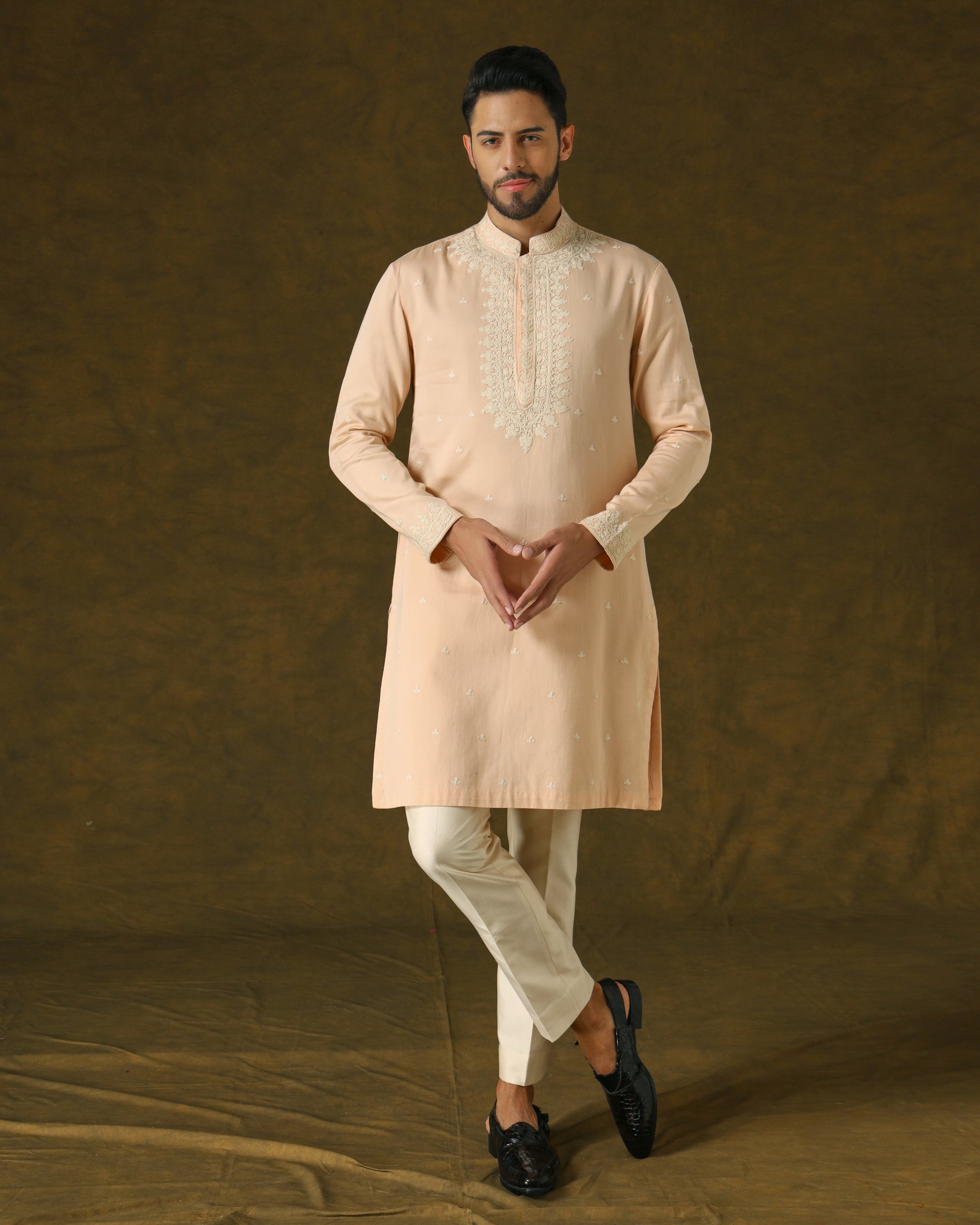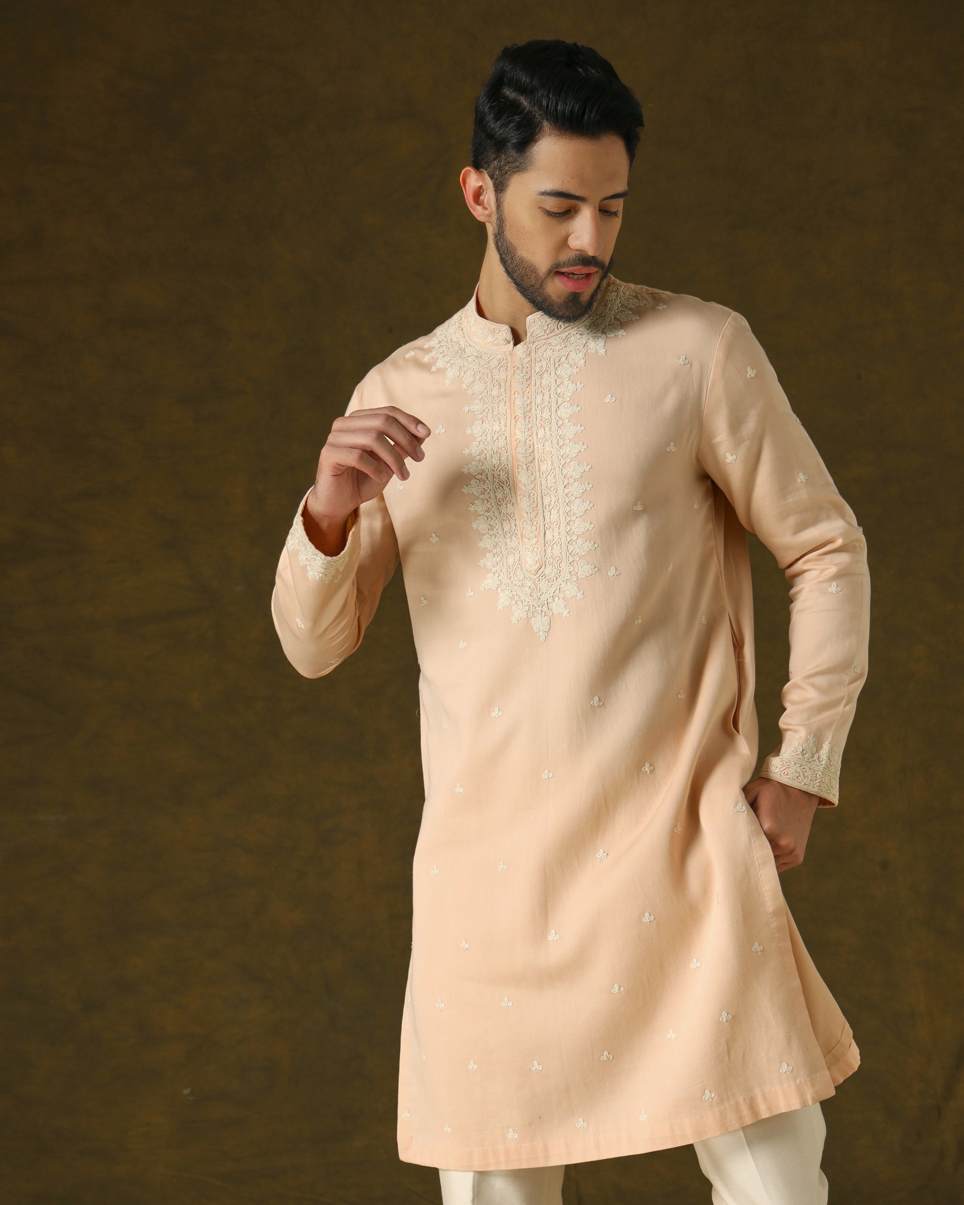 Peach kurta paired with ivory dress trousers. Embroidered in ivory silk on placket and around with scattered bootas, exuding subtle elegance and charm.