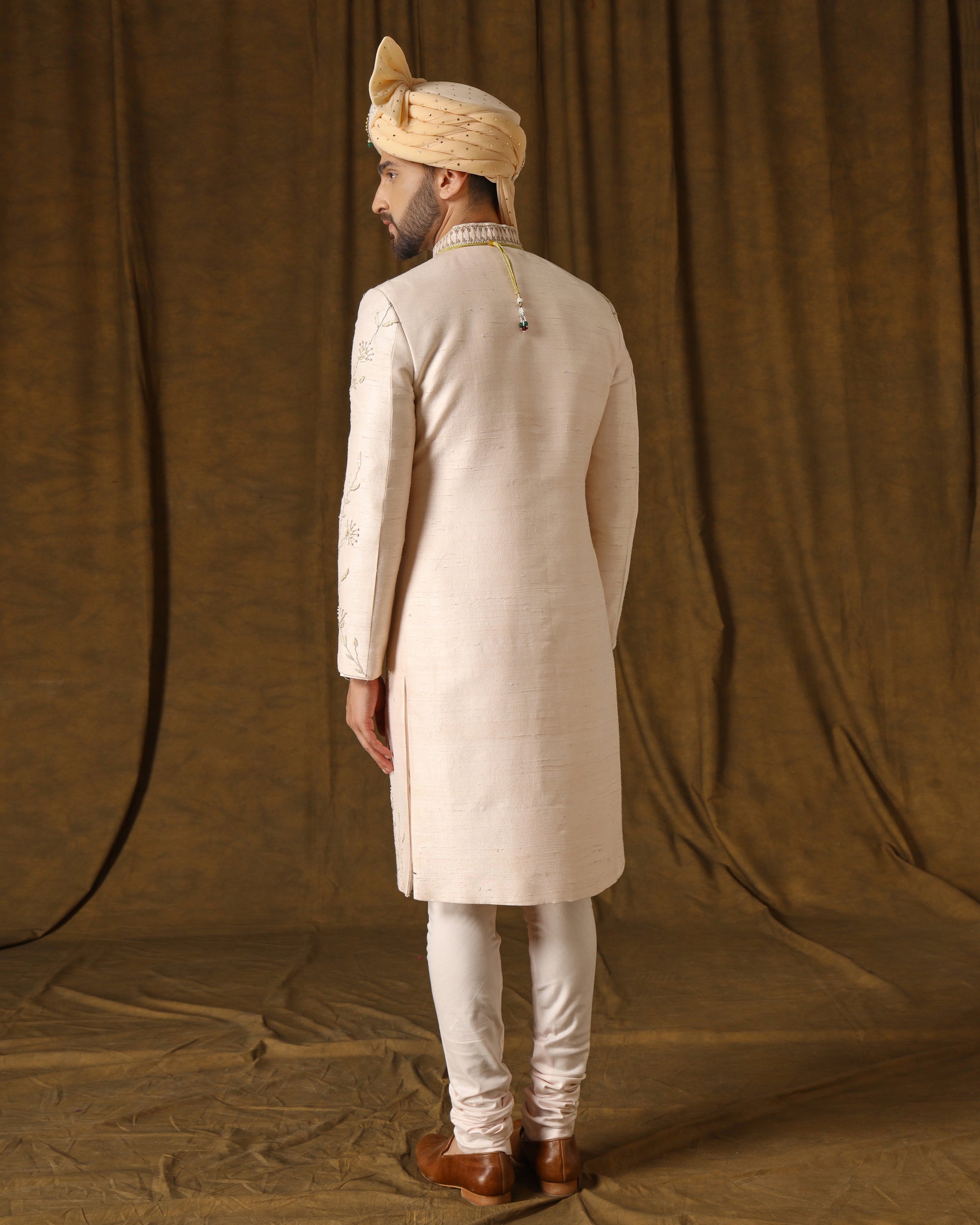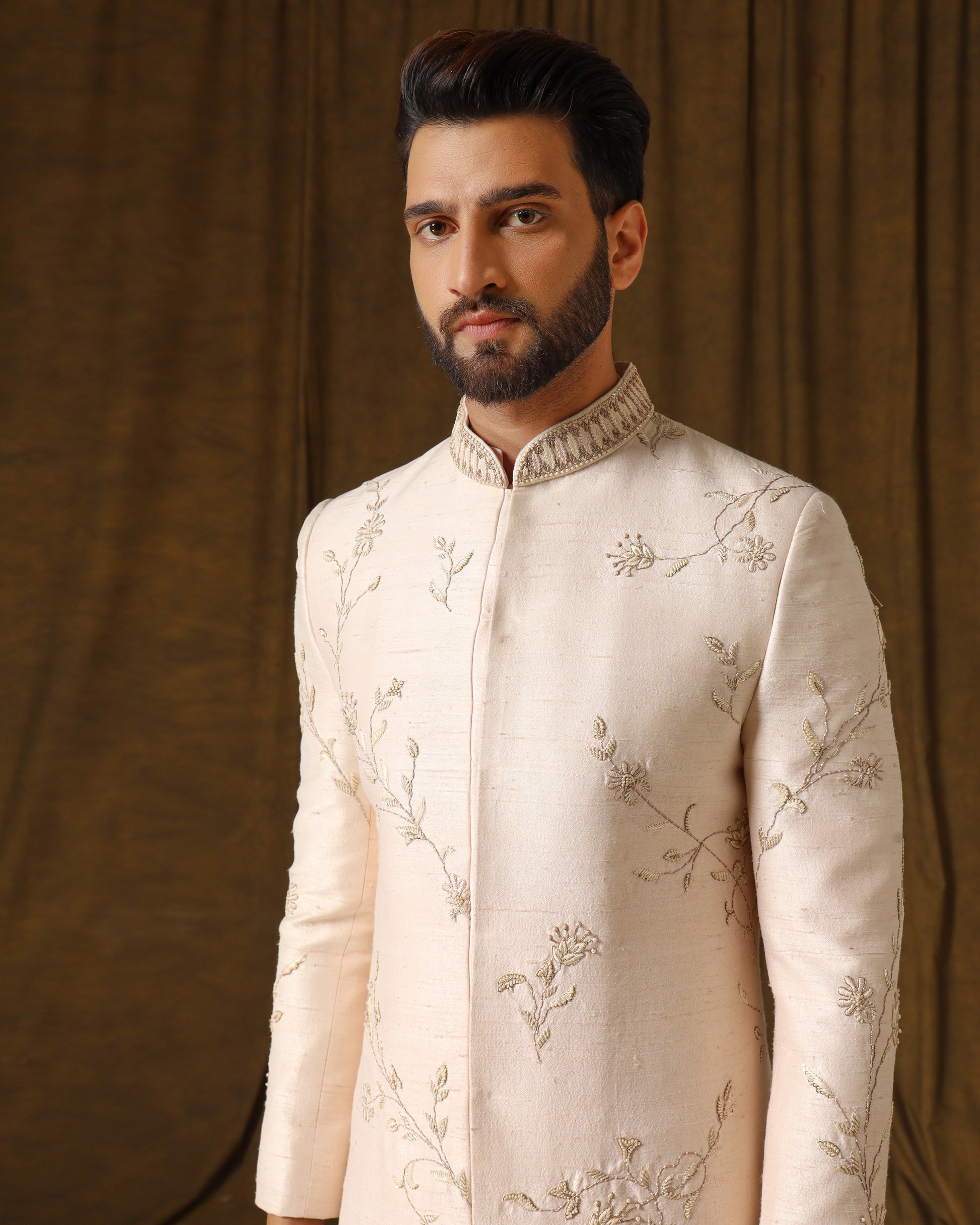 Blush peach handwoven sherwani, intricate threadwork graced with subtle gold hints. Accompanied by a soft, embellished dupatta, capturing the essence of contemporary regal finesse."