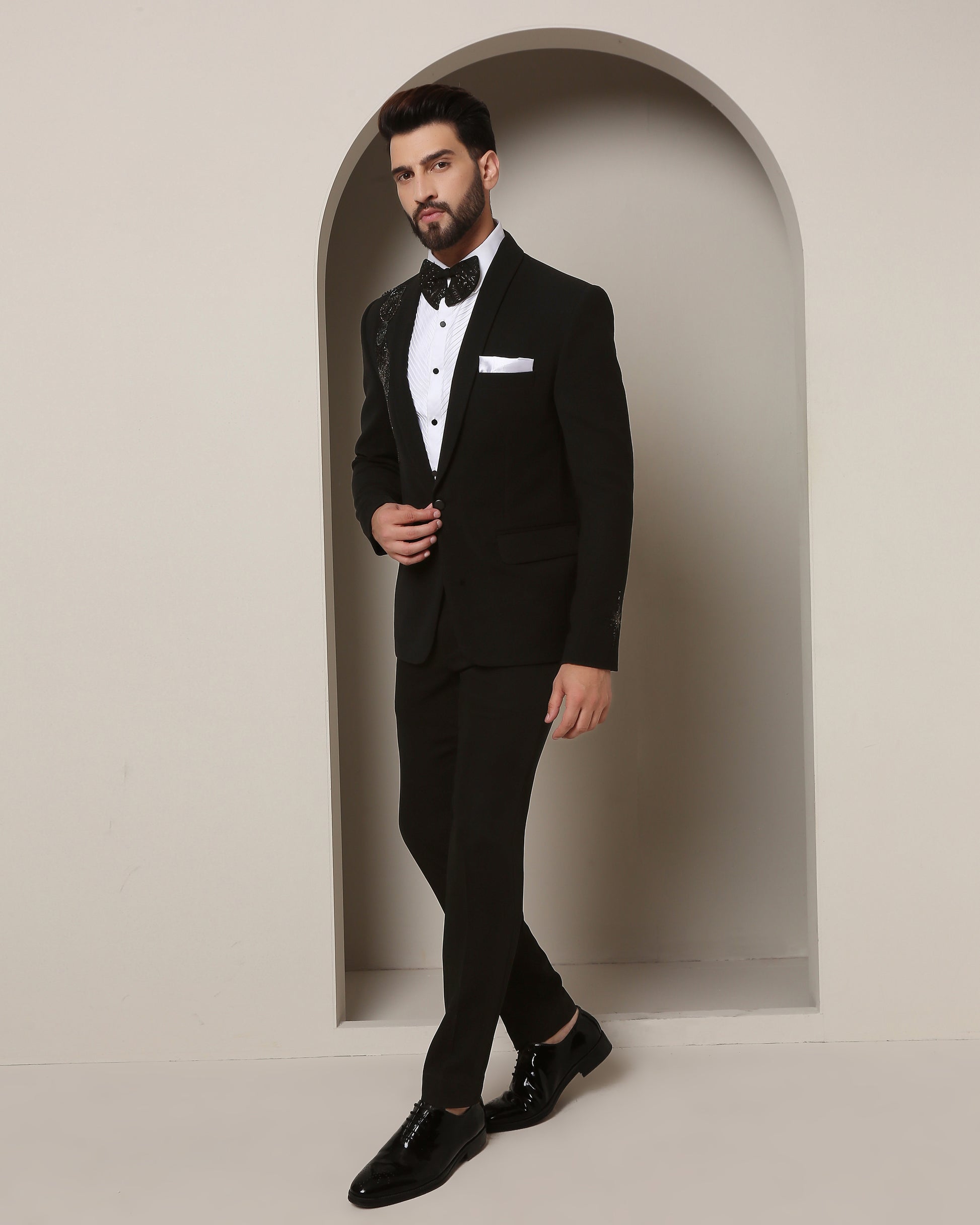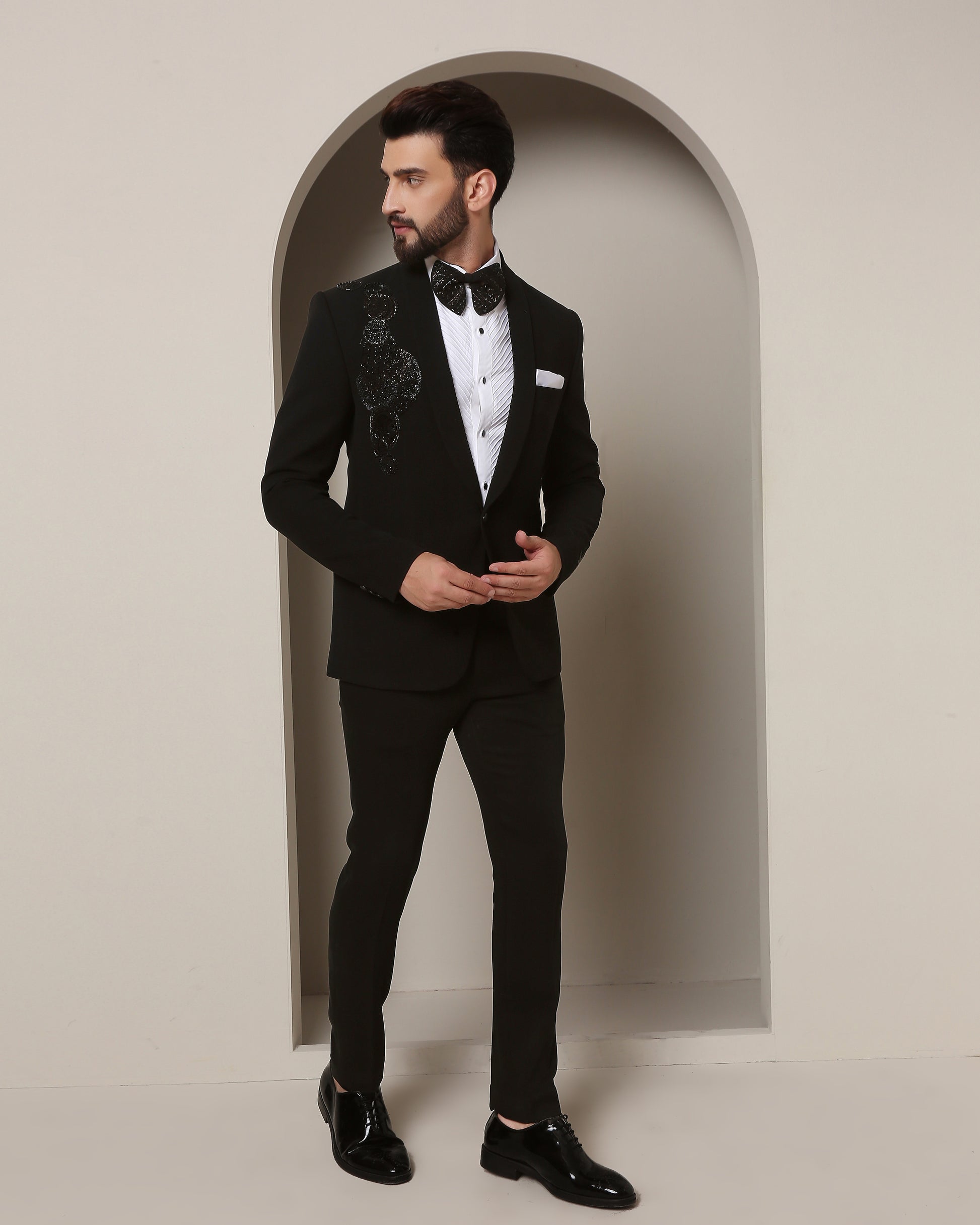 Sleek Cosmic Tuxedo's Enchanting Details