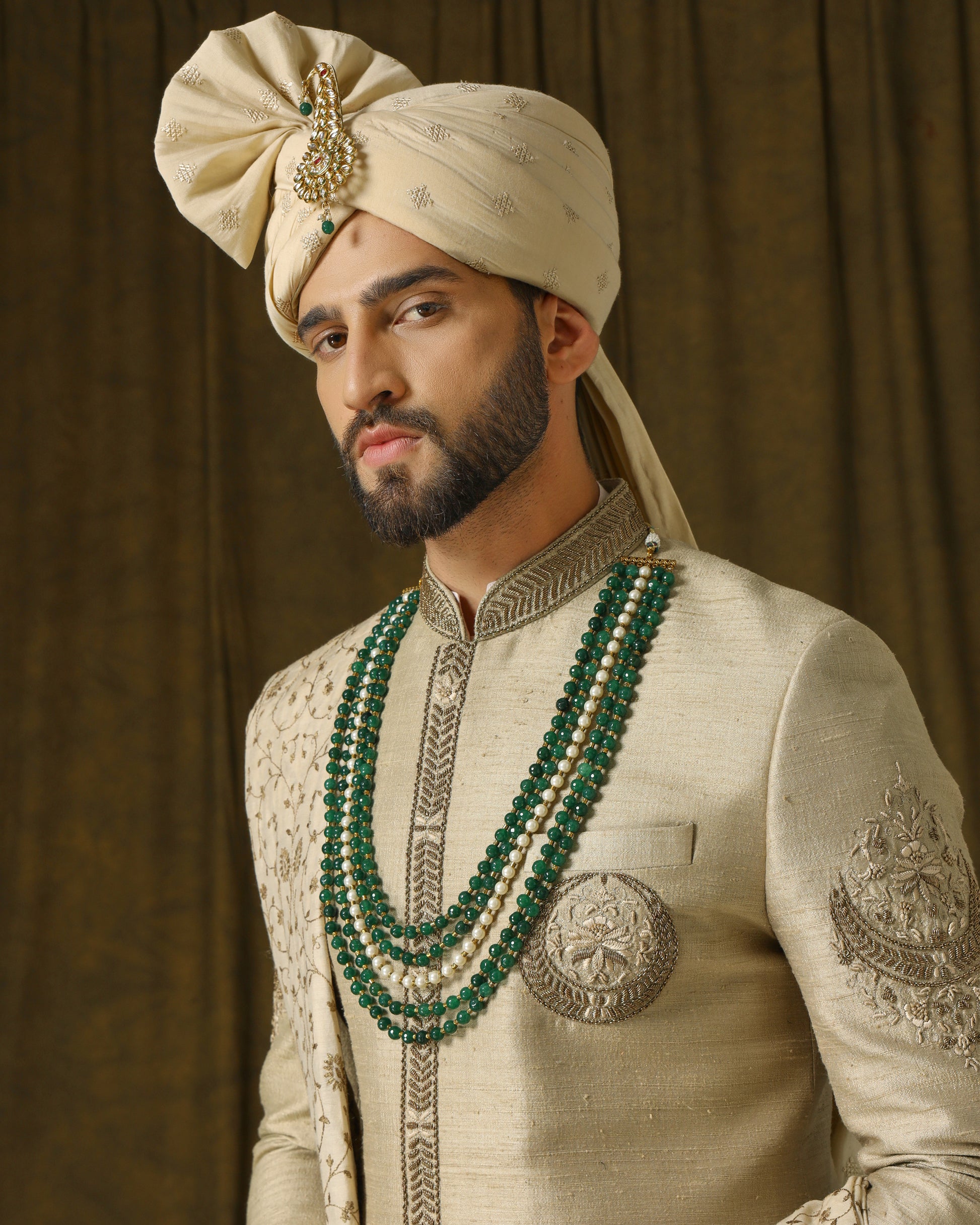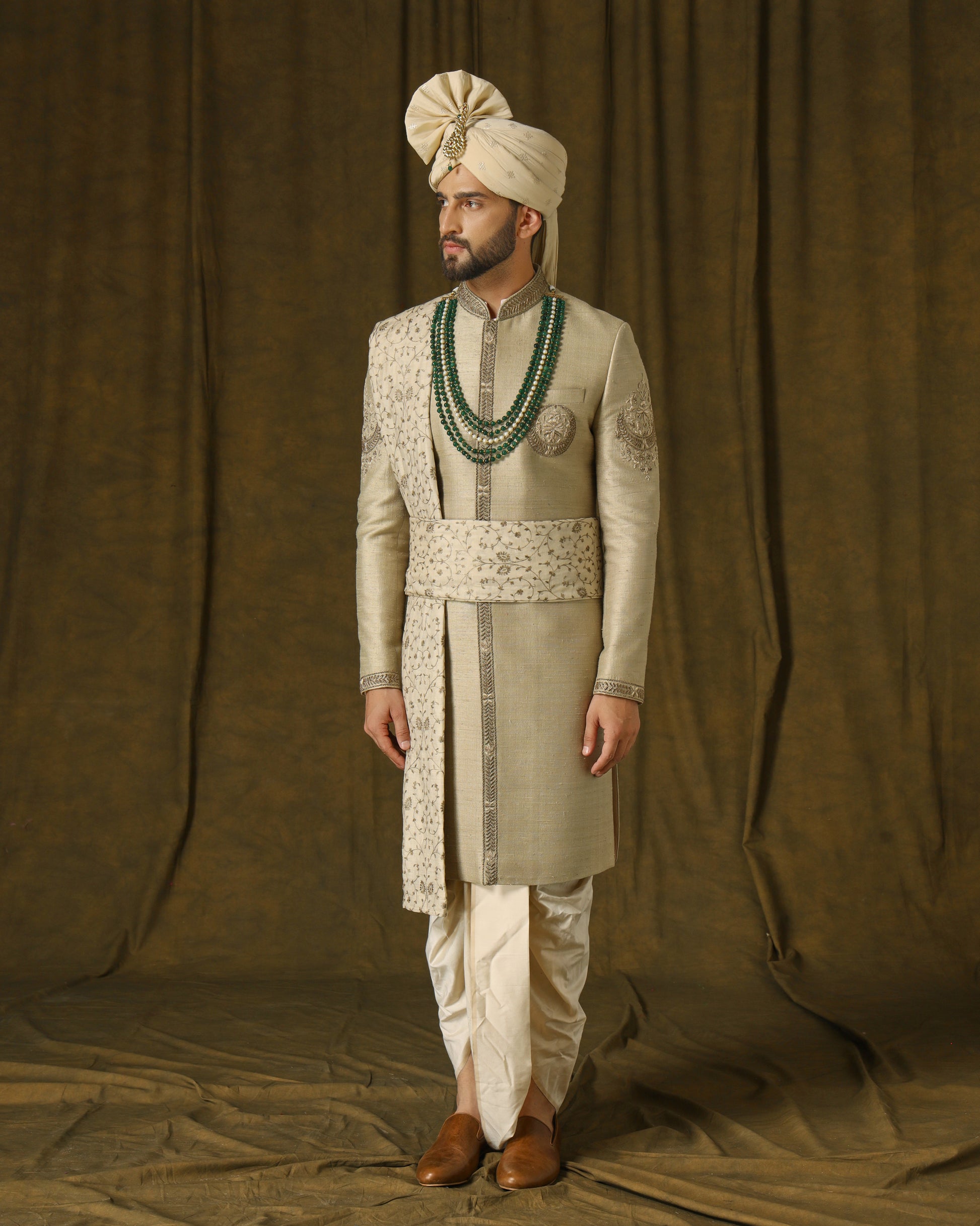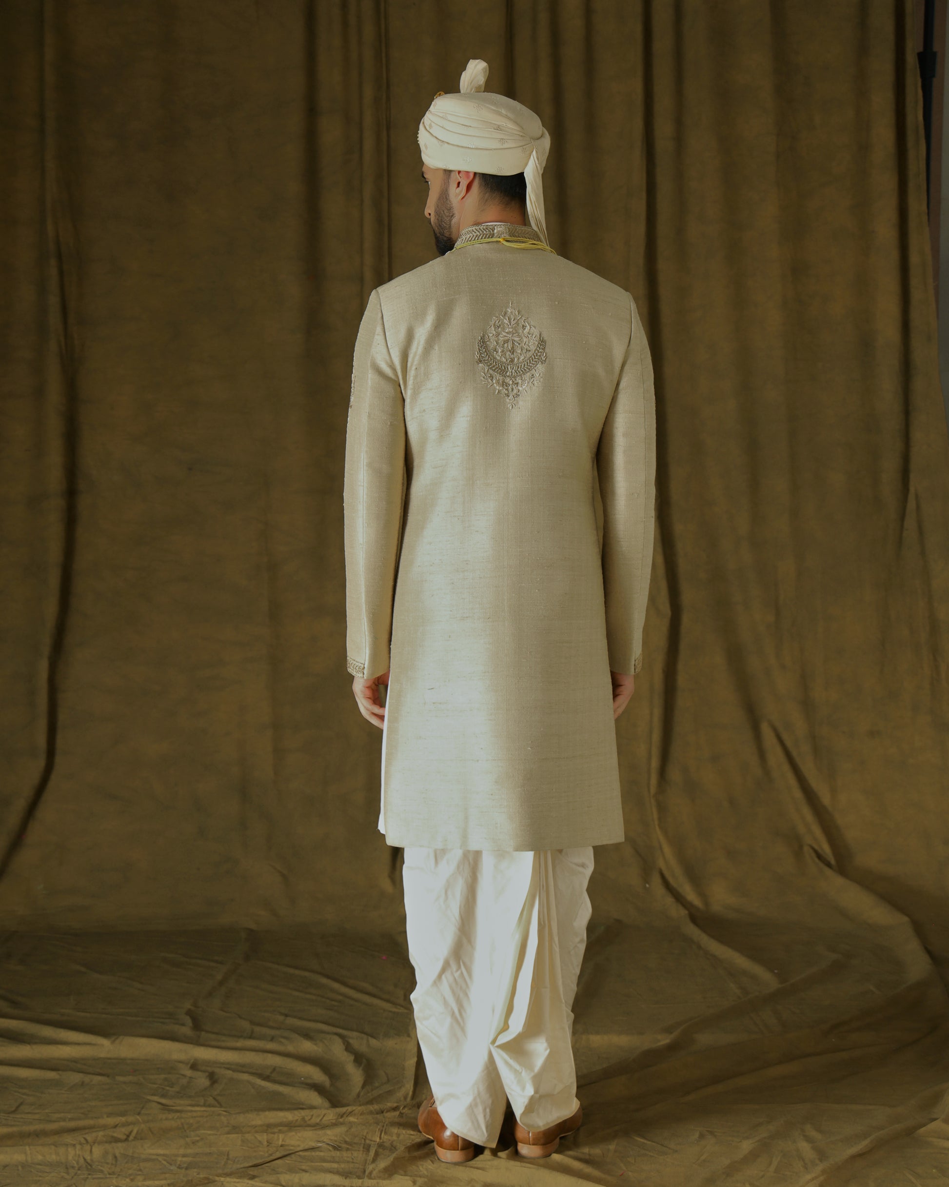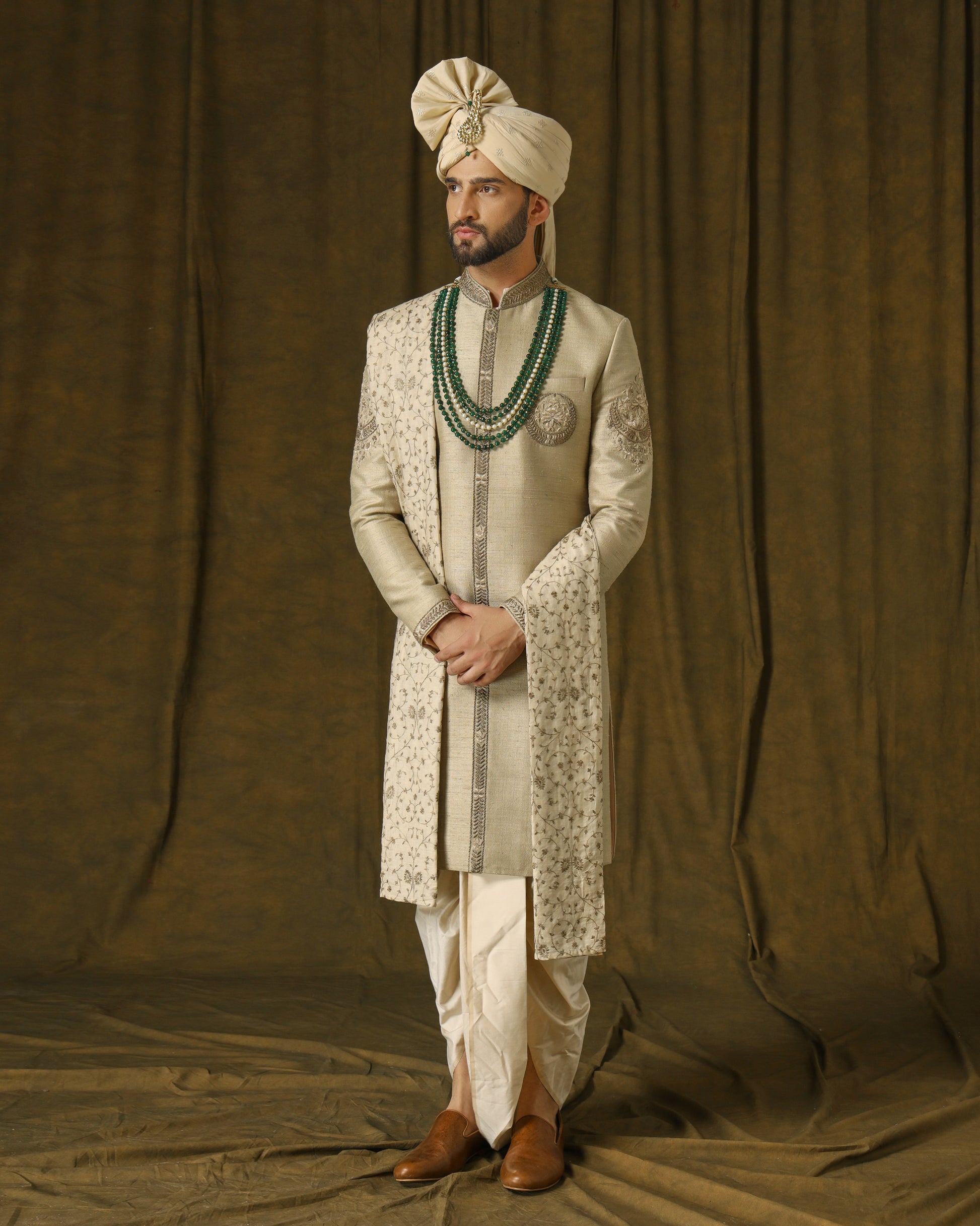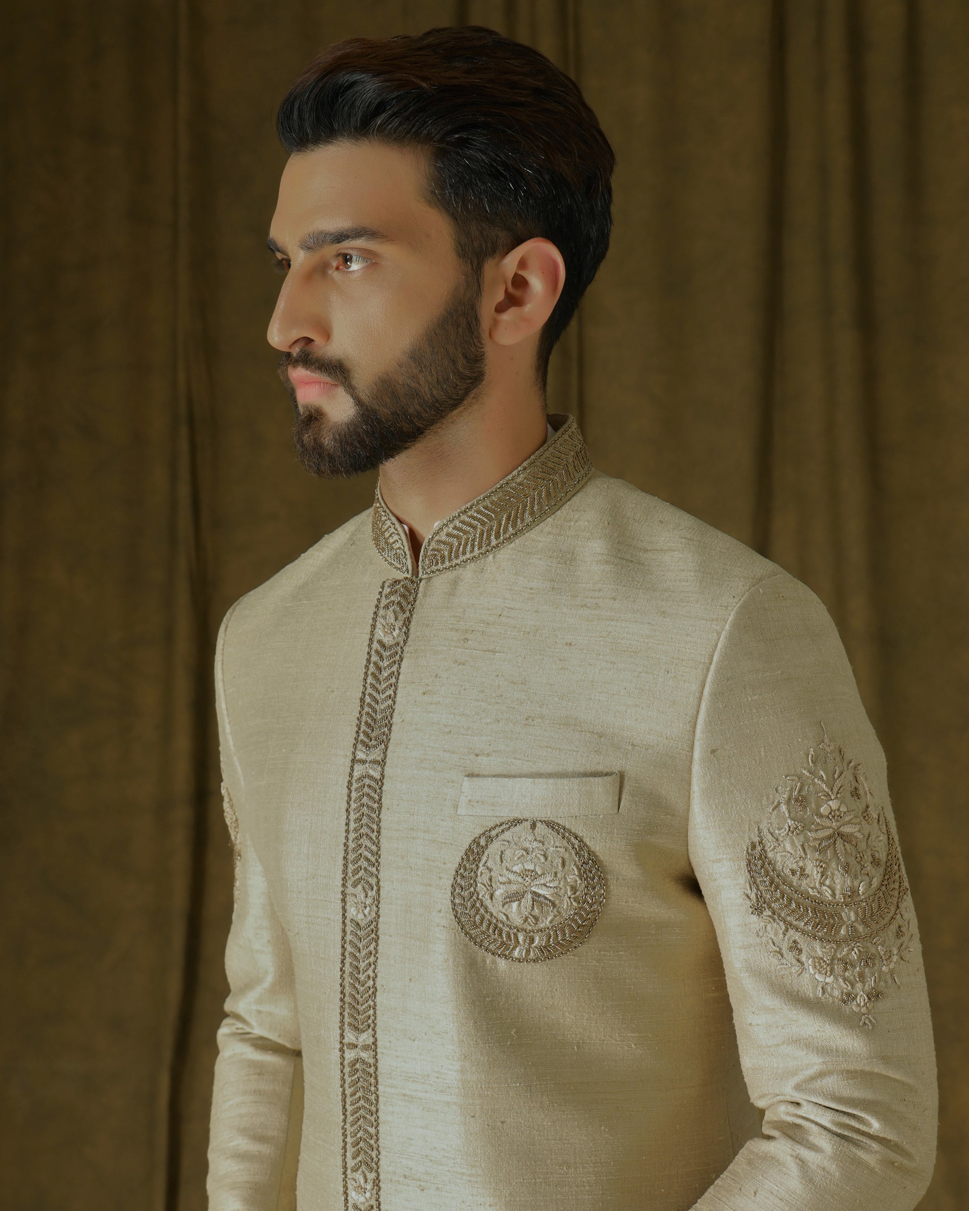 Elegant sand-colored handwoven sherwani, meticulously embroidered on front, chest, sleeves, and back with intricate bootas. Complemented by a heavenly all-over embroidered handwoven dupatta and paired exquisitely with a dhoti.