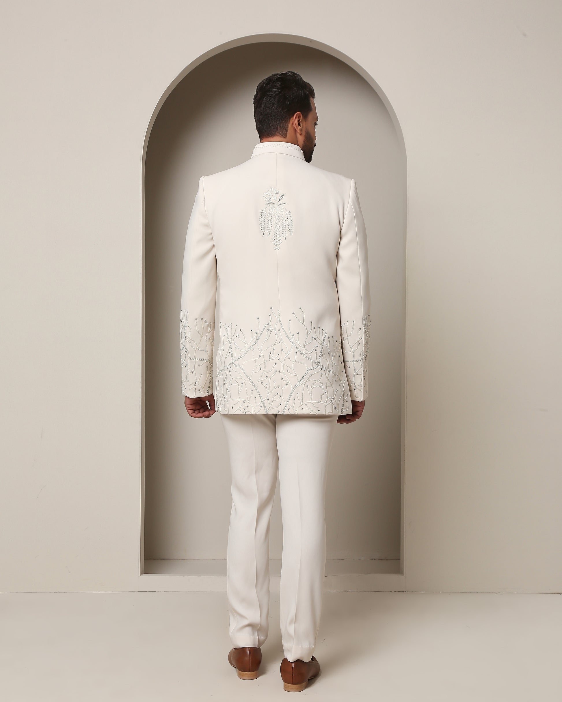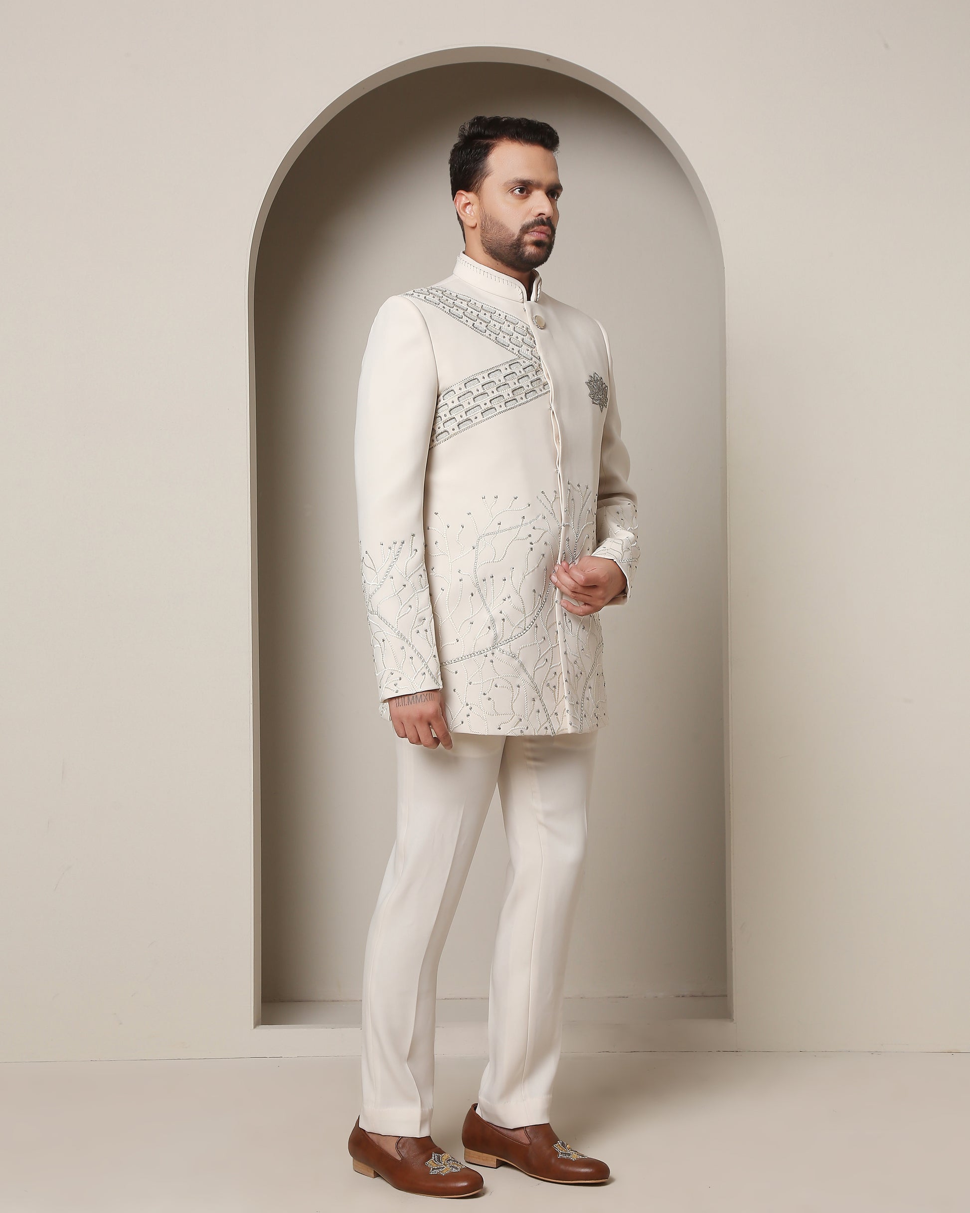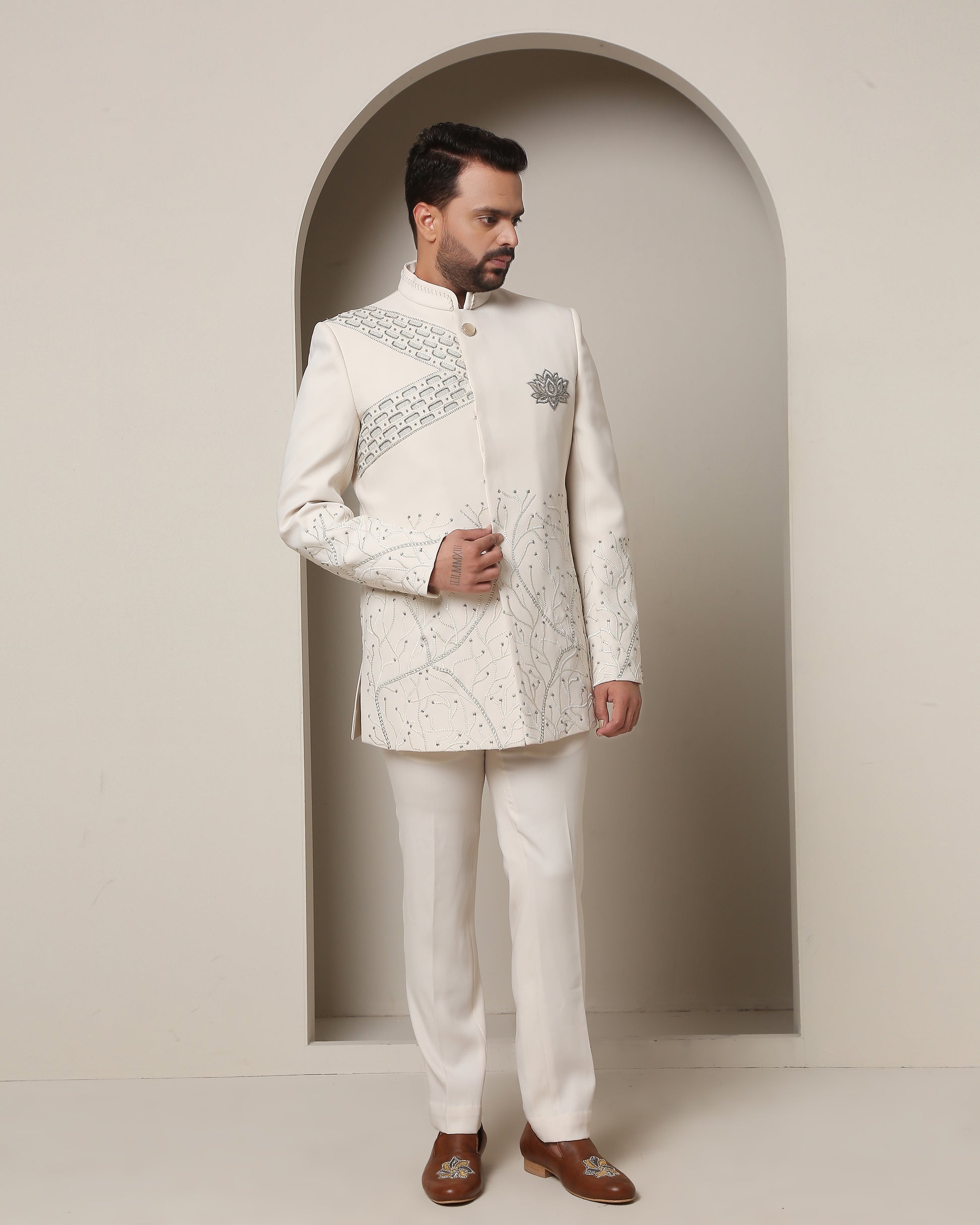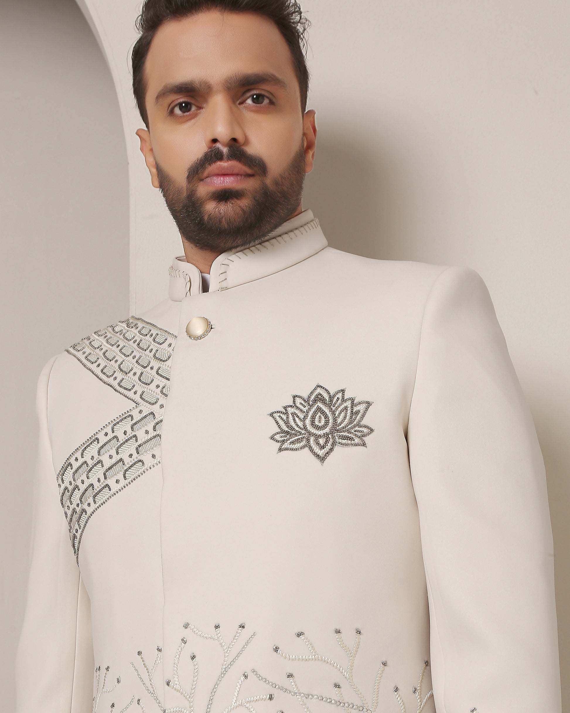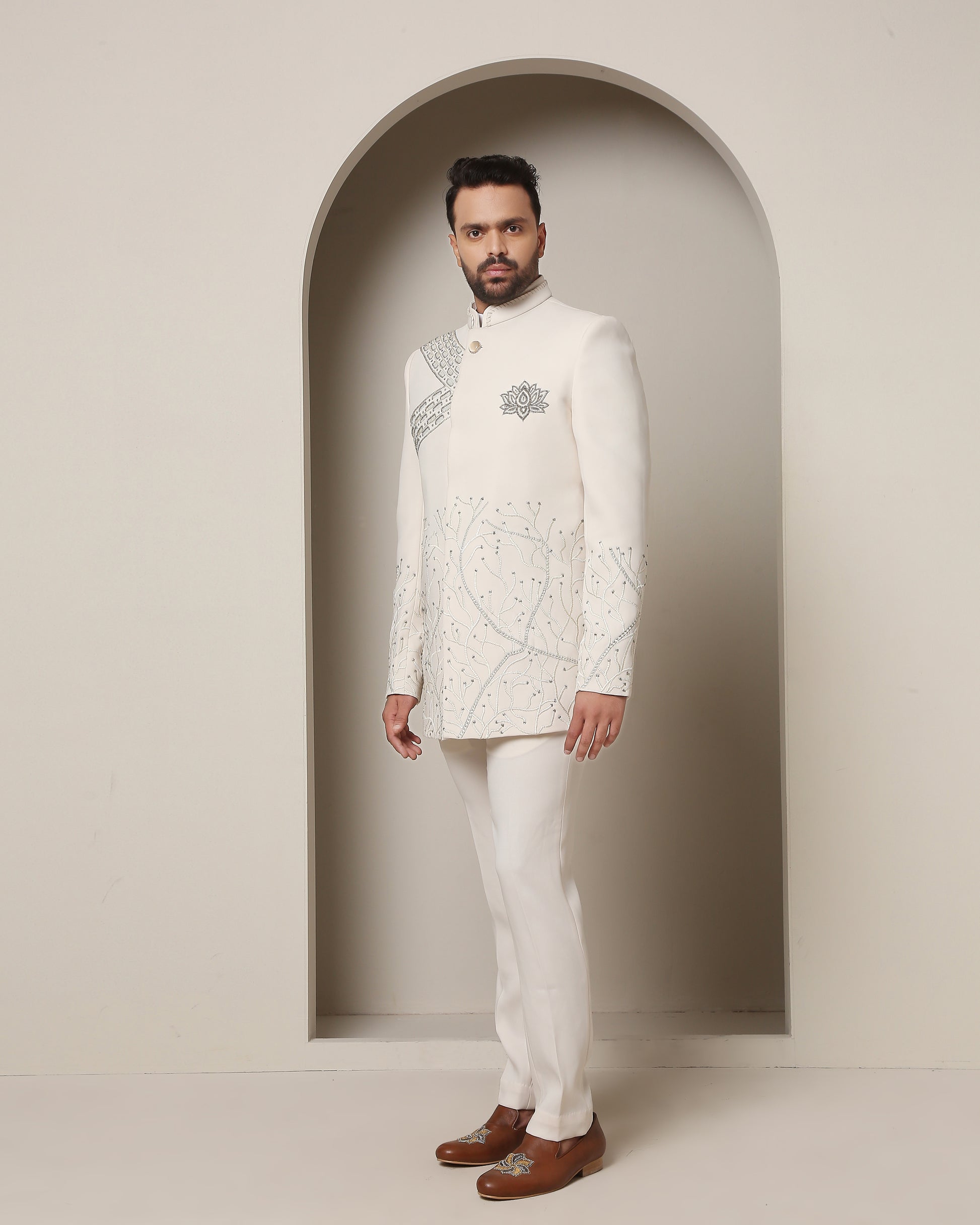 An ivory bandhgala, resplendent in silk ivory threads, masterfully showcases a lotus emblem. Silver beads accentuate the intricate embroidery, radiating regal charm. Perfectly matched with trousers of the same grace.