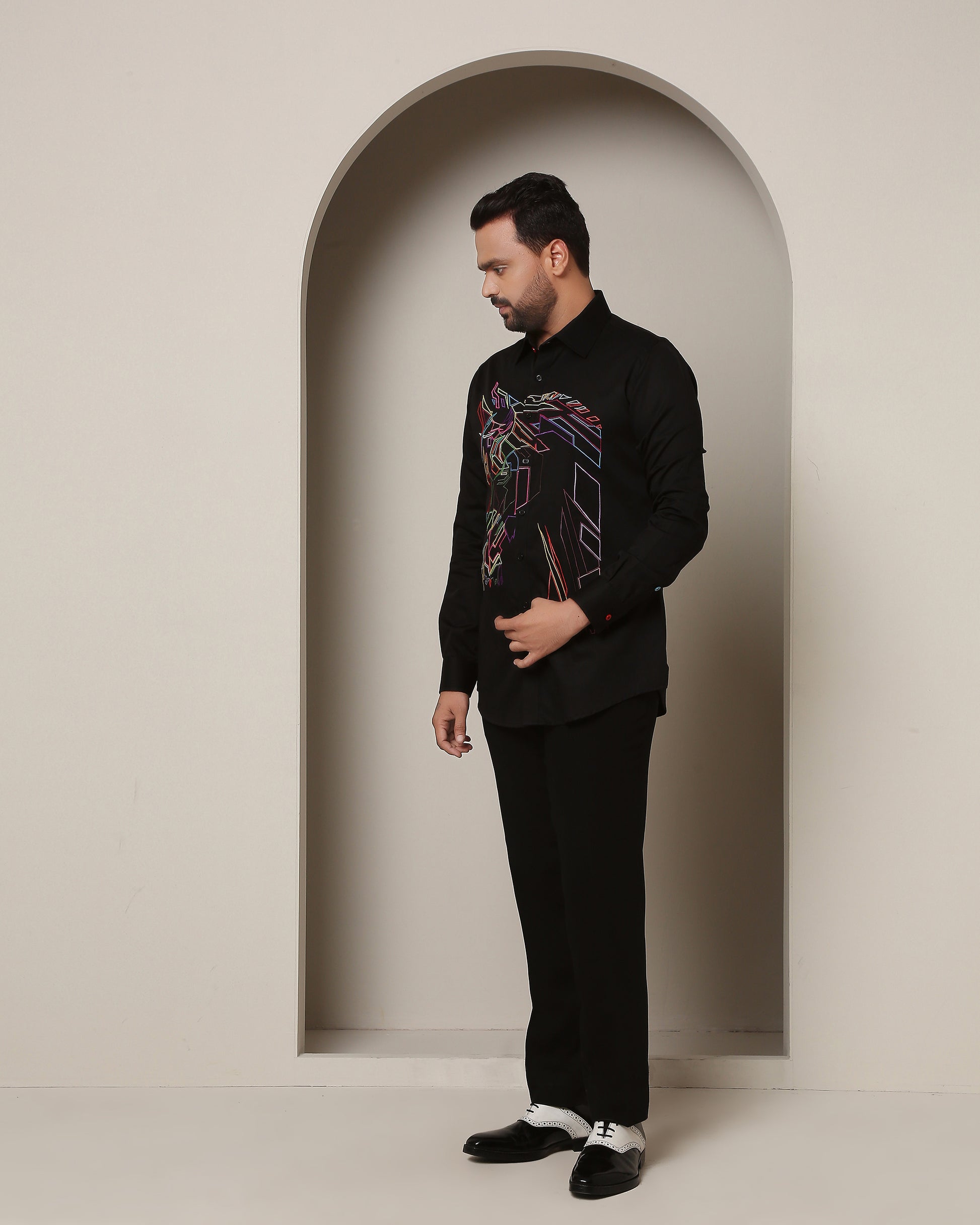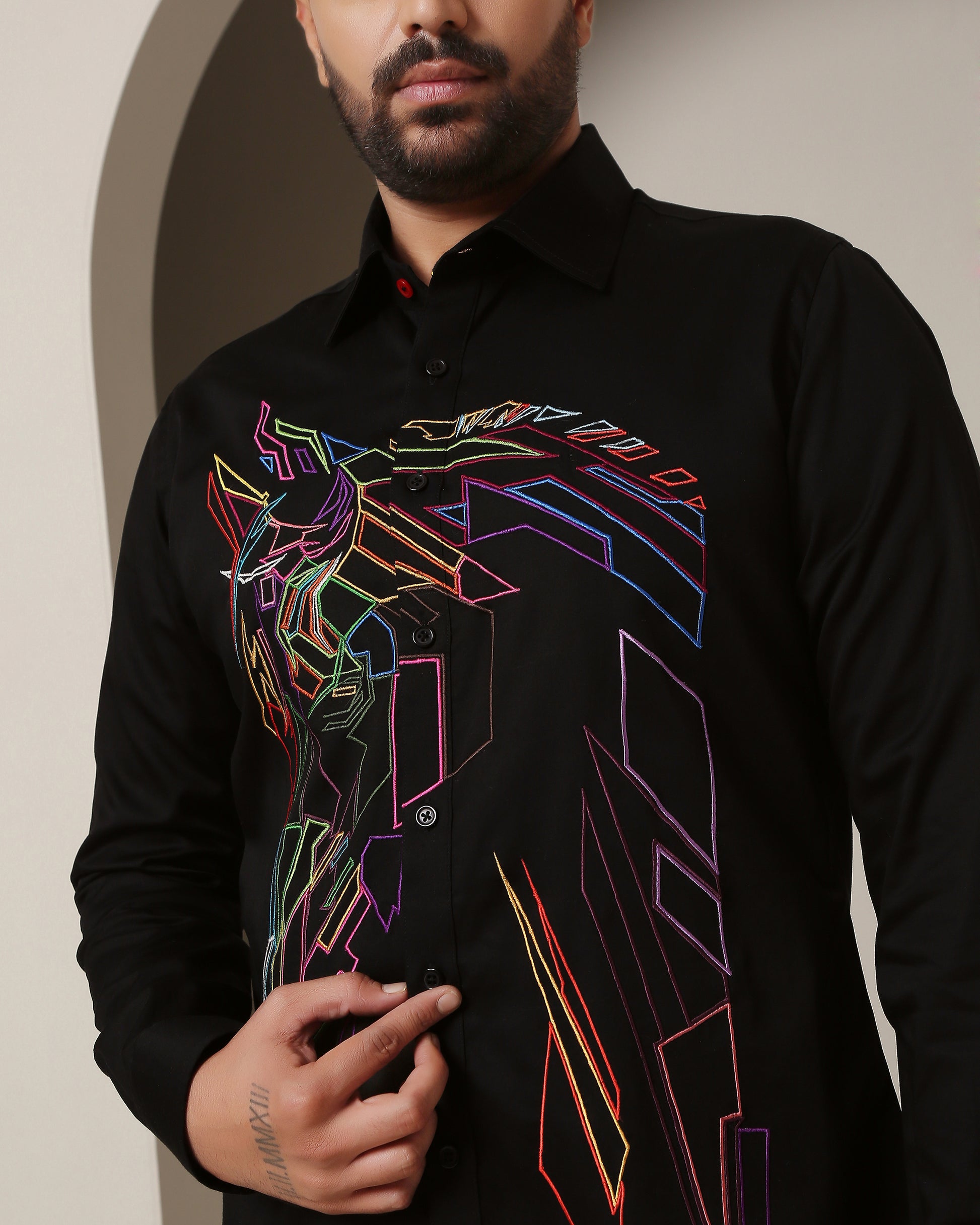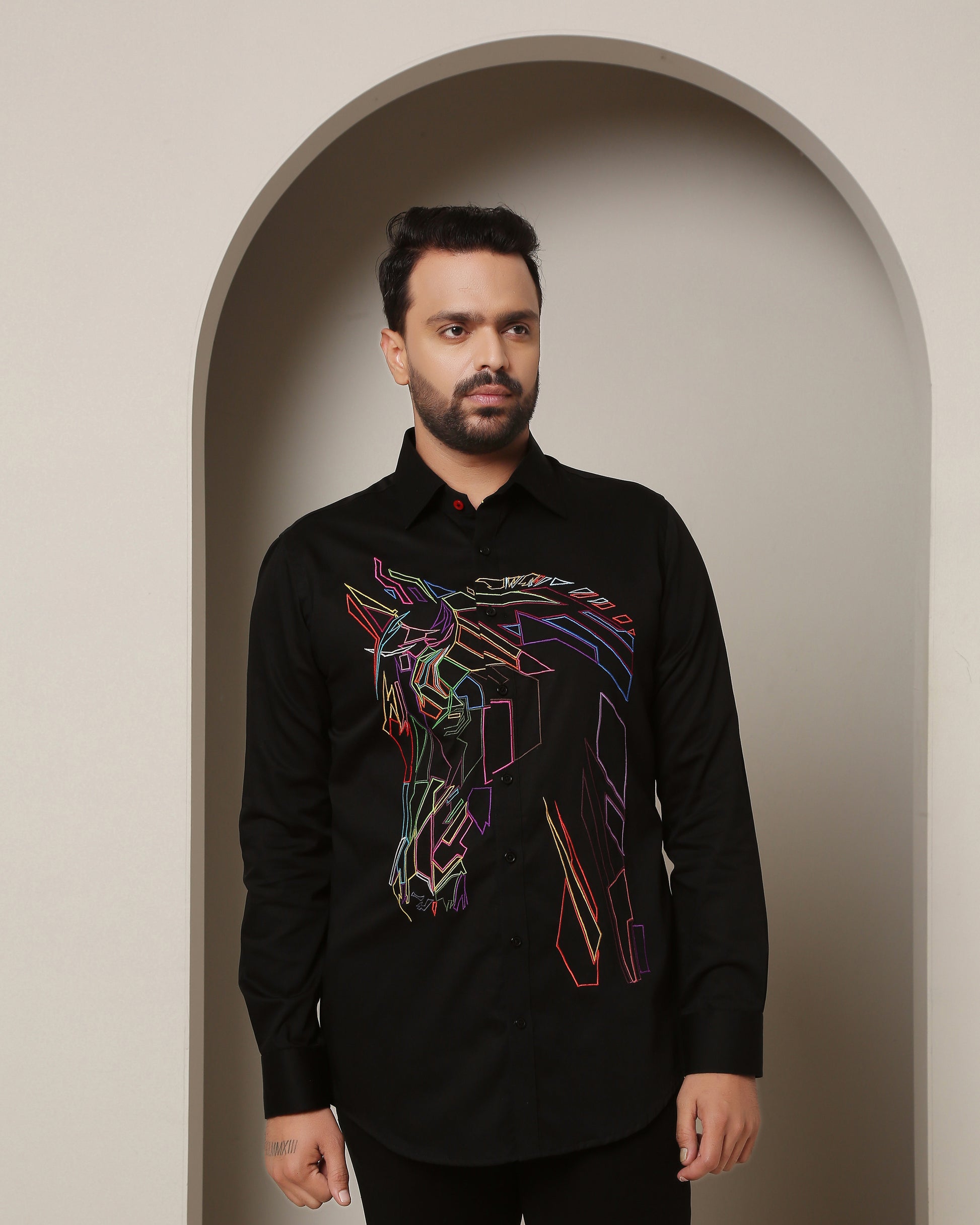 A canvas of obsidian adorned with a vividly embroidered, multicolored horse—a symphony of style and artistry