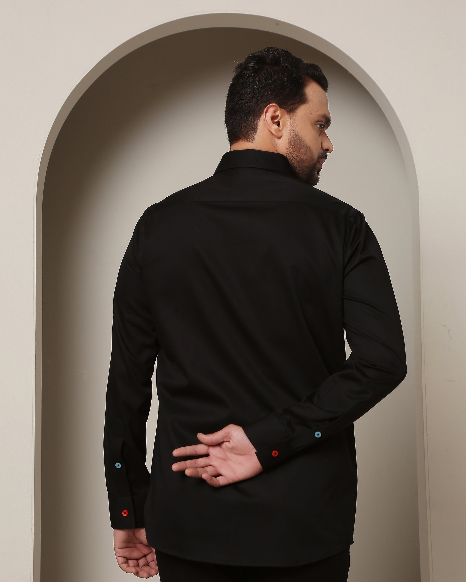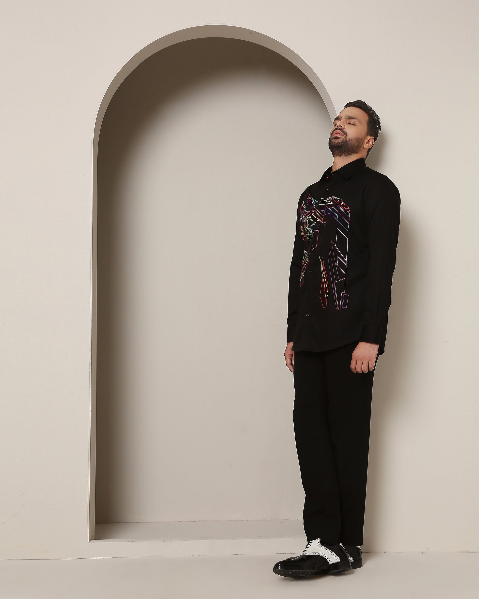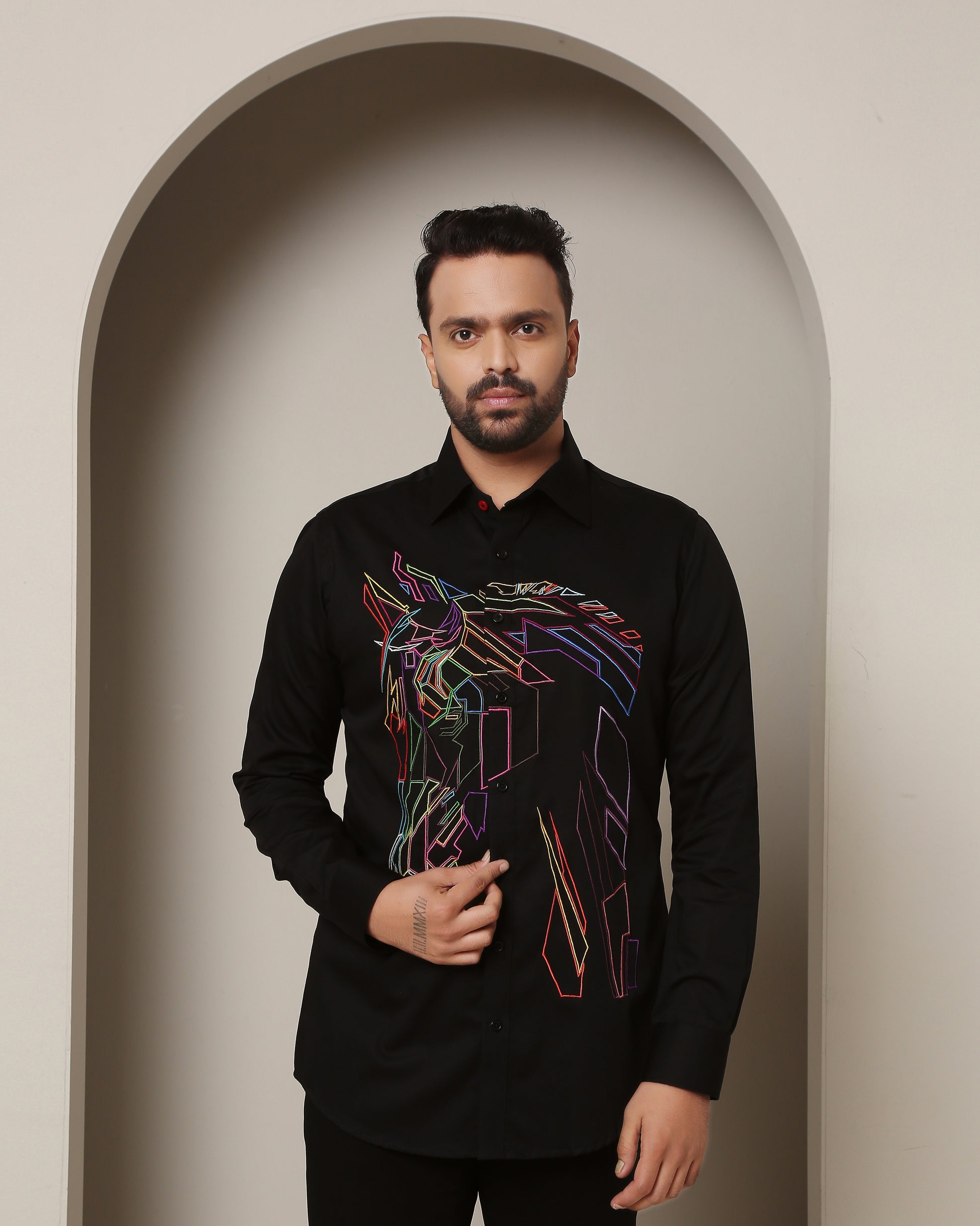A canvas of obsidian adorned with a vividly embroidered, multicolored horse—a symphony of style and artistry