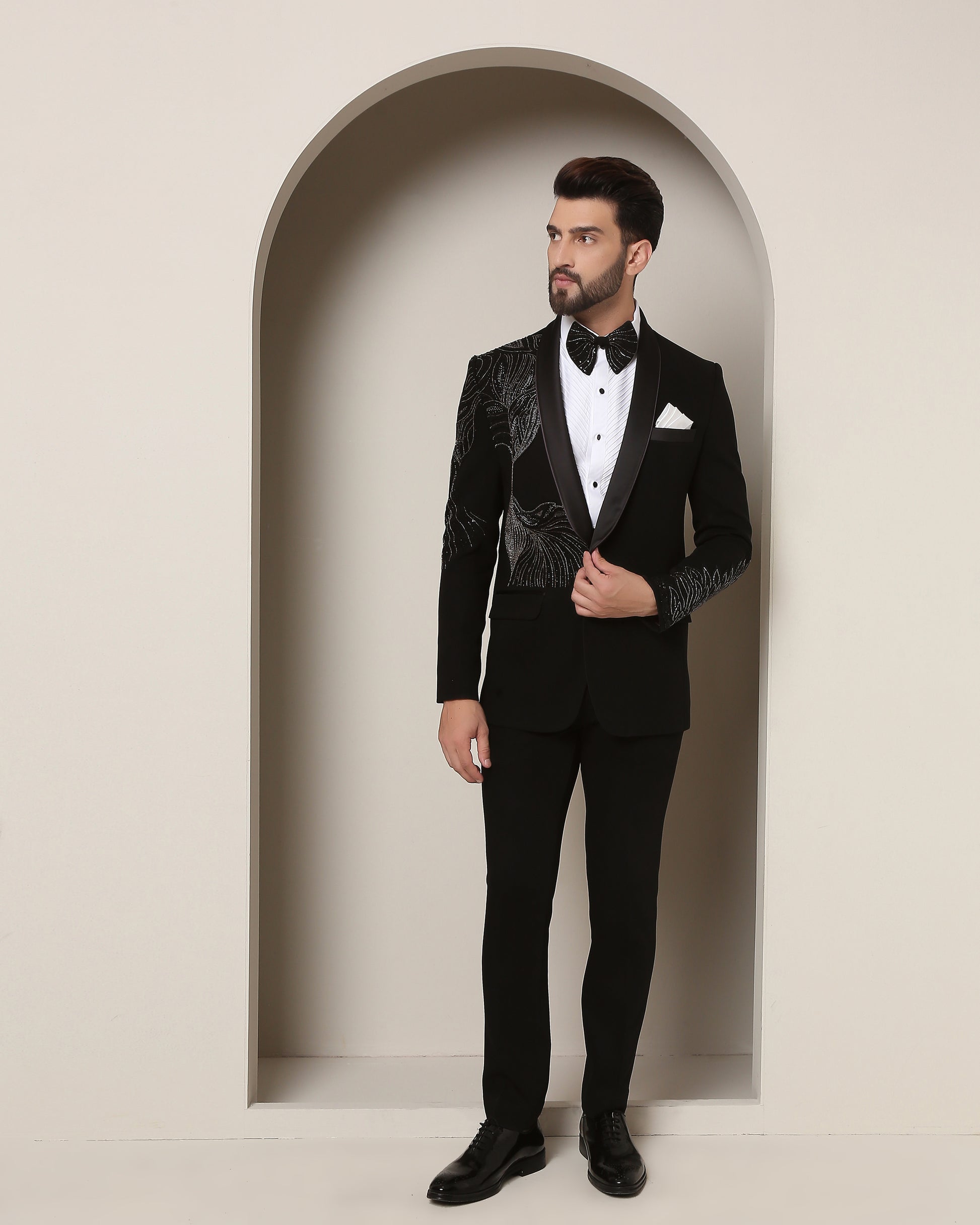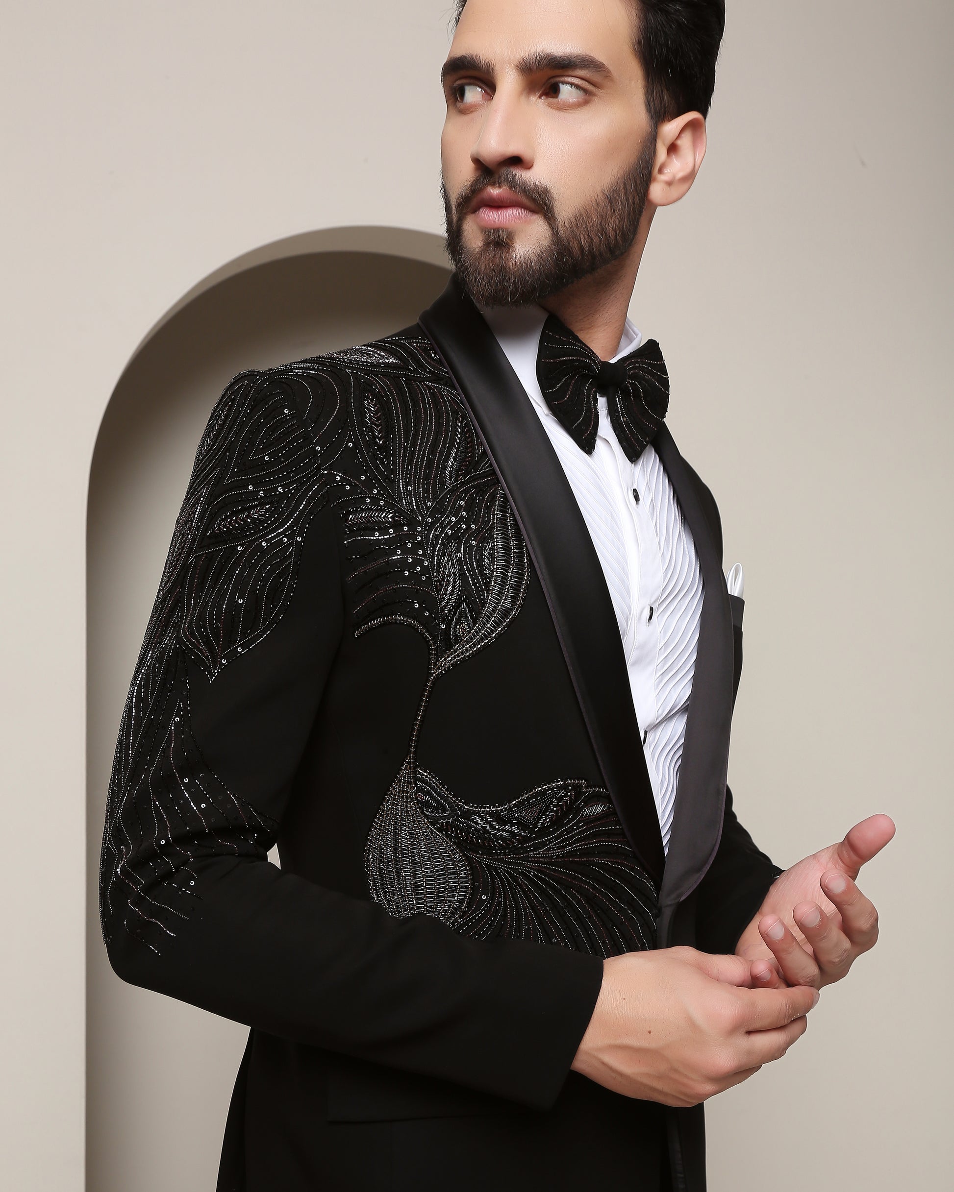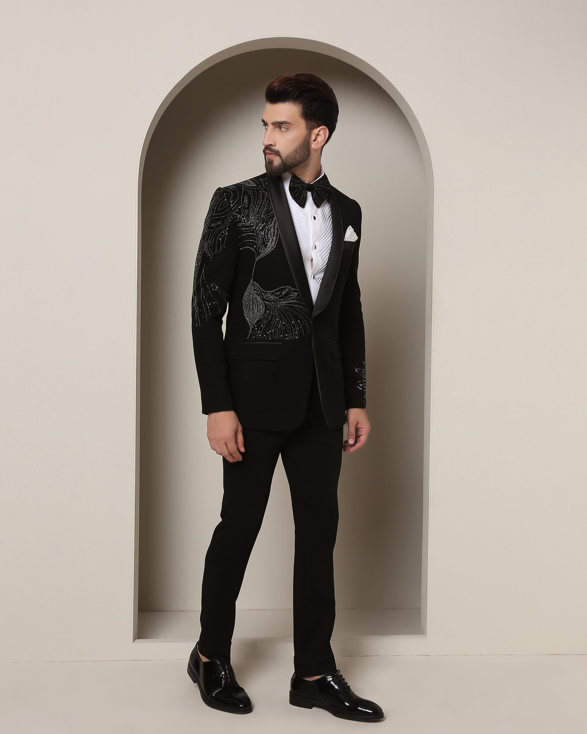 Black tuxedo, satin collar, adorned with embracing bird motifs. Intricate wings on sleeves echo the one ness of love—a masterpiece for special occasions."