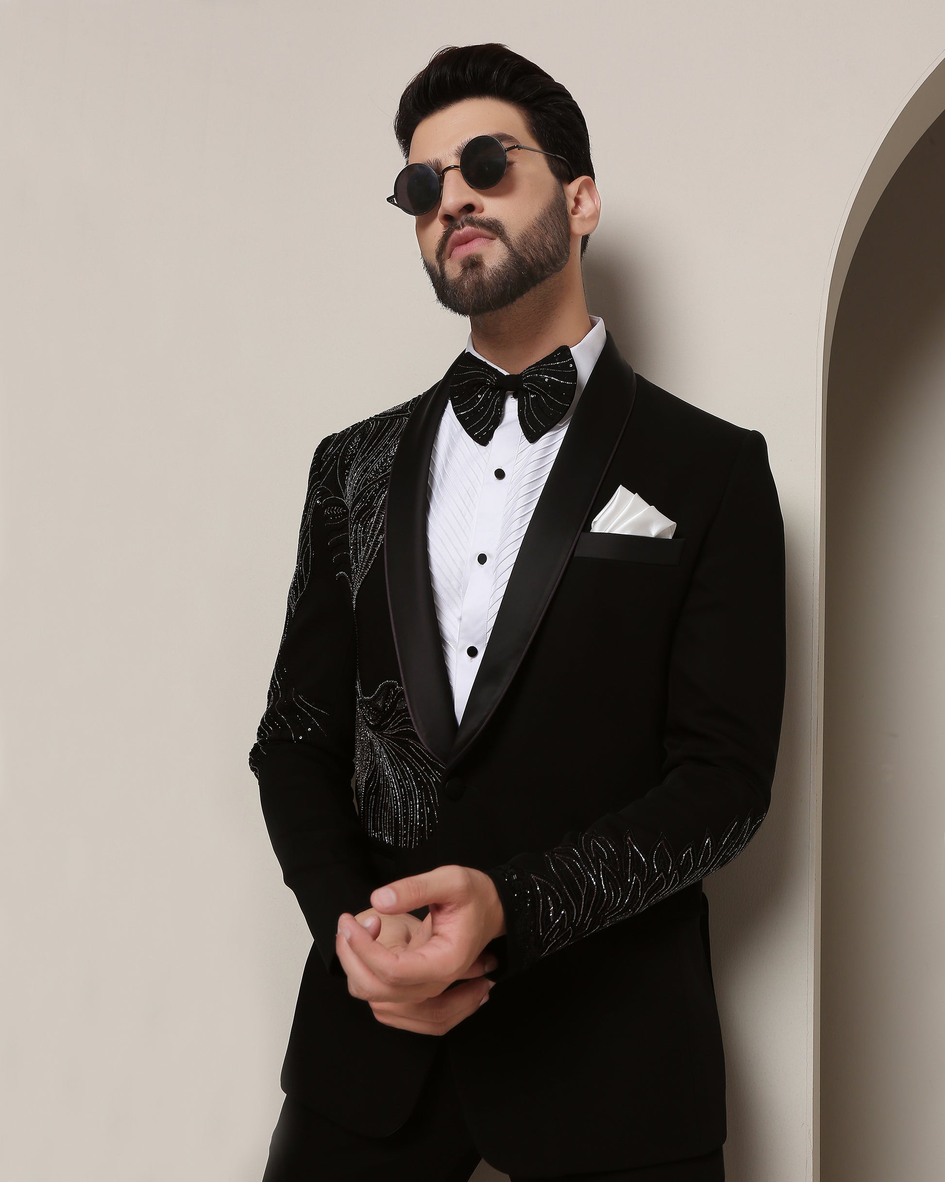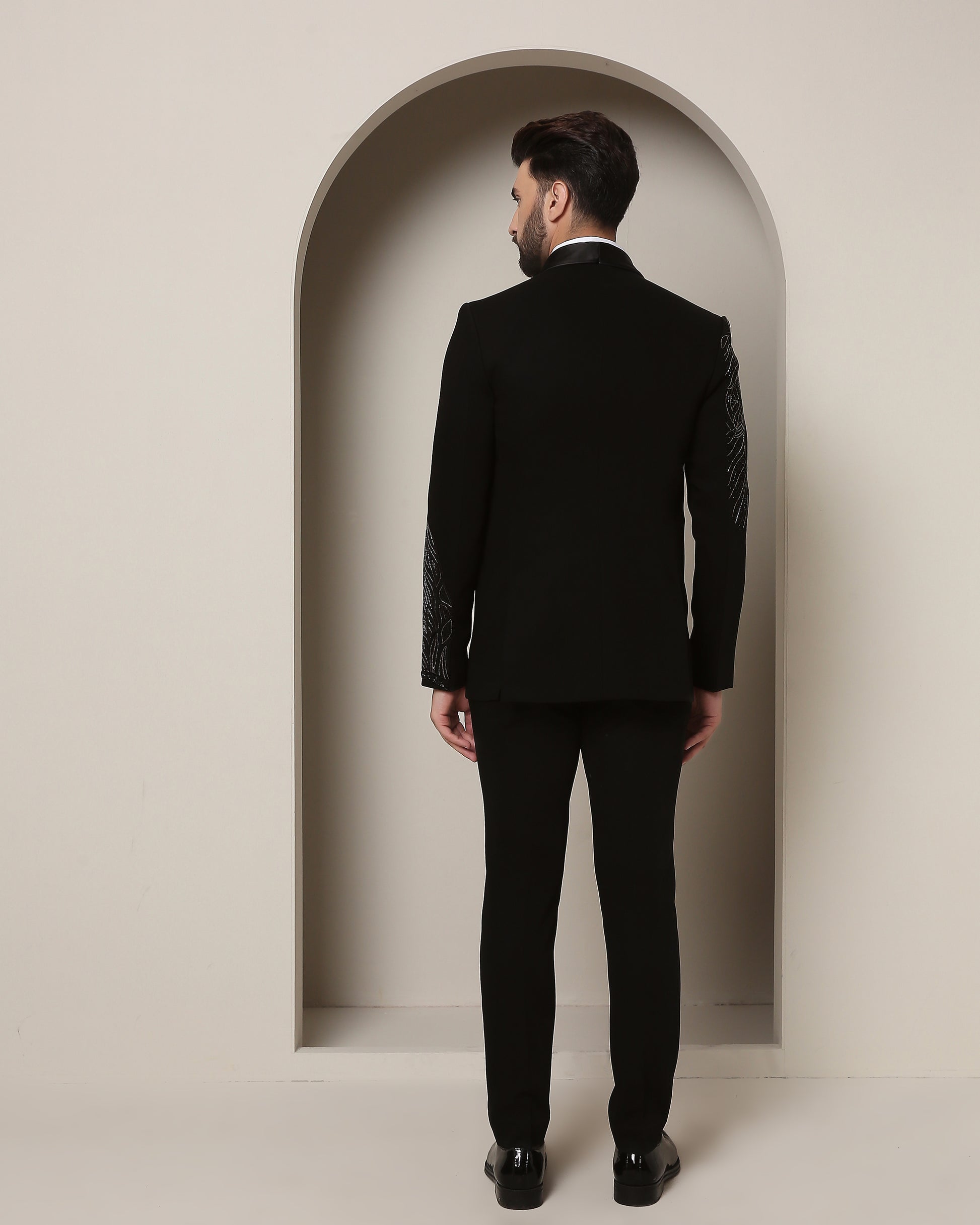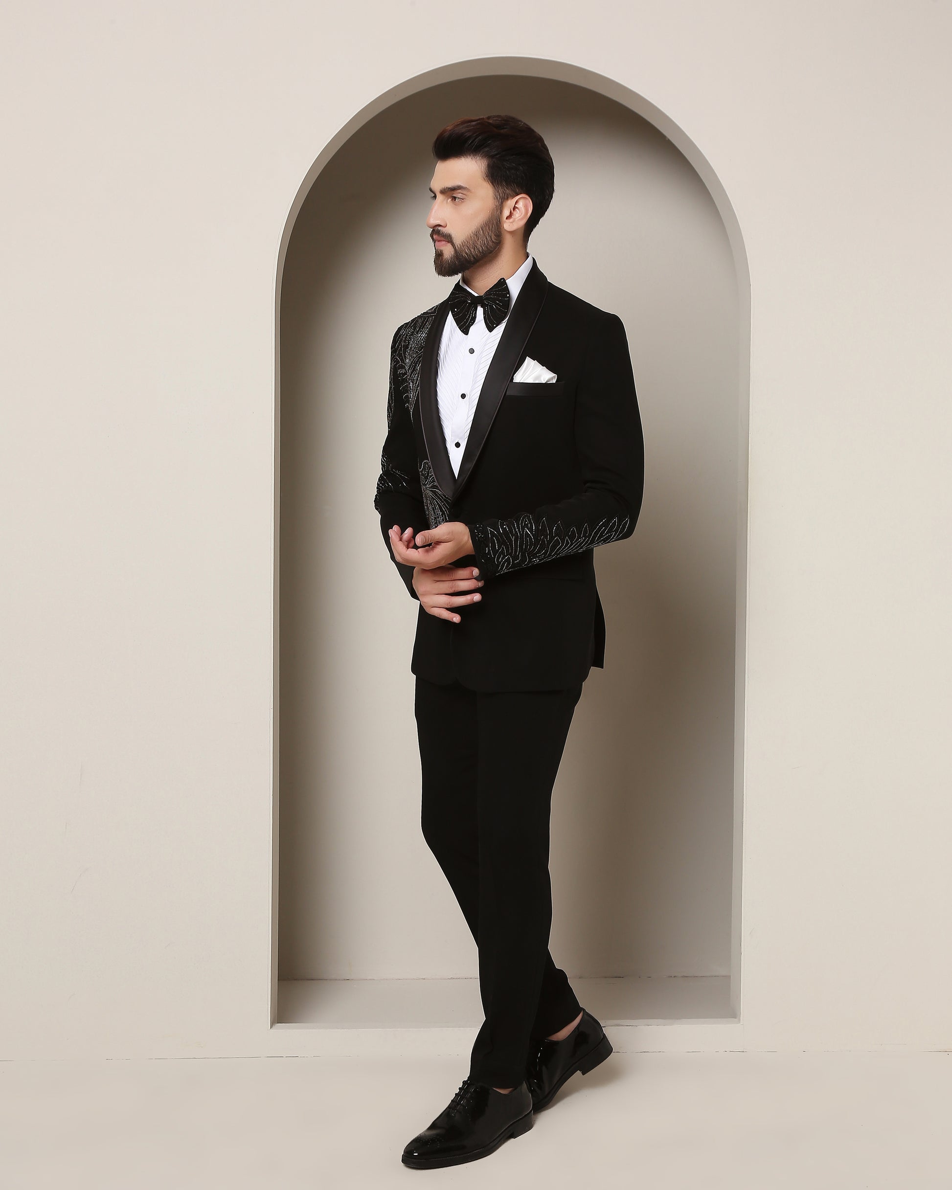 Black tuxedo, satin collar, adorned with embracing bird motifs. Intricate wings on sleeves echo the one ness of love—a masterpiece for special occasions."