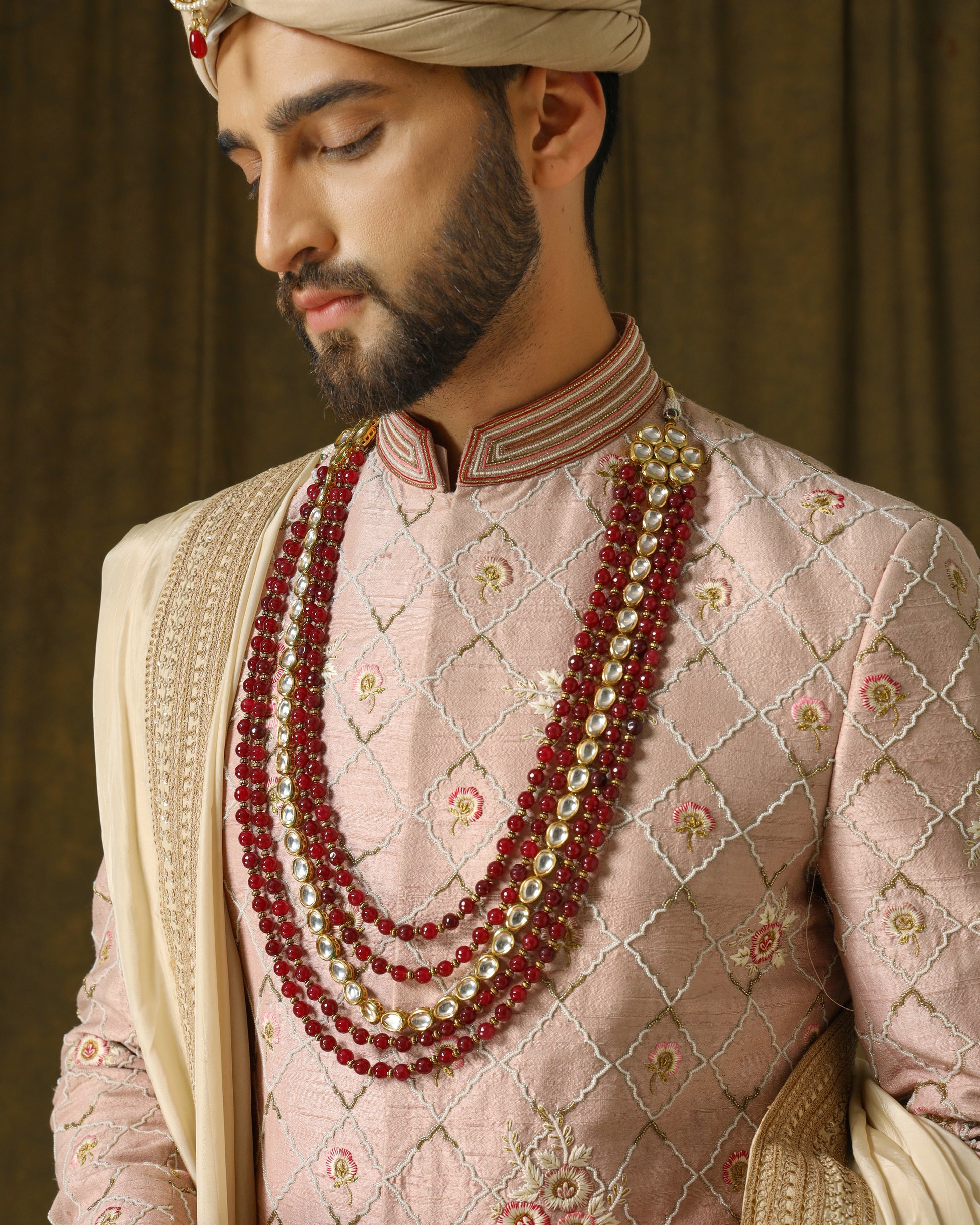 Adorned in celestial elegance, the rose gold sherwani boasts an intricate embroidered jaal adorned with ethereal flowers. Paired with a heavenly gold embroidered dupatta, it epitomizes regal splendor