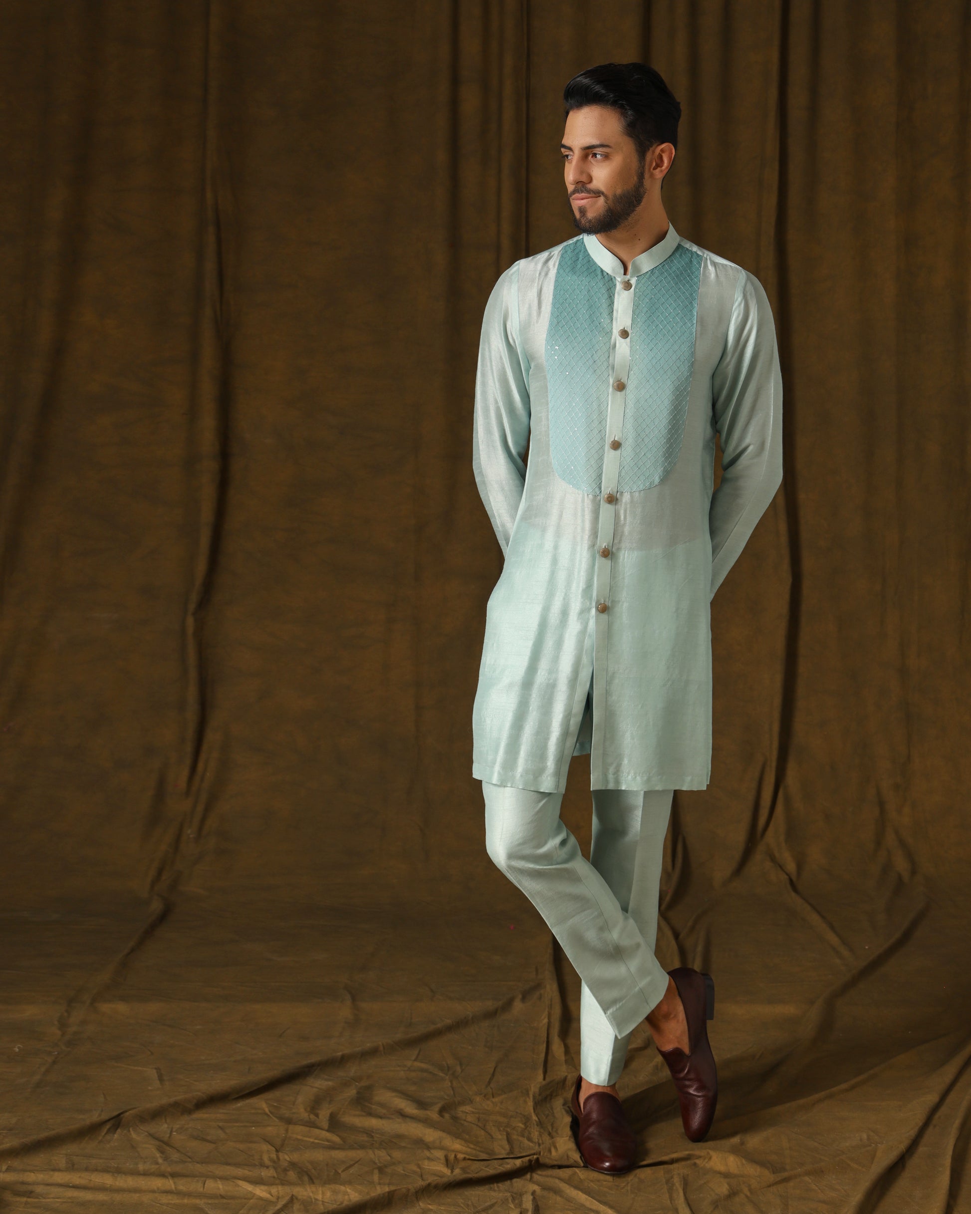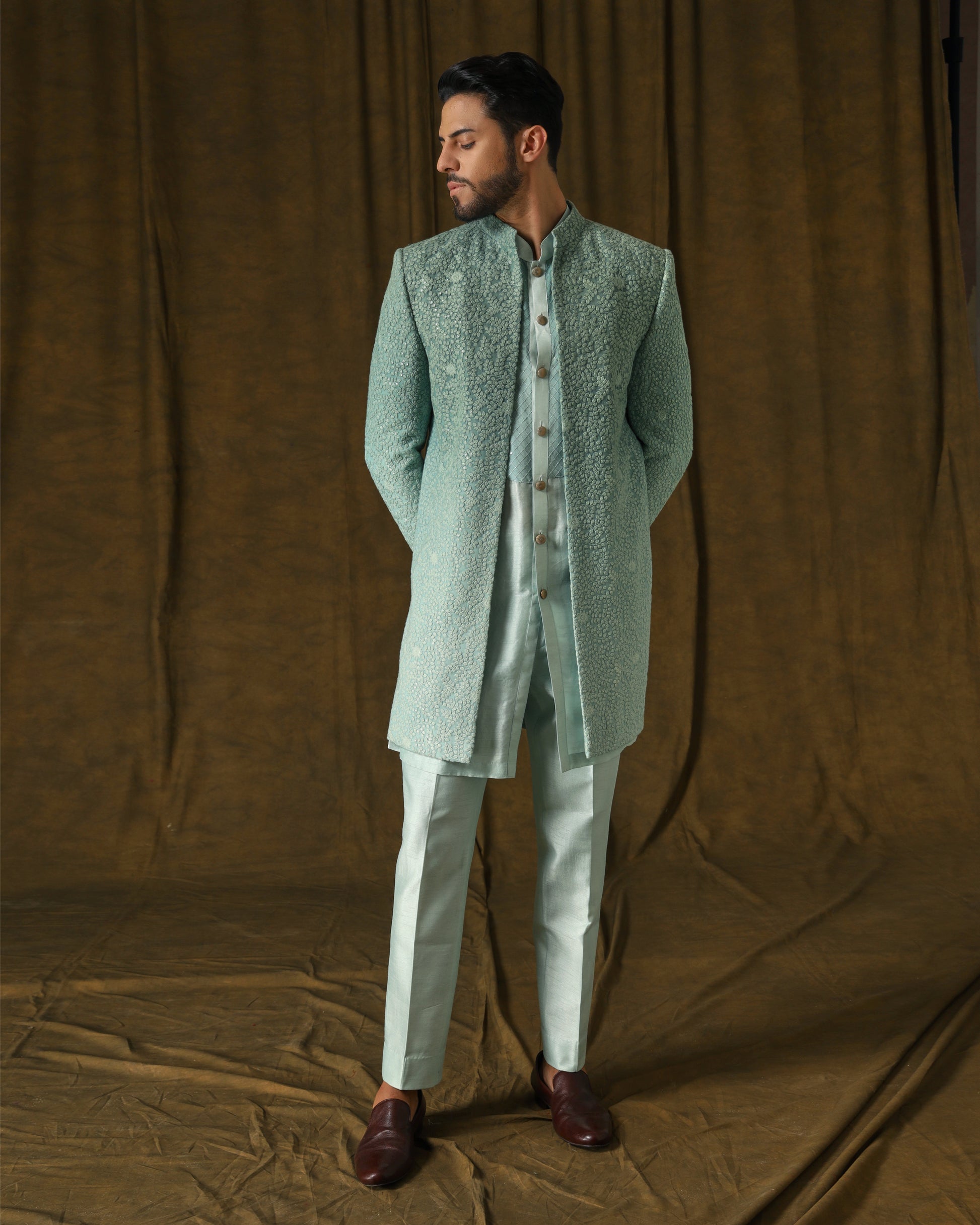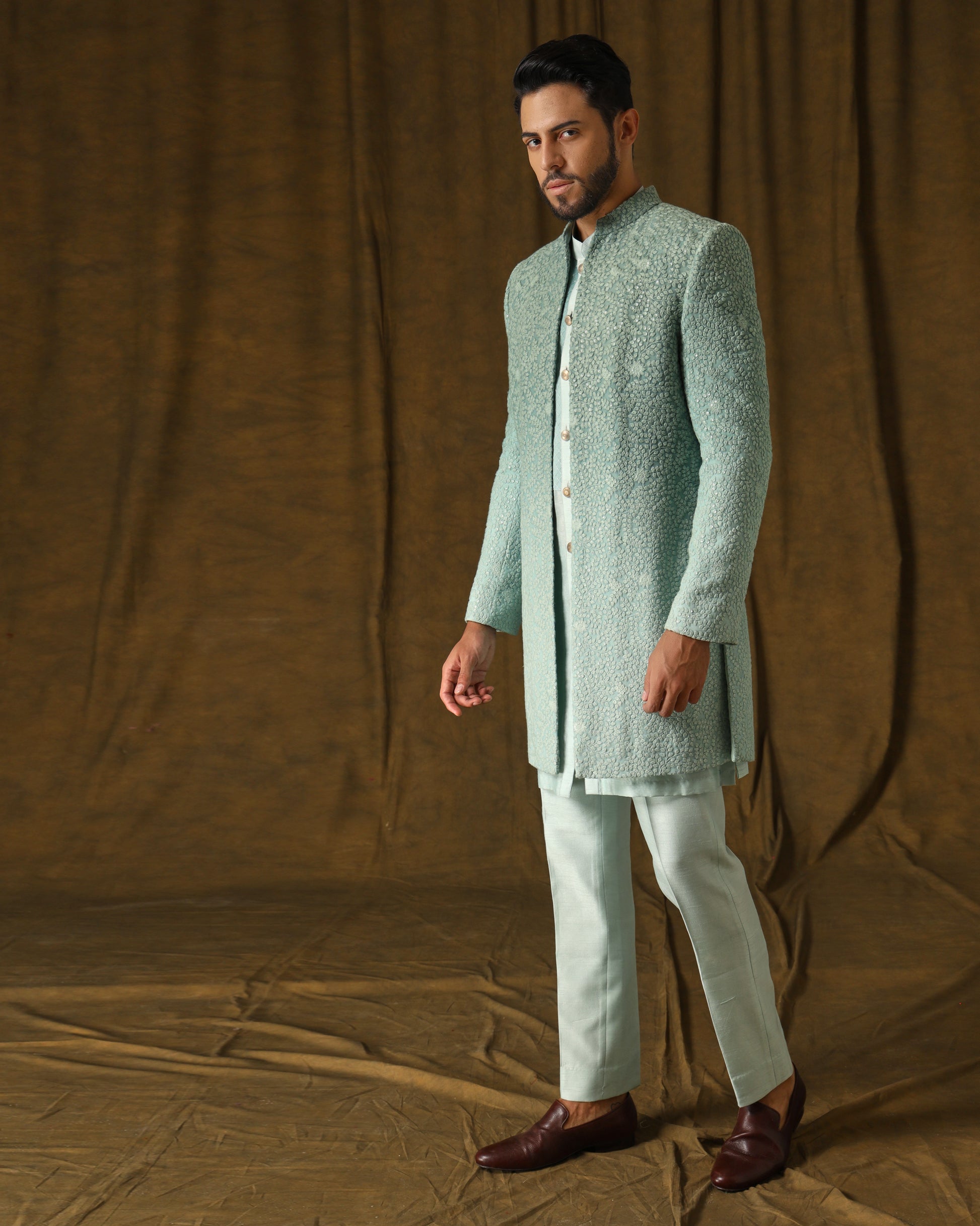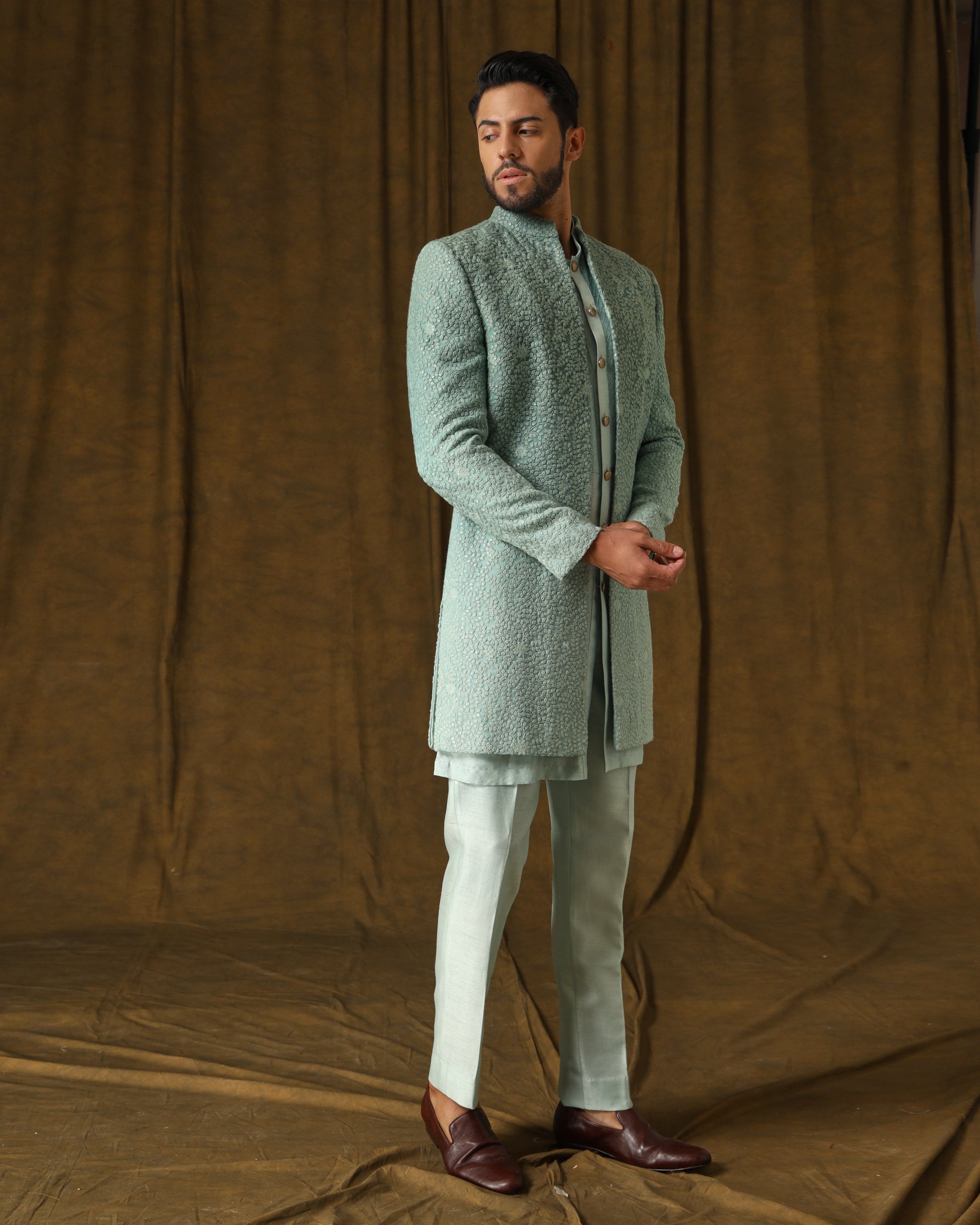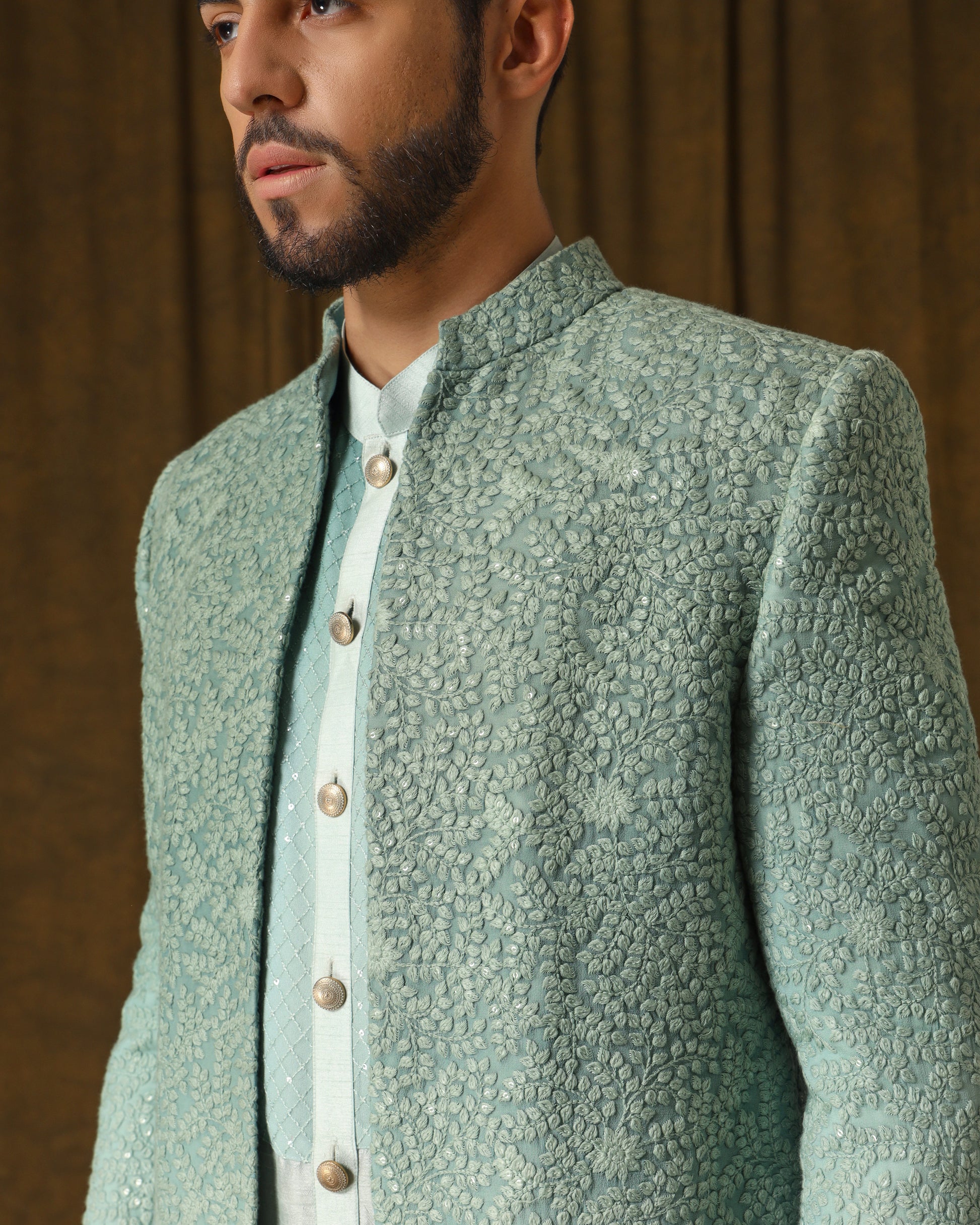 Stylish ombre shrug set, adorned with intricate embroidery in gradient shades of cool green. Complemented by matching trousers and open kurta with elegant metal buttons
