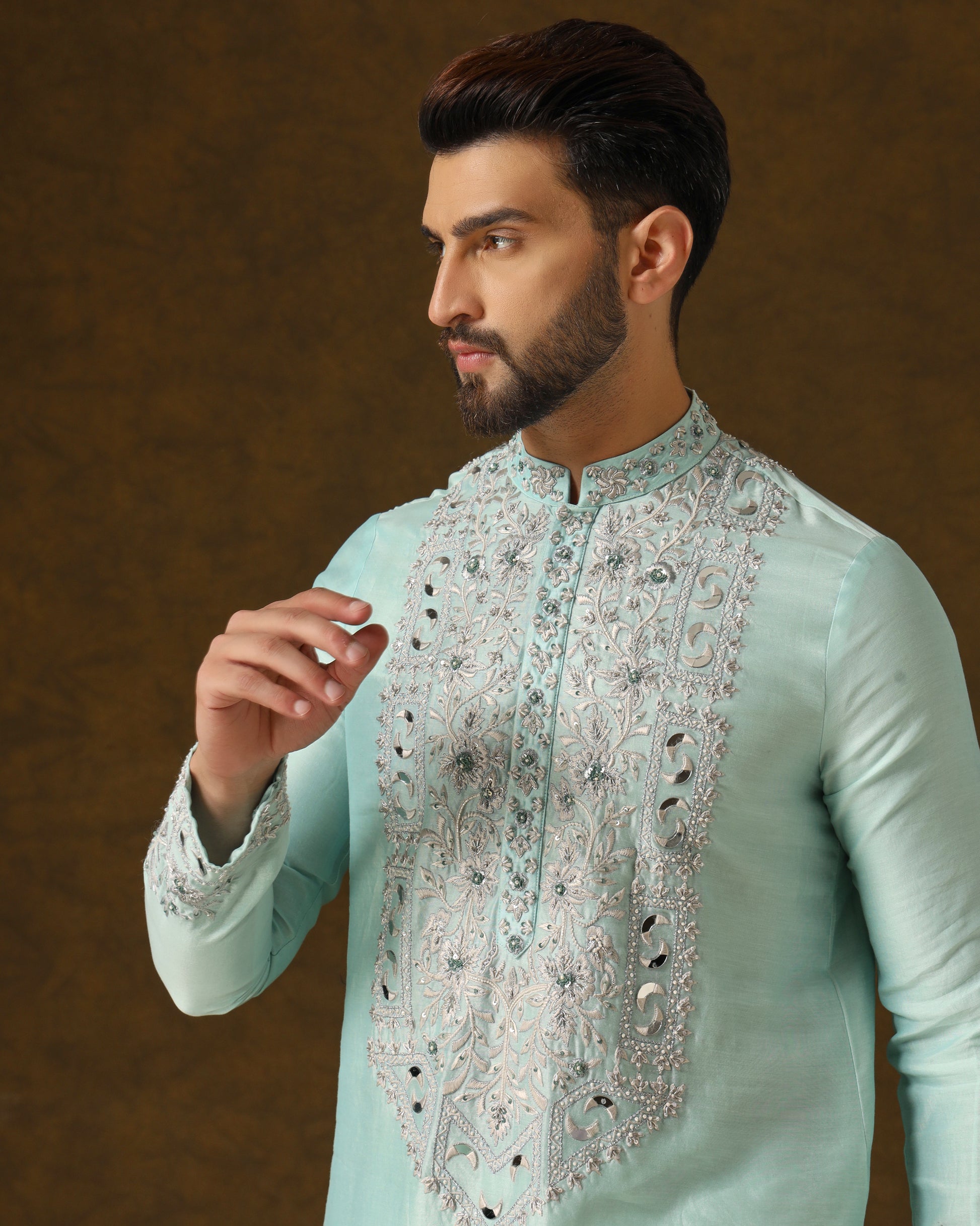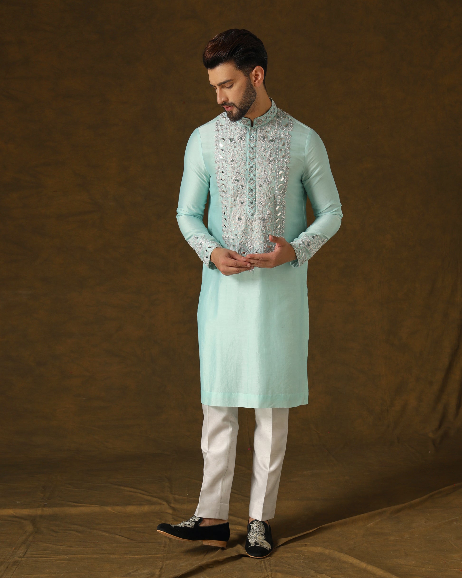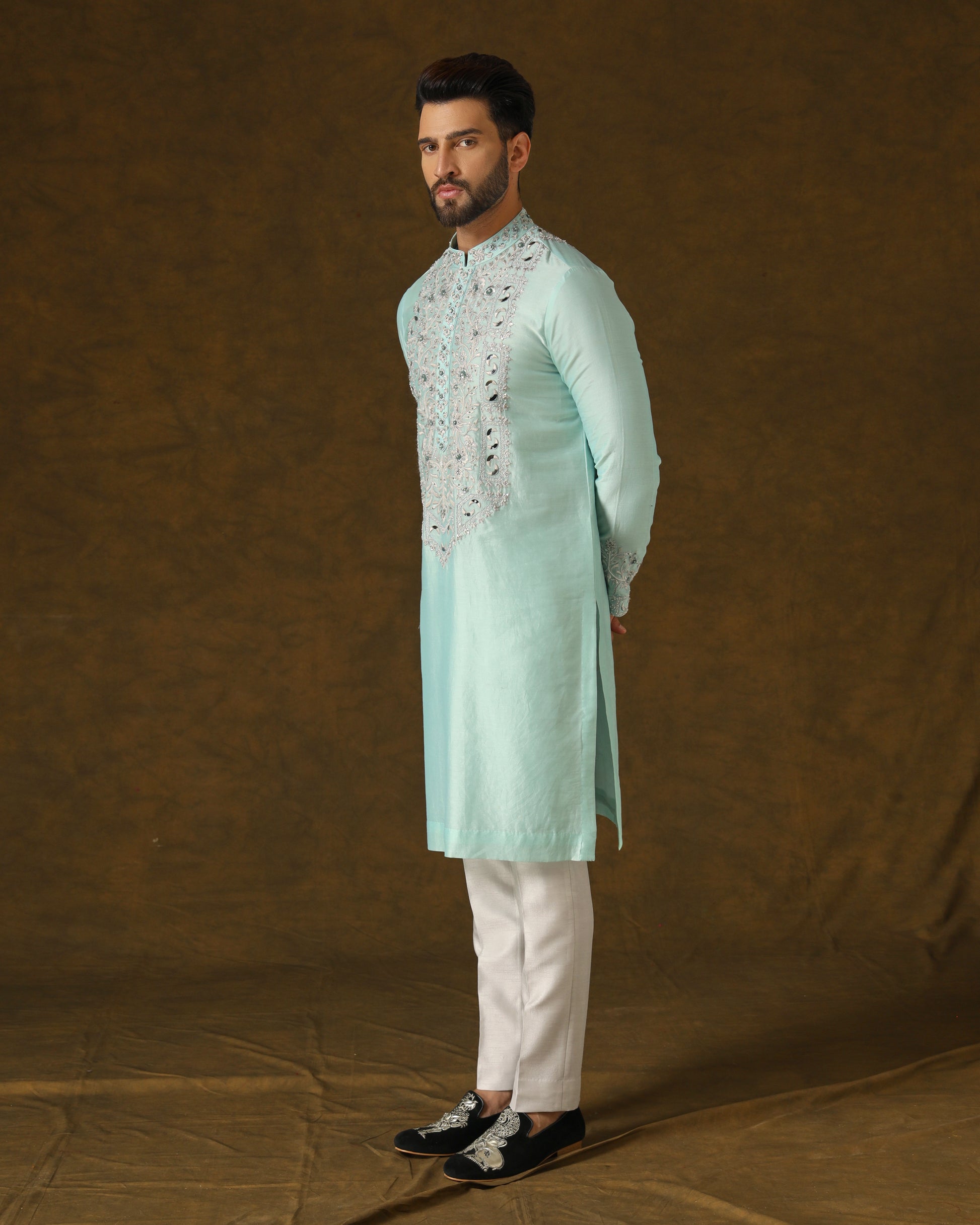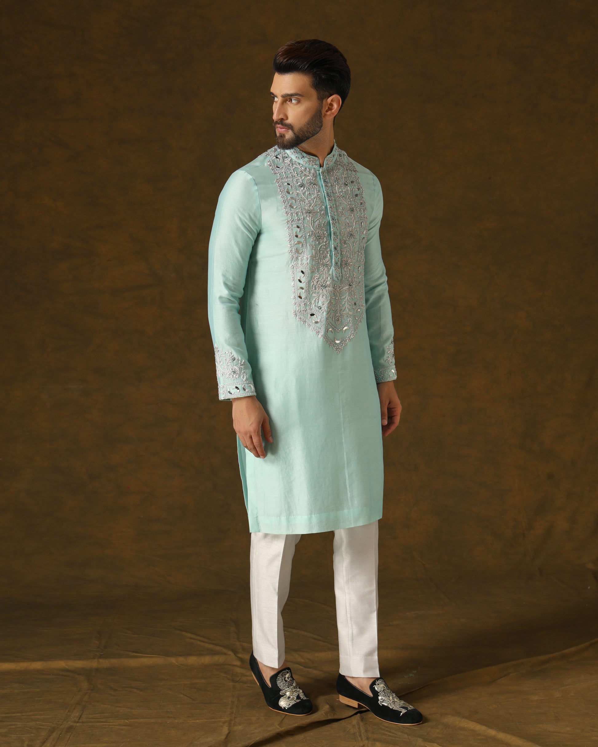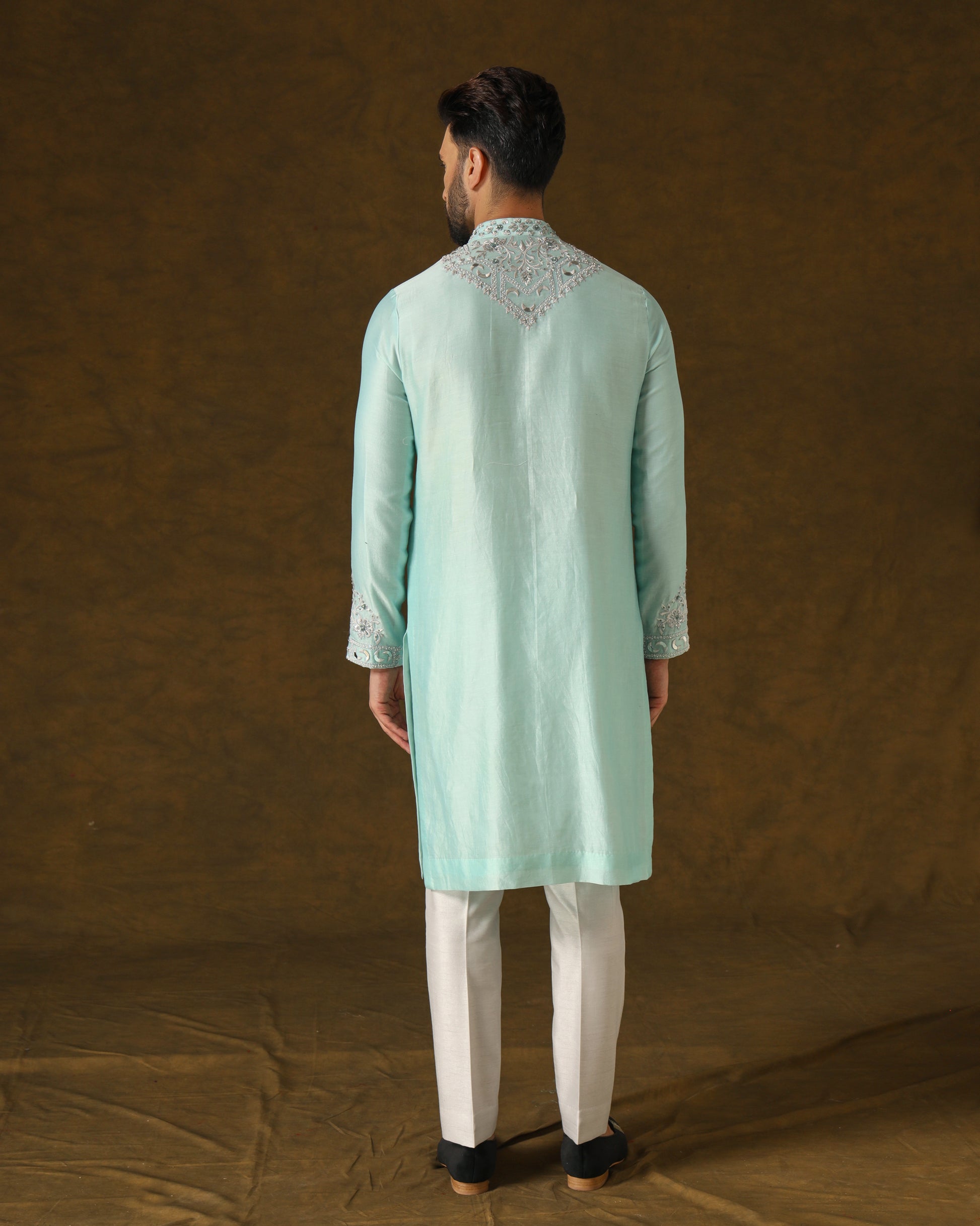 Serene sky blue handwoven kurta, adorned with intricate light grey silver thread and zardozi embroidery on front, back, and sleeves. Paired harmoniously with understated light grey dress trousers.