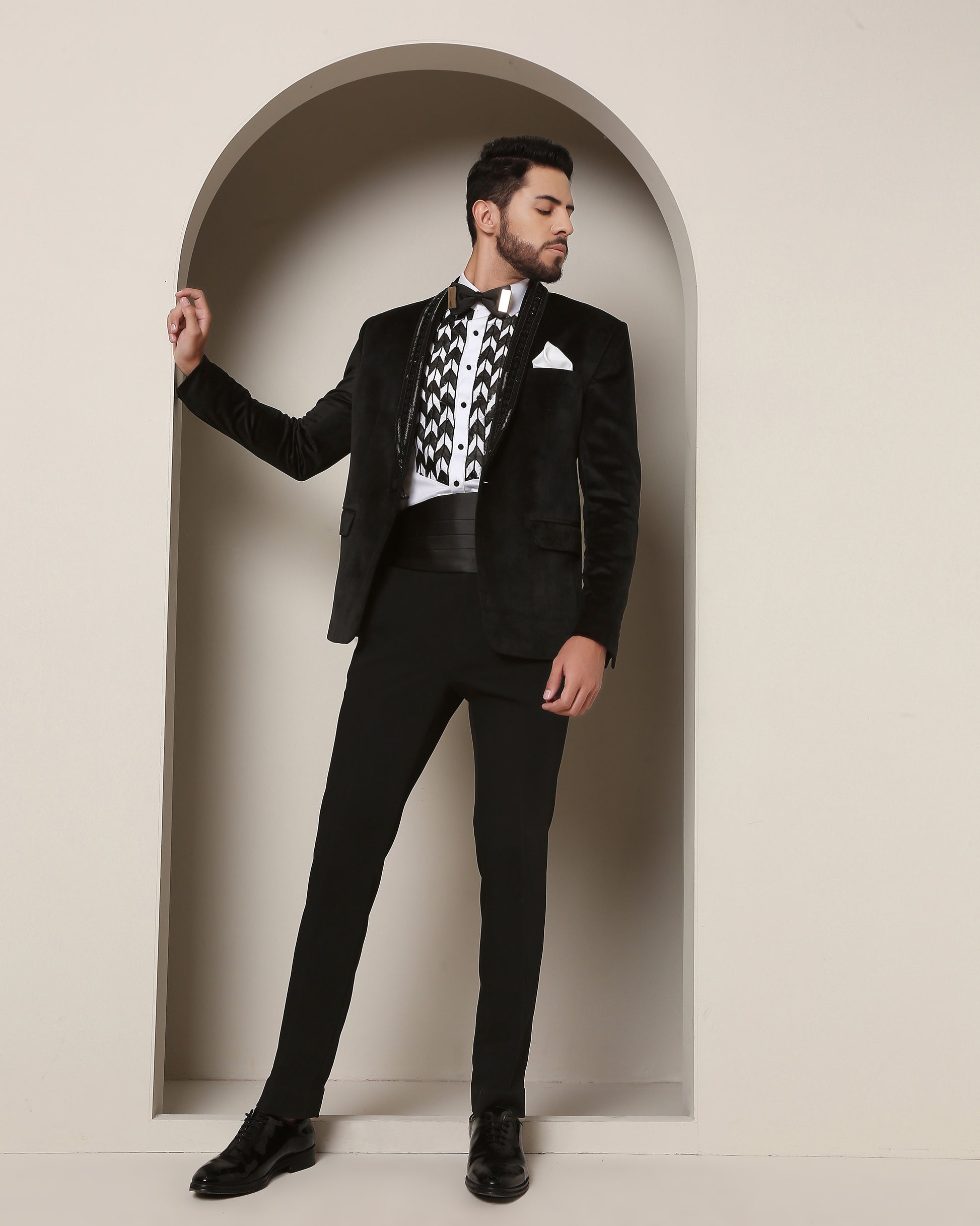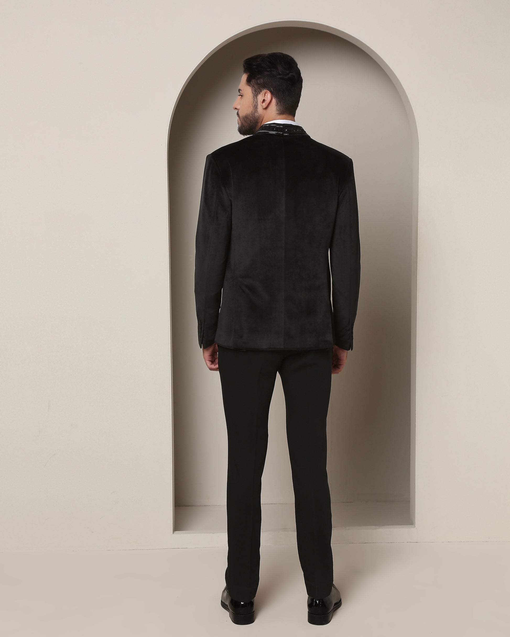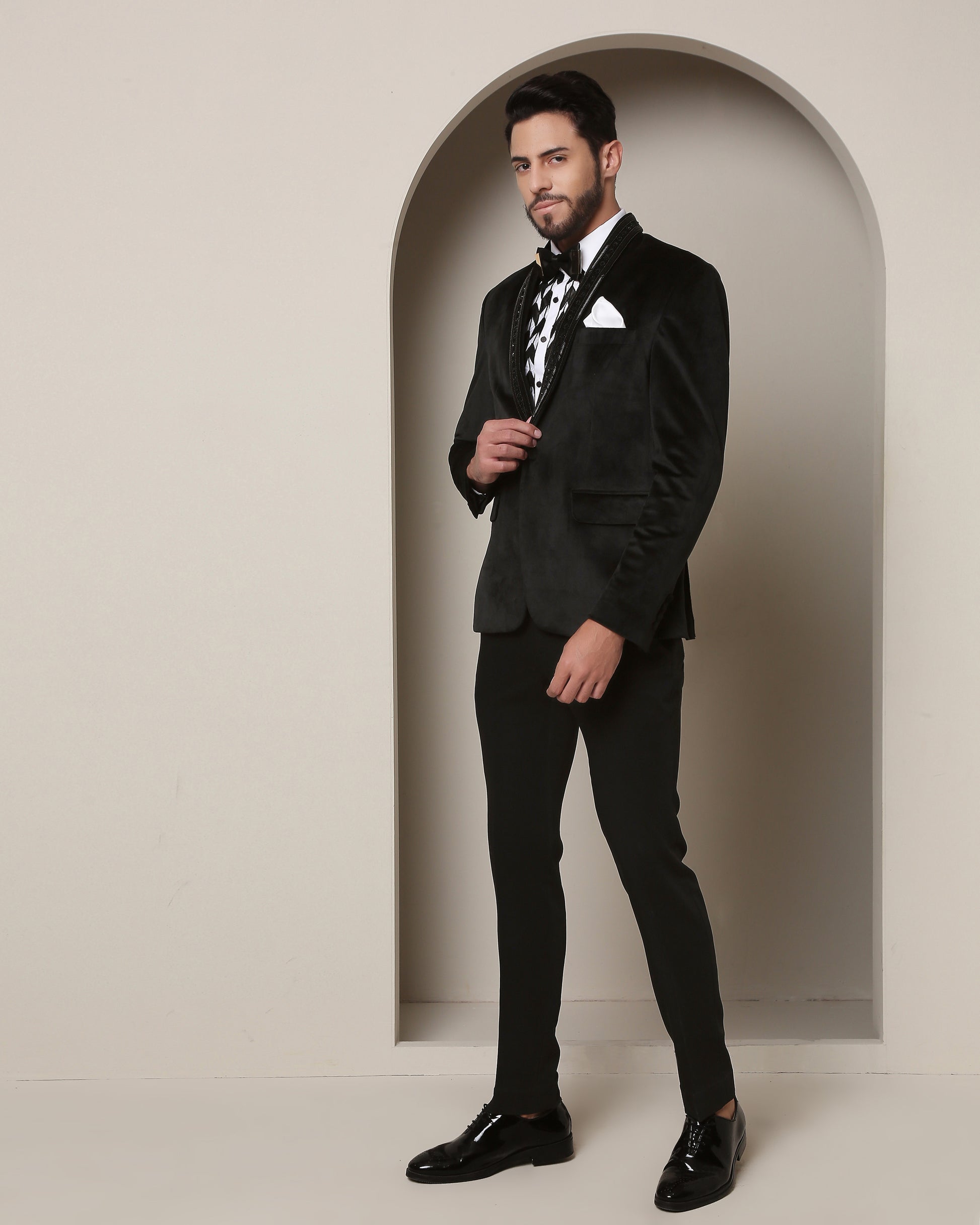 Luxurious black velvet dinner jacket, adorned with embellished shawl collar. Paired elegantly with matching cigarette trousers for a timeless and sophisticated ensemble."