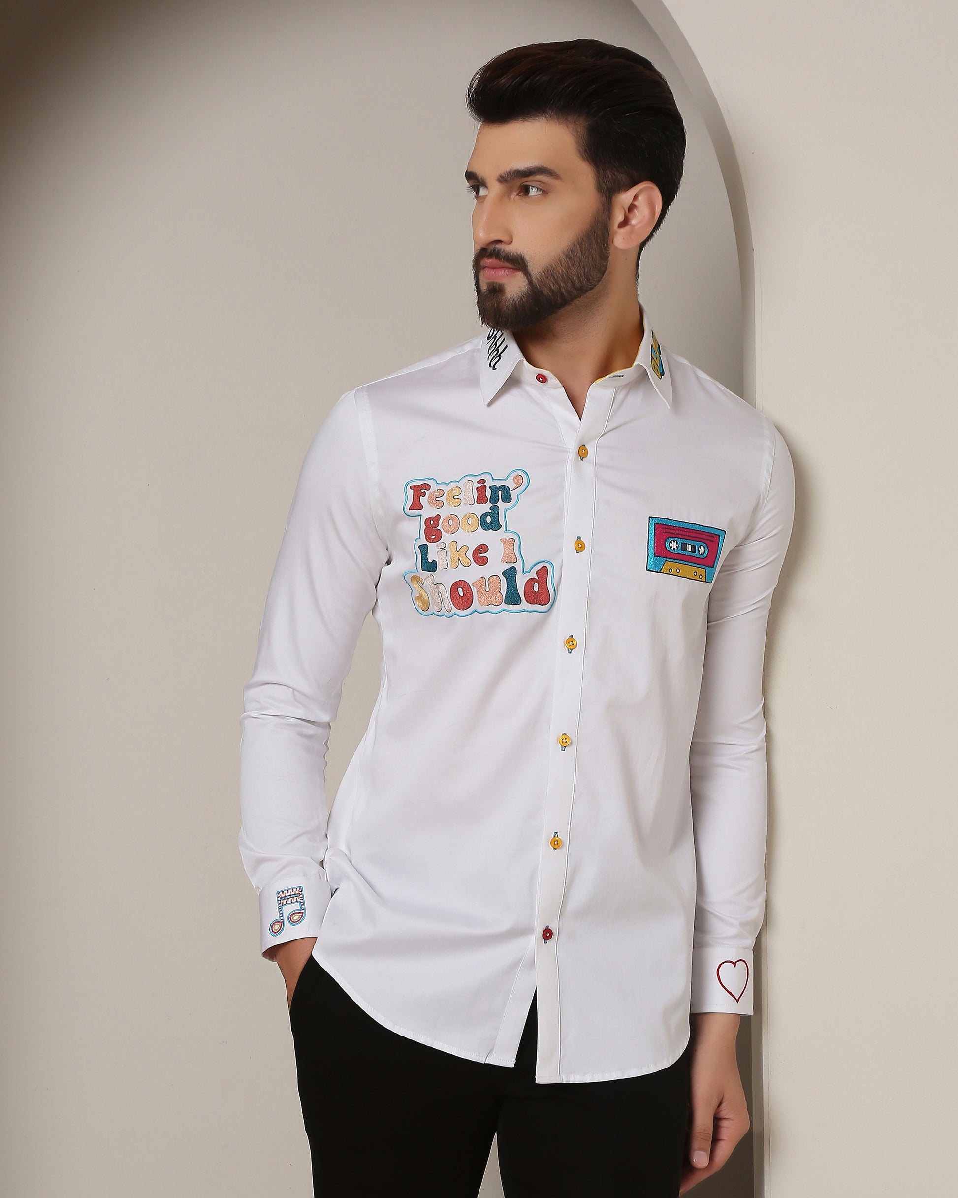 Celebrating vintage music lovers. Collar flourishes hearts, music symbols; 'shhhhh,' 'bla blah' tales. Trippy smiley on back embodies serene musical infatuation.